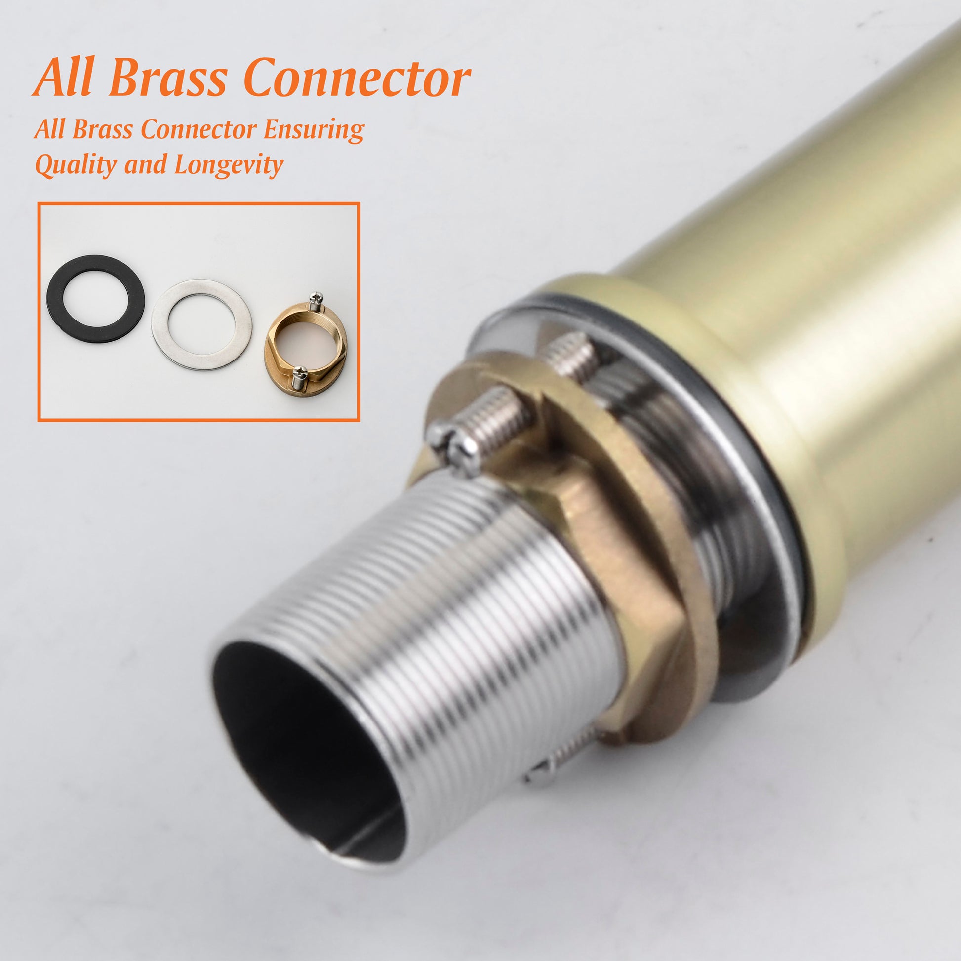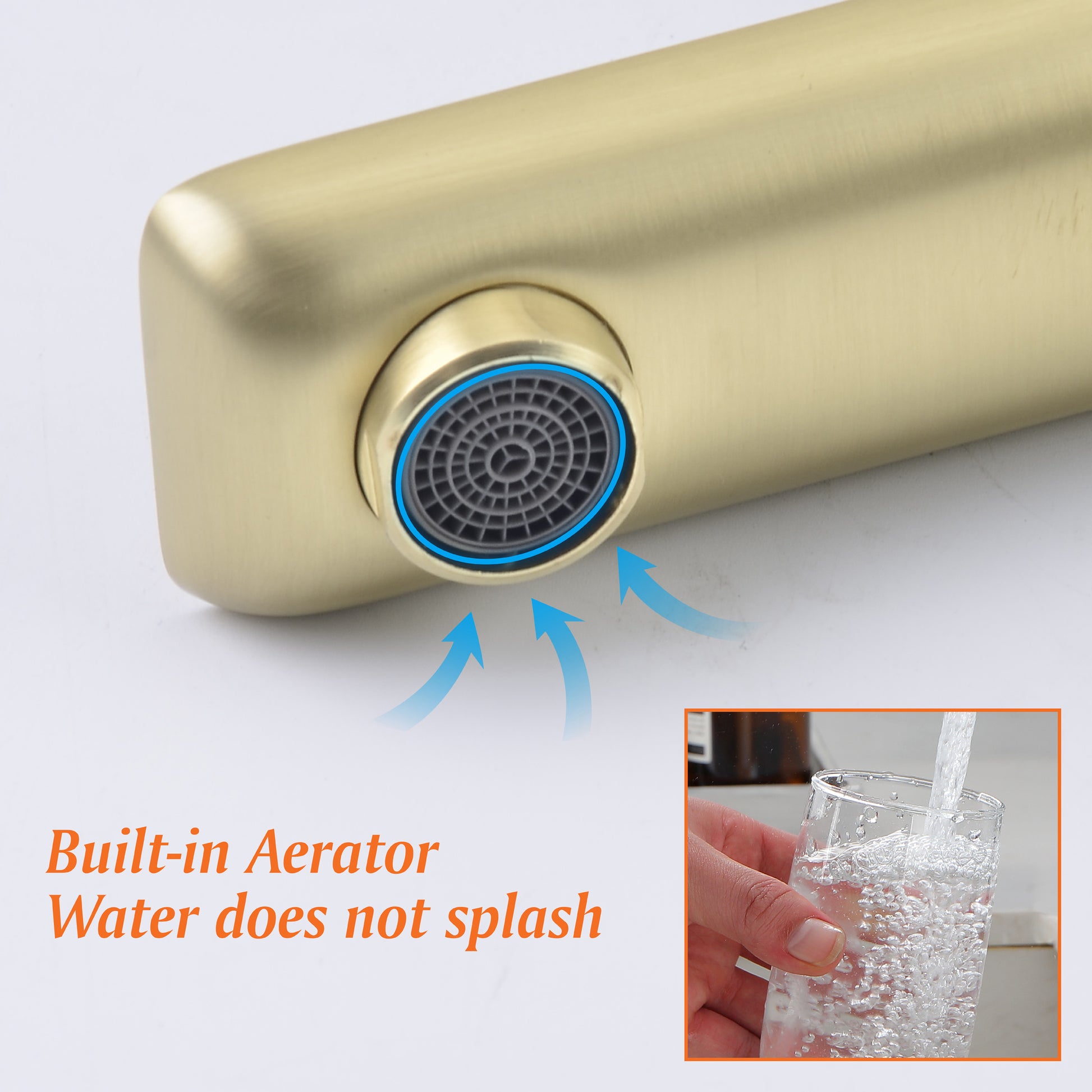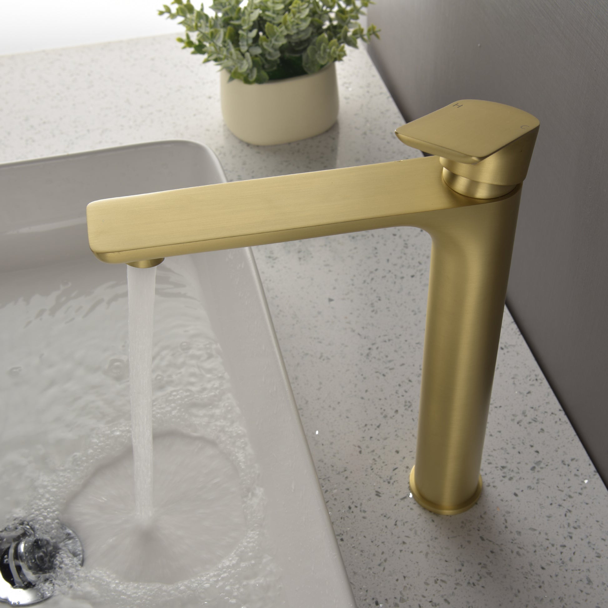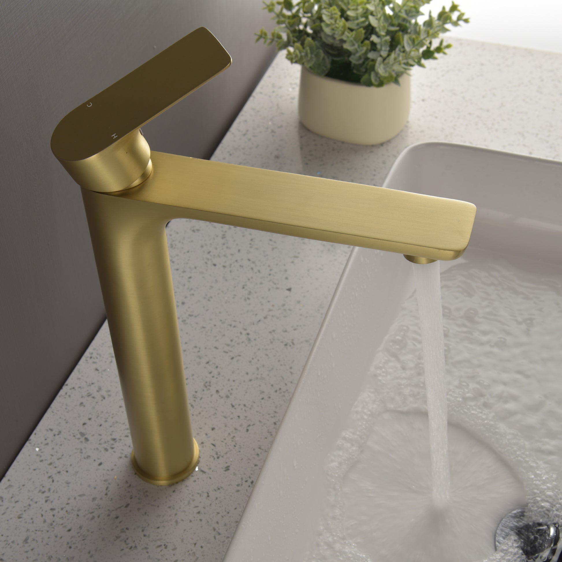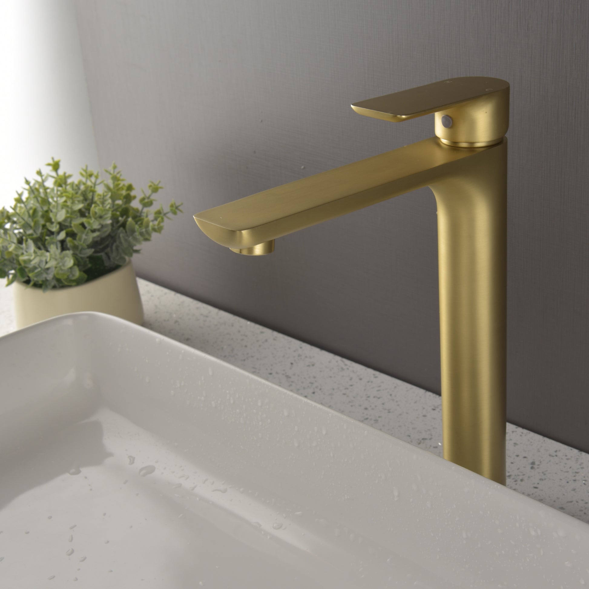 Featuring a unique brushed gold surface with sealing glaze and anti-fingerprint treatment, this tall bathroom faucet adds elegance and style to your bathroom décor. The spout with a built-in aerator provides a soft, splash-free water flow for daily comfort. The single lever handle is marked with hot on the left and cold on the right, making temperature adjustment simple and convenient. Equipped with a cUPC certified cartridge, it ensures durability even after repeated opening and closing, effectively extending the service life of the product. The package includes a 60 cm cUPC certified water supply hose for safe use, along with the necessary mounting hardware, allowing you to complete installation easily without a plumber.