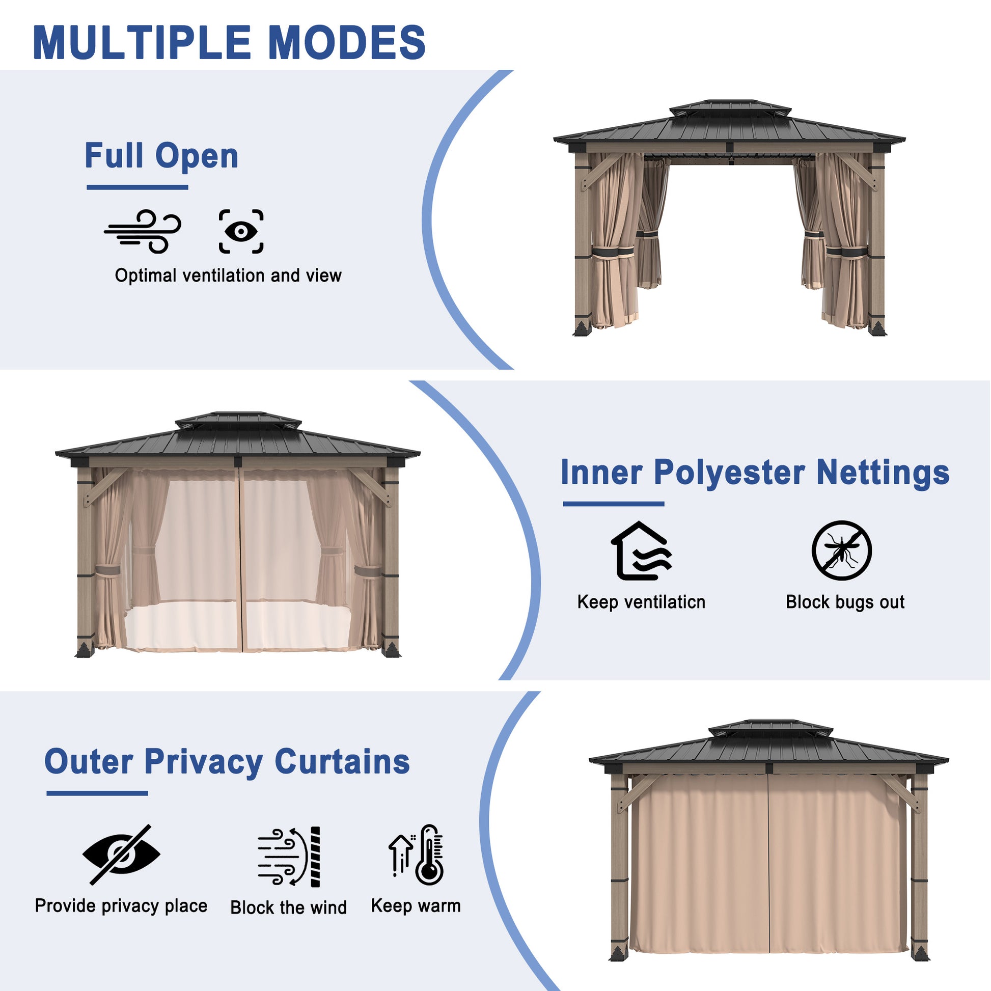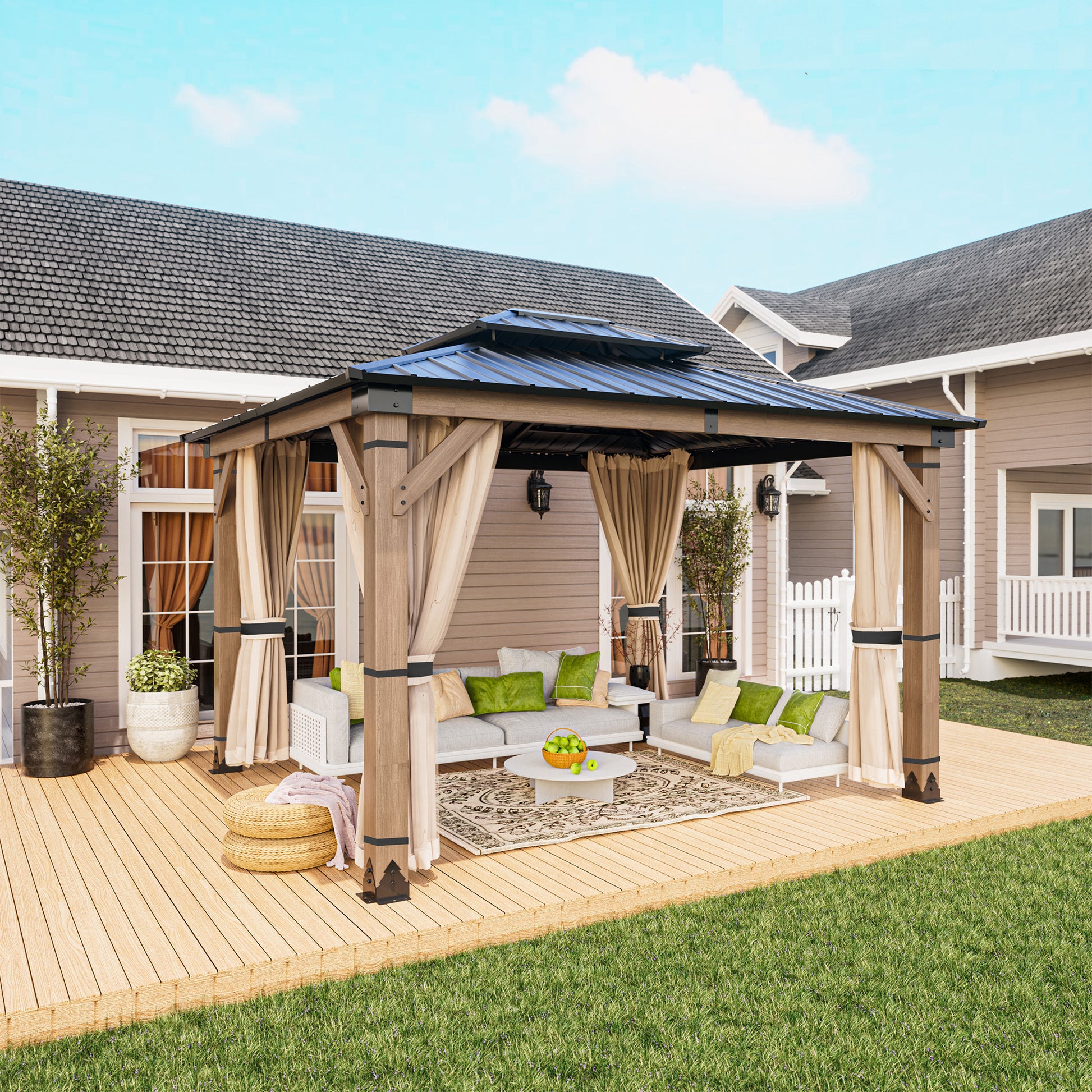 This 12' x 10' Mondawe gazebo creates the perfect outdoor setting for any time of the year. Enjoy gatherings outside in all seasons under a solid cedar wood frame, and the sturdy fade- and rust-resistant galvanized steel canopy will stand the test of time.
