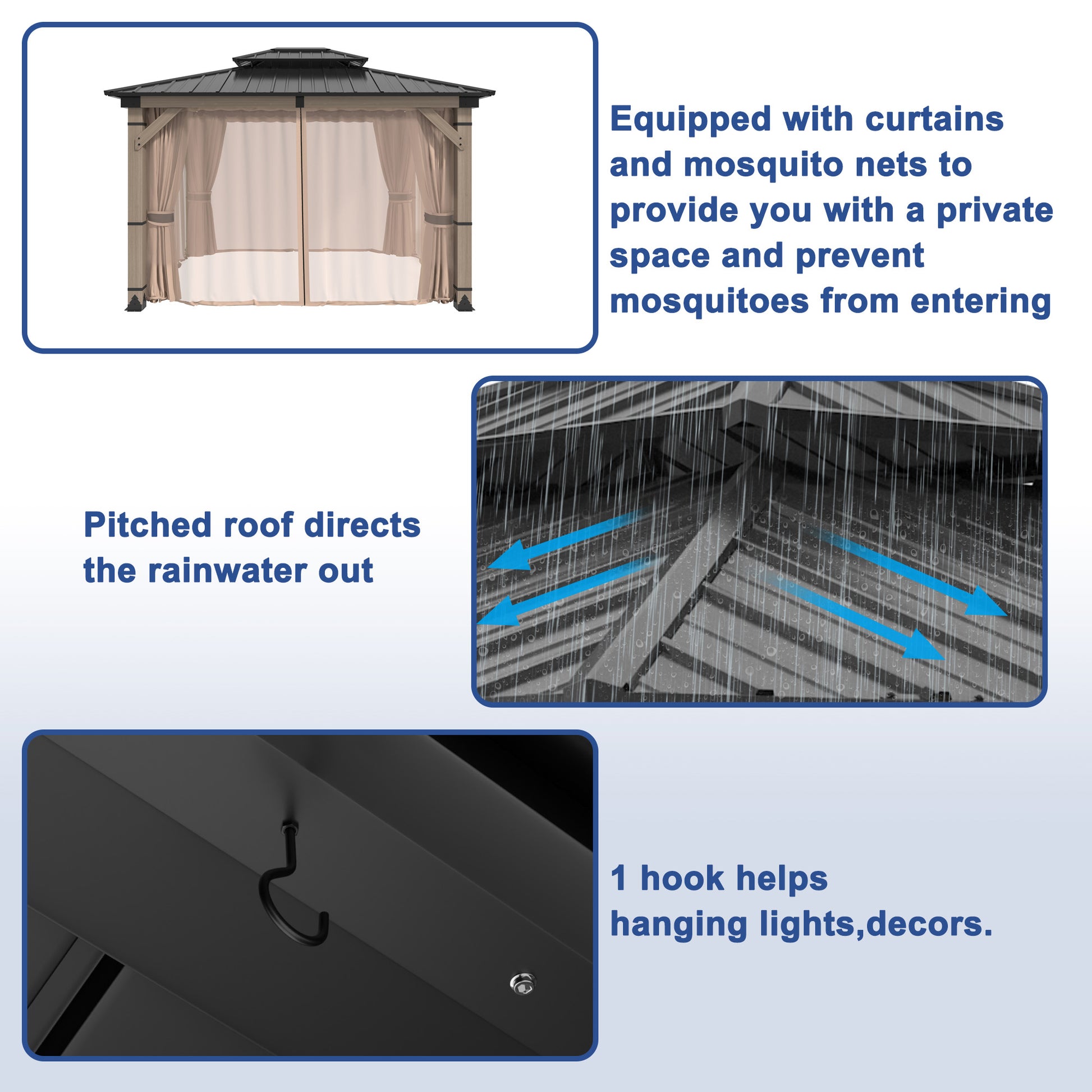 Spacious Gazebo This 10x12 ft double-roof gazebo offers 120 sq ft of roomy space to accommodate 6-8 people