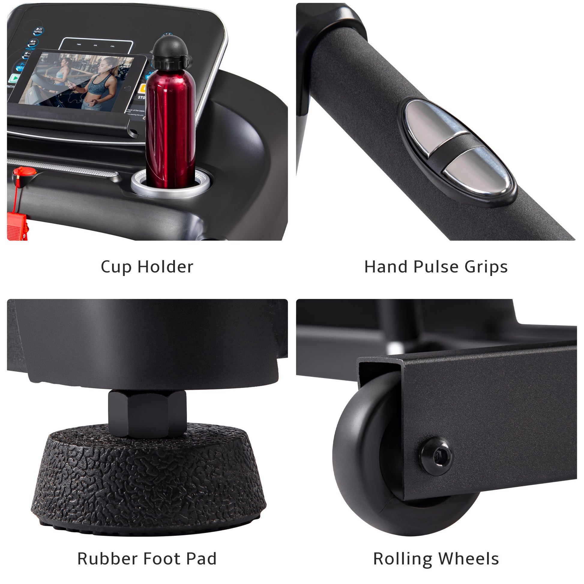 - Multi-layer tread belt that's offers springy feel and keeps noise levels down.When you're done with your workout, you can easily fold the treadmill up and roll it out