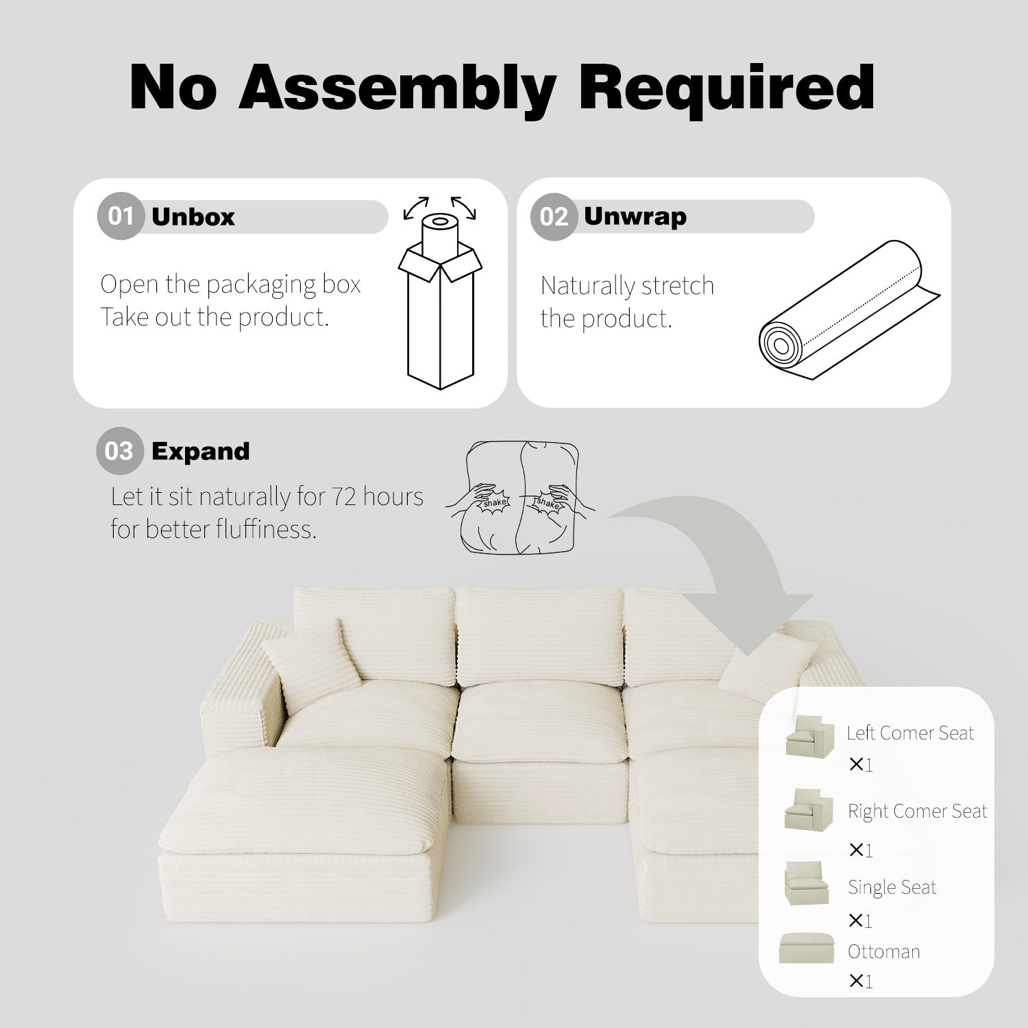 This 108 inch cloud sectional sofa brings modern modular flexibility to your home with its interchangeable L shaped design, allowing the chaise to be positioned on either side to fit different room layouts. Wrapped in soft plush corduroy and built with a dual layer cushion system, it delivers a deep, cloud like seating experience that provides both comfort and support. The no assembly required structure ensures effortless setup simply unpack, allow natural expansion, and enjoy a cozy centerpiece suitable for living rooms, bedrooms, apartments, and multifunctional spaces.