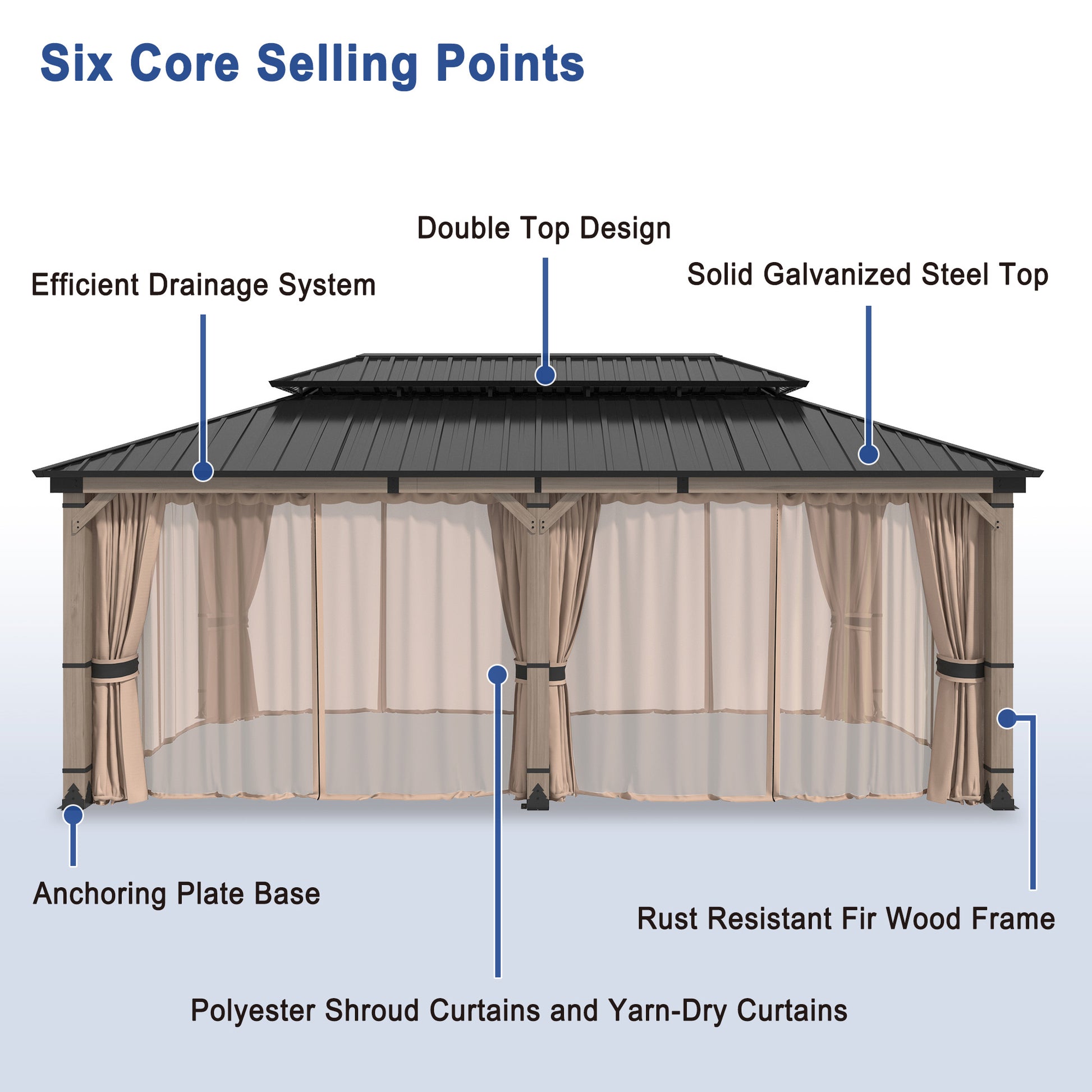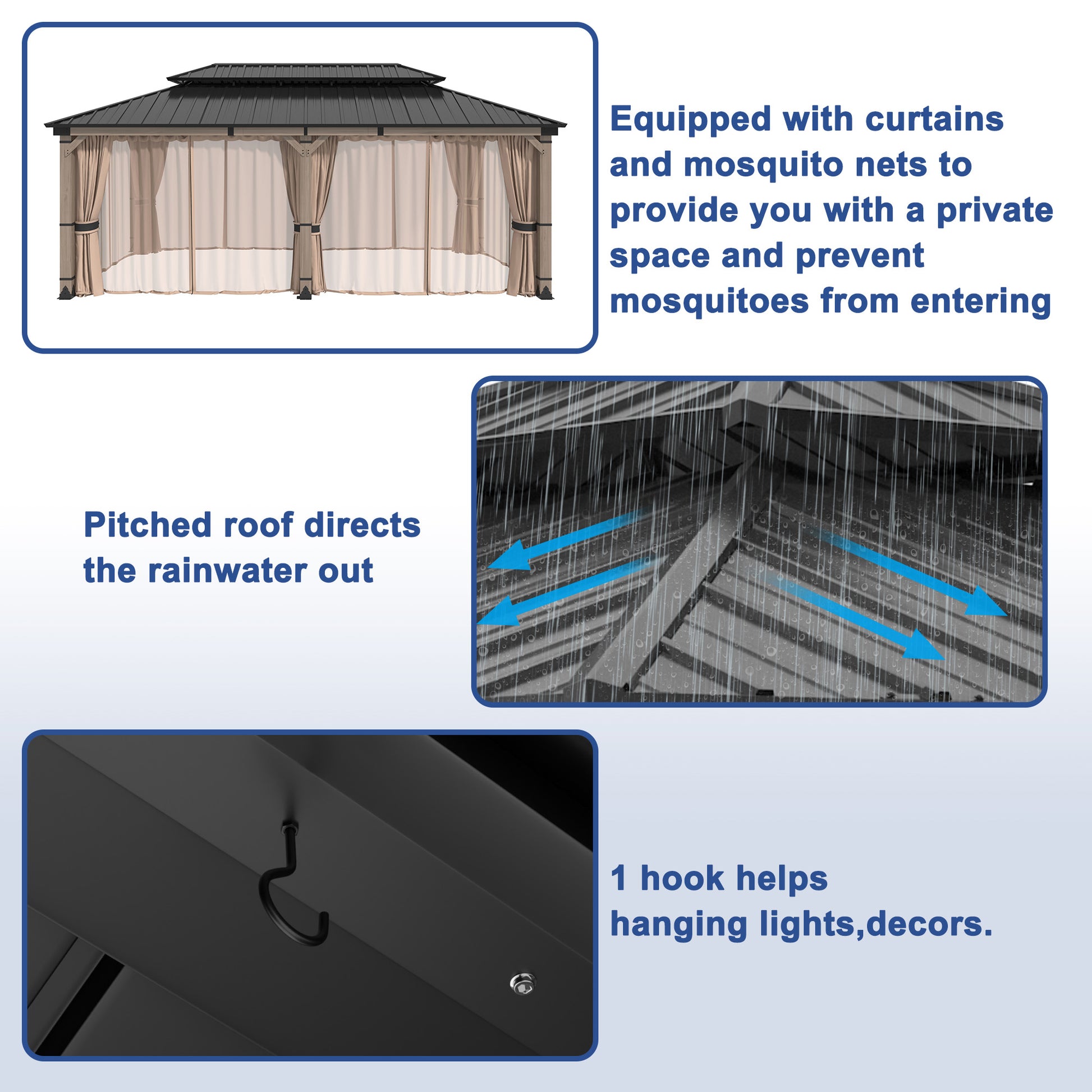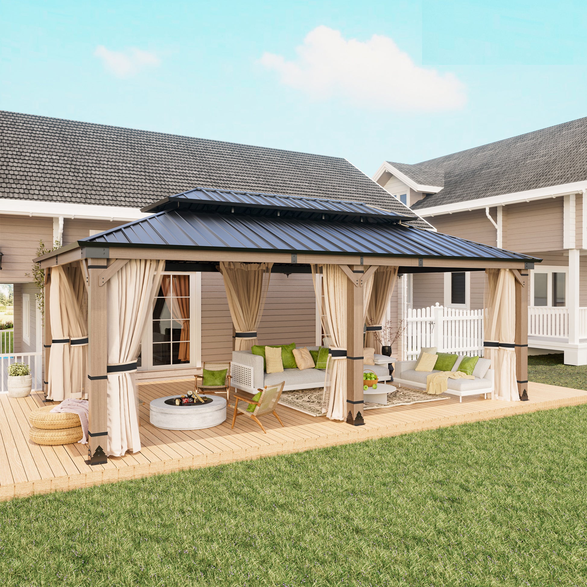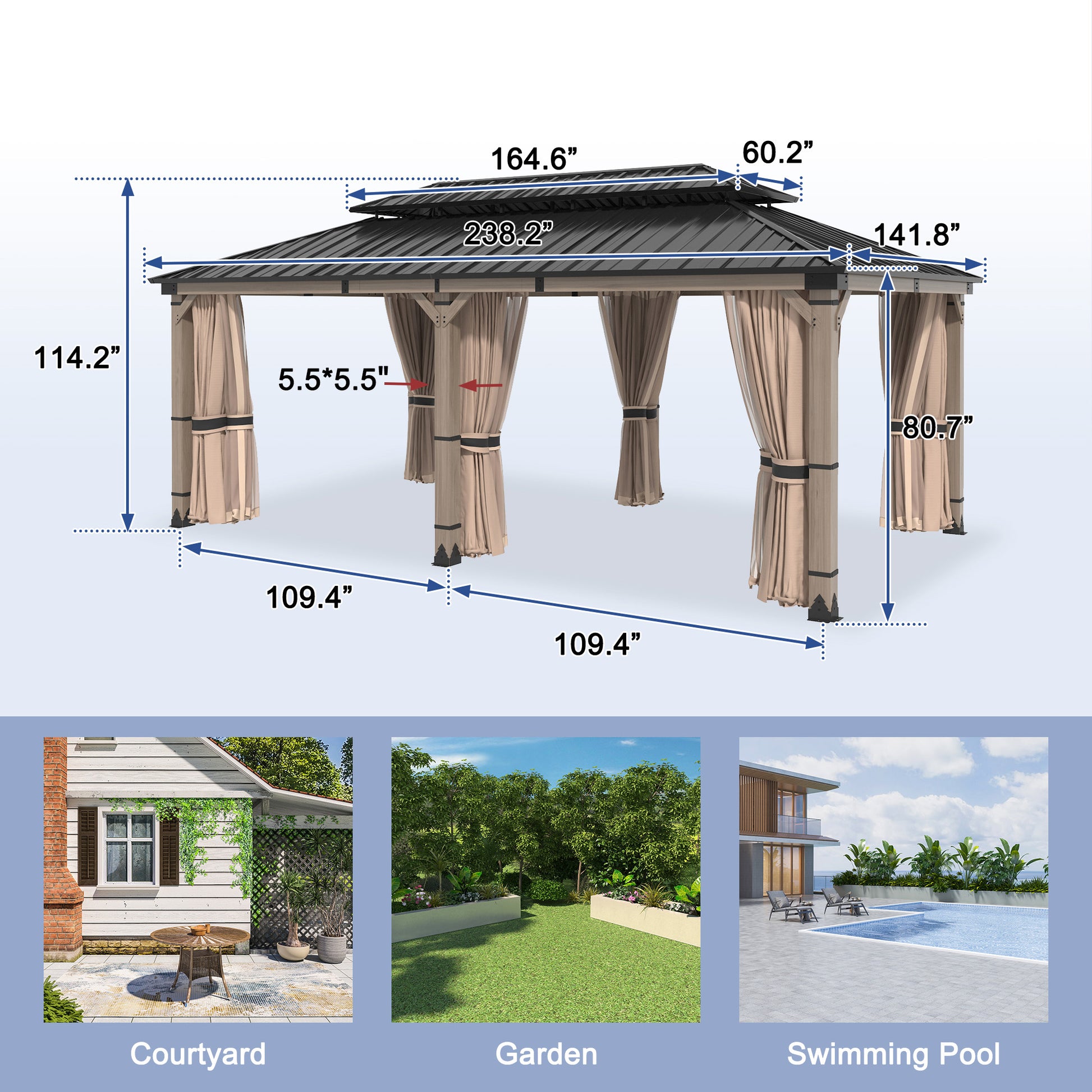 Spacious Gazebo This 12x20 ft double-roof gazebo offers 240 sq ft of roomy space to accommodate 10-12 people