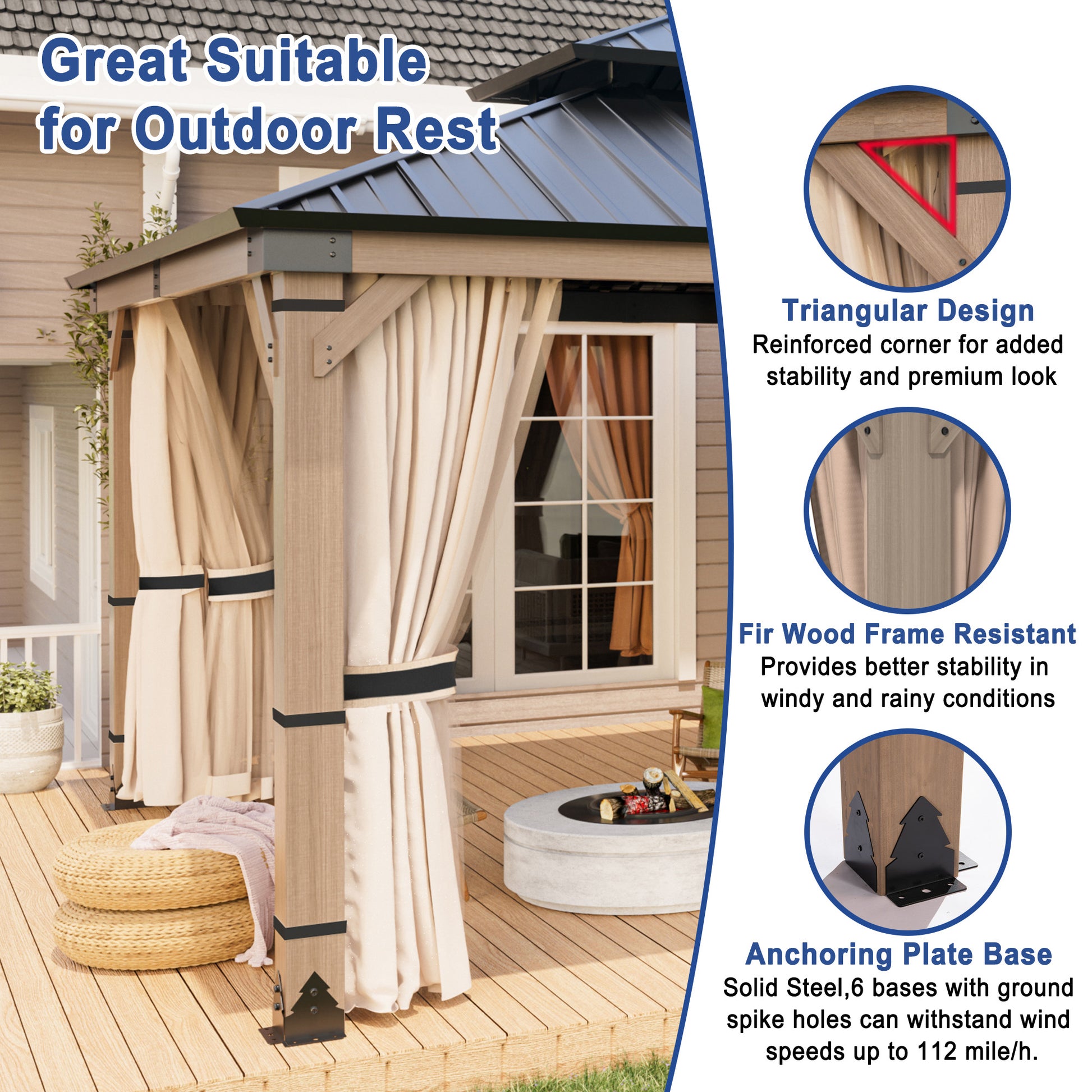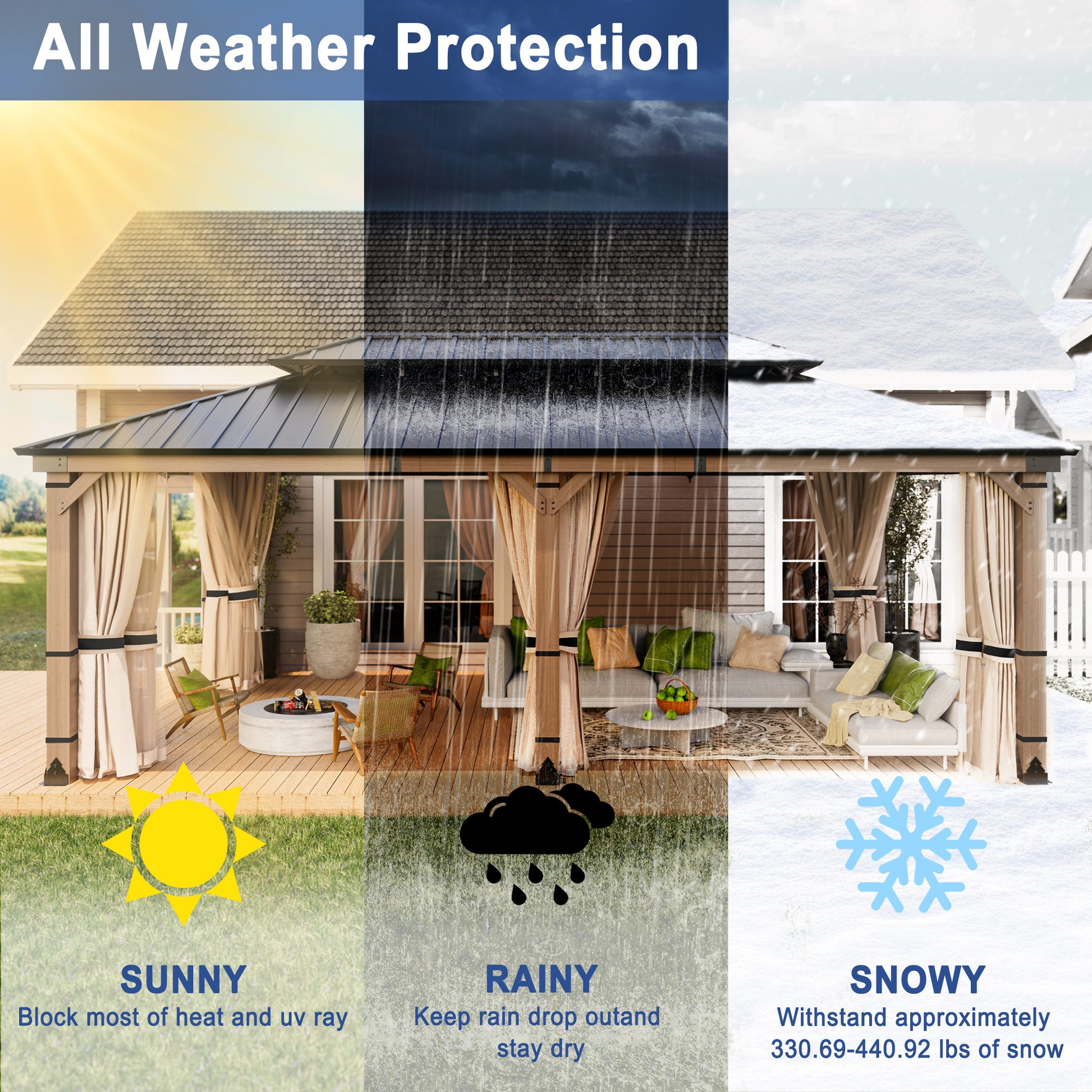 This 20' x 12' Mondawe gazebo creates the perfect outdoor setting for any time of the year. Enjoy gatherings outside in all seasons under a solid cedar wood frame, and the sturdy fade- and rust-resistant galvanized steel canopy will stand the test of time.