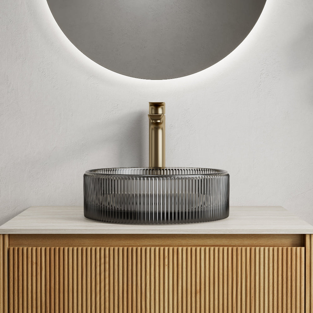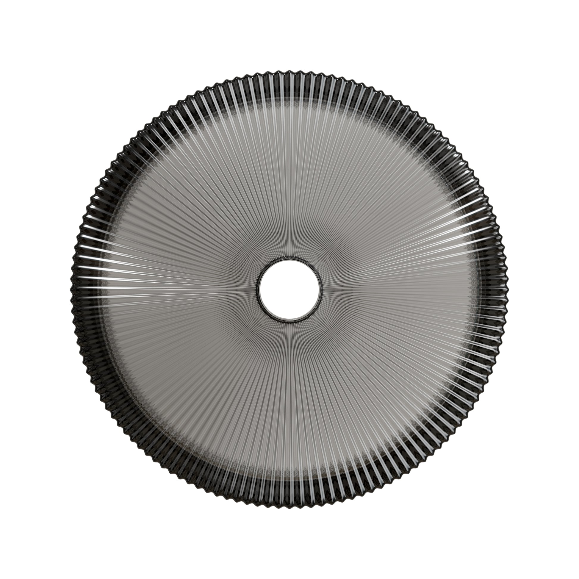 This transparent round basin in black crystal glass with artistic stripe design is stylish and elegant, suitable for countertops or cabinets of various styles and patterns. It provides a clean and refreshing look, while being easy to clean and maintain for long-lasting durability. The basin measures 14.17*4.53 inches, with an appropriate height that helps prevent water splashing when washing hands. It is recommended to pair with a faucet spout height of ≥9 inches and a sink drain stopper without an overflow hole for the best performance.