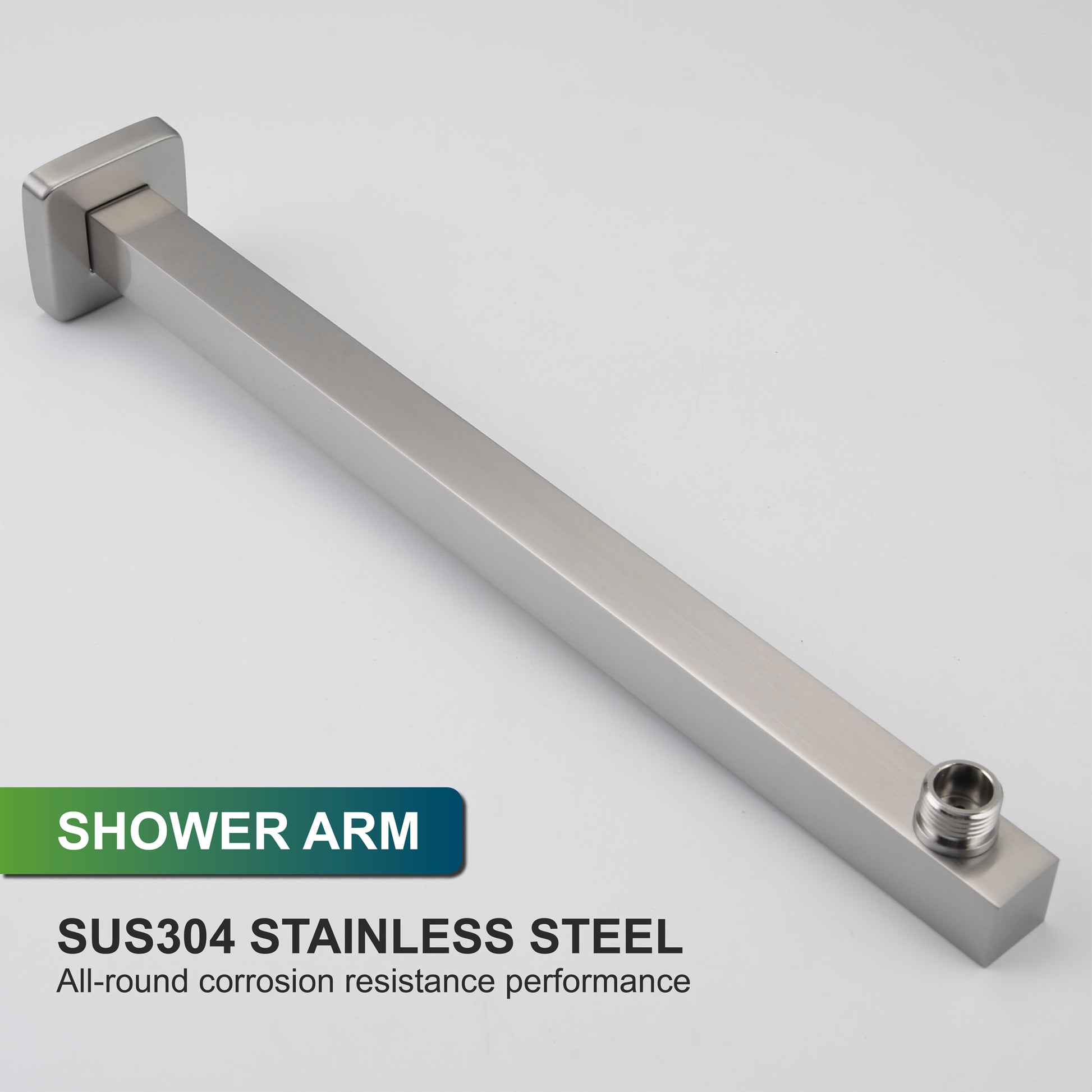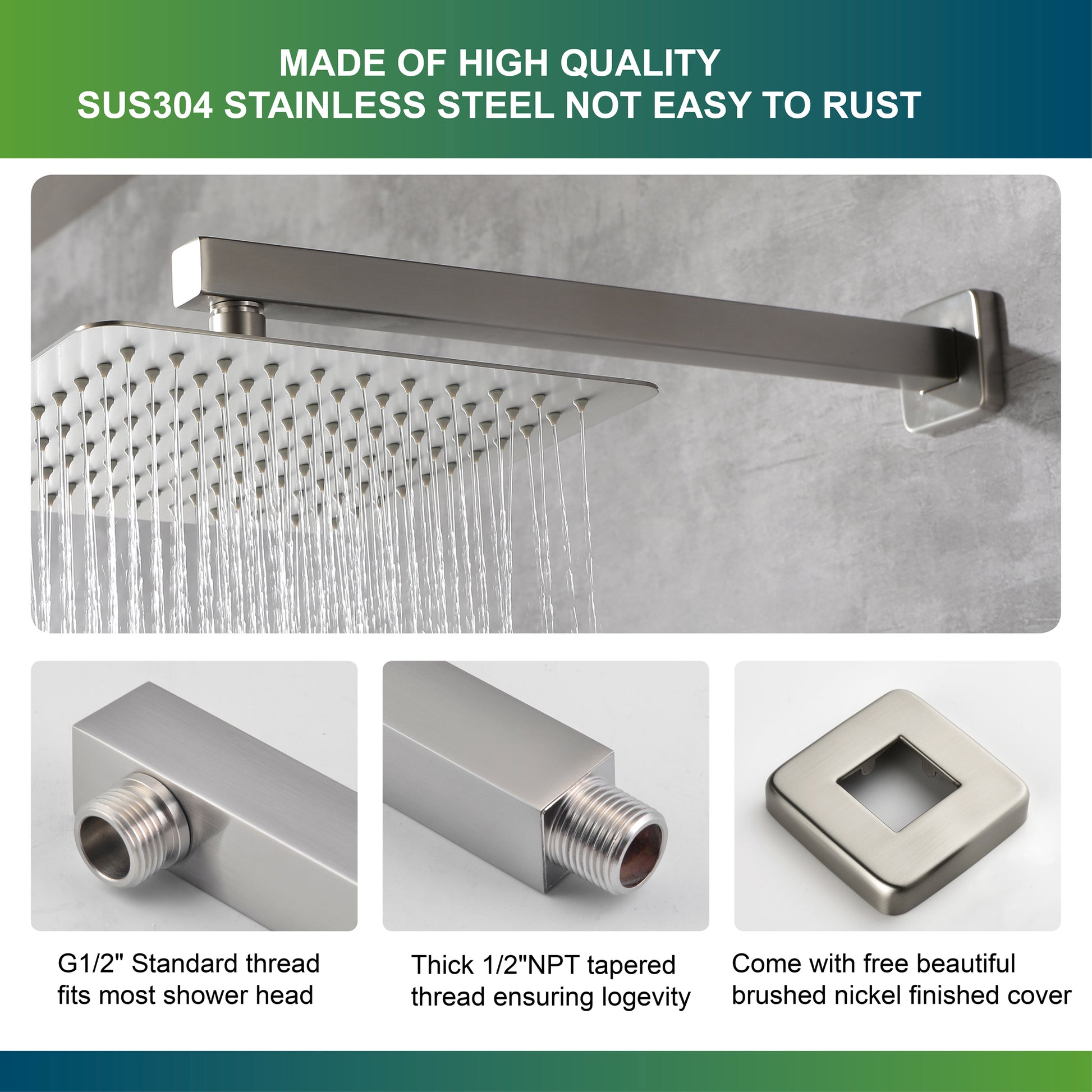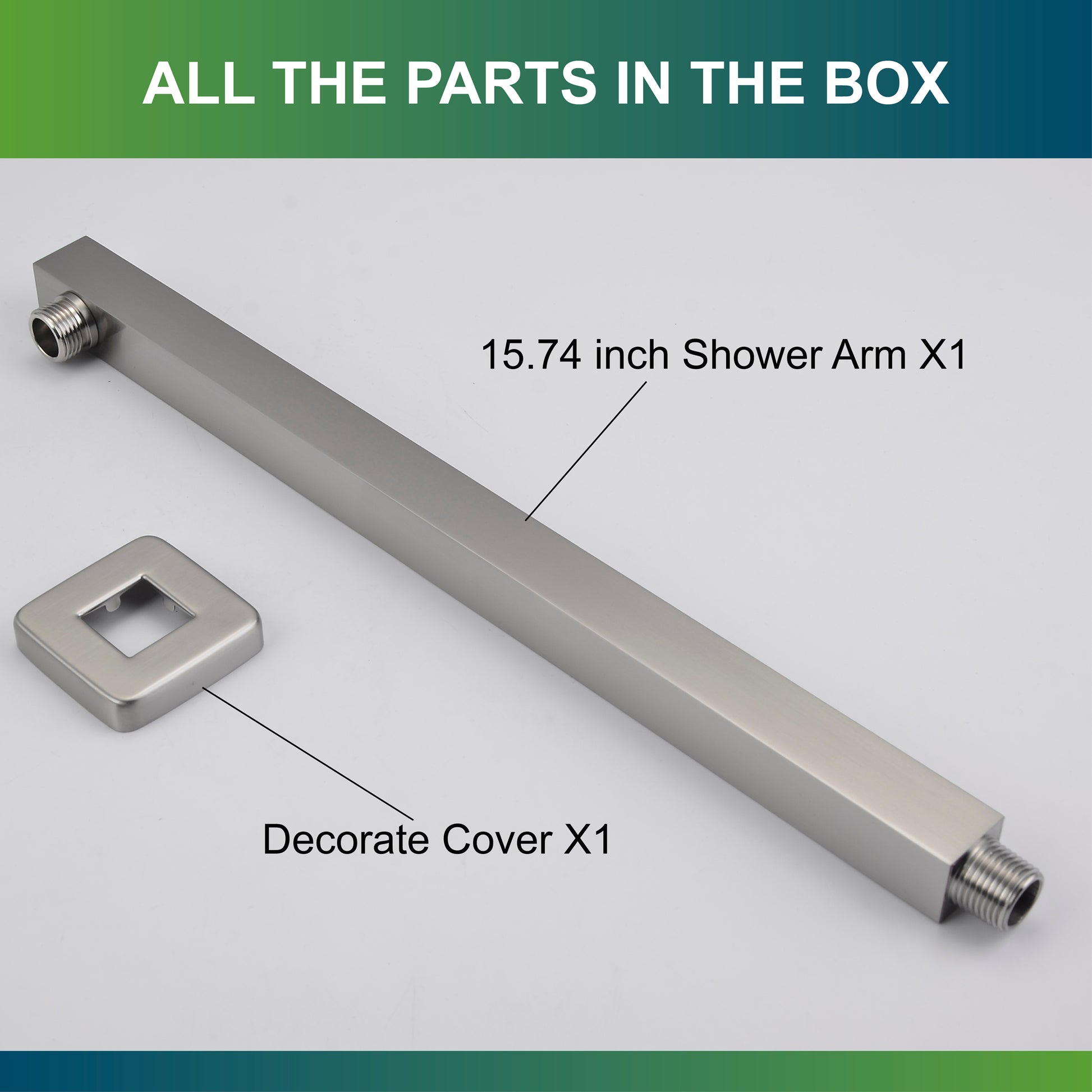 This 15.74-inch Wall Mount Shower Arm features a unique brushed nickel finish with sealing glaze and anti-fingerprint treatment, making your bathroom look stylish and elegant. Crafted from SUS304 stainless steel, it guarantees quality and long-lasting performance. The 1/2-inch NPT threaded connection complies with US standards, suitable for most shower head products. It comes with a decorative cover that neatly conceals the wall opening. The 15.74-inch length offers ample showering space, while the design pairs seamlessly with square or rectangular shower heads. Perfect after-sales service ensures worry-free use.