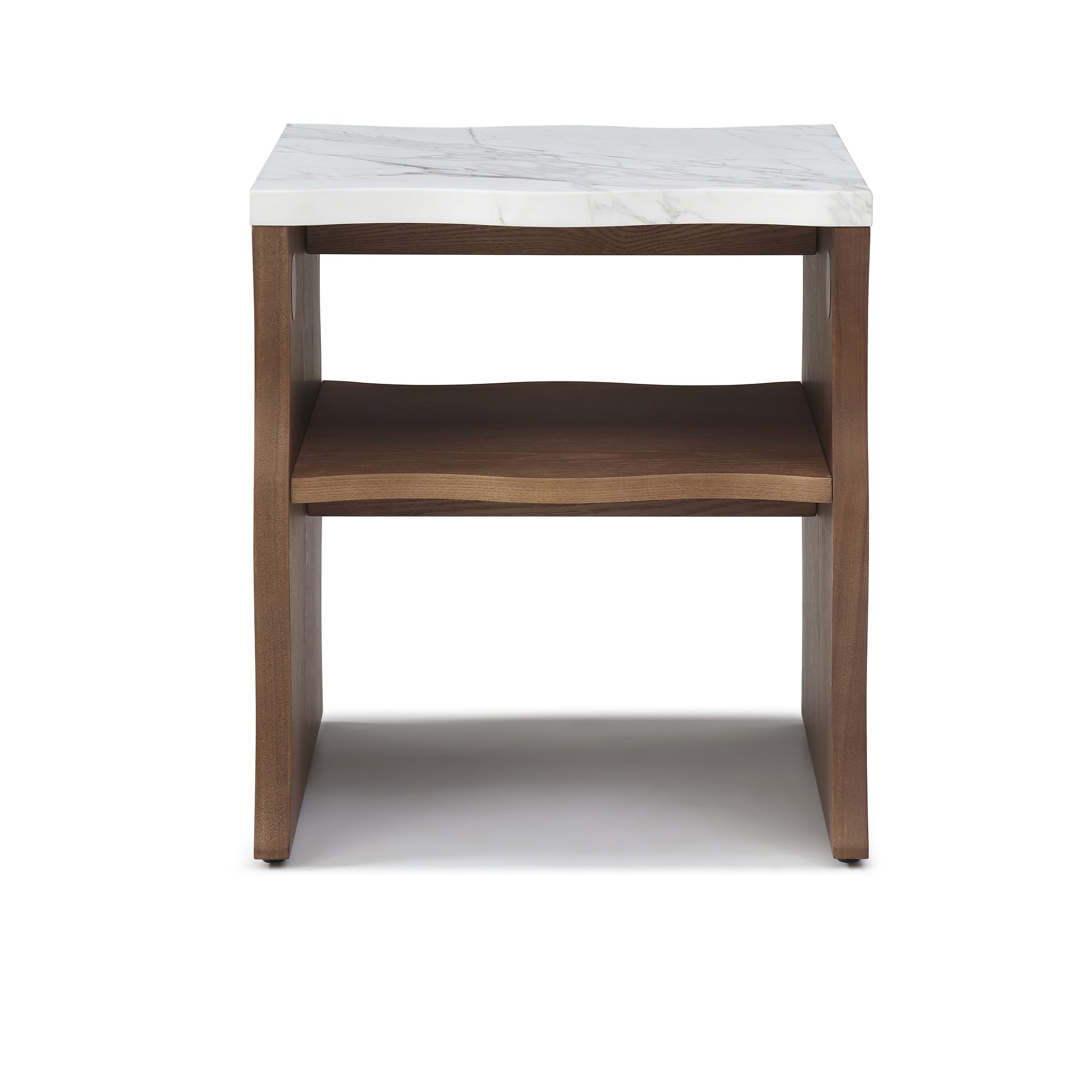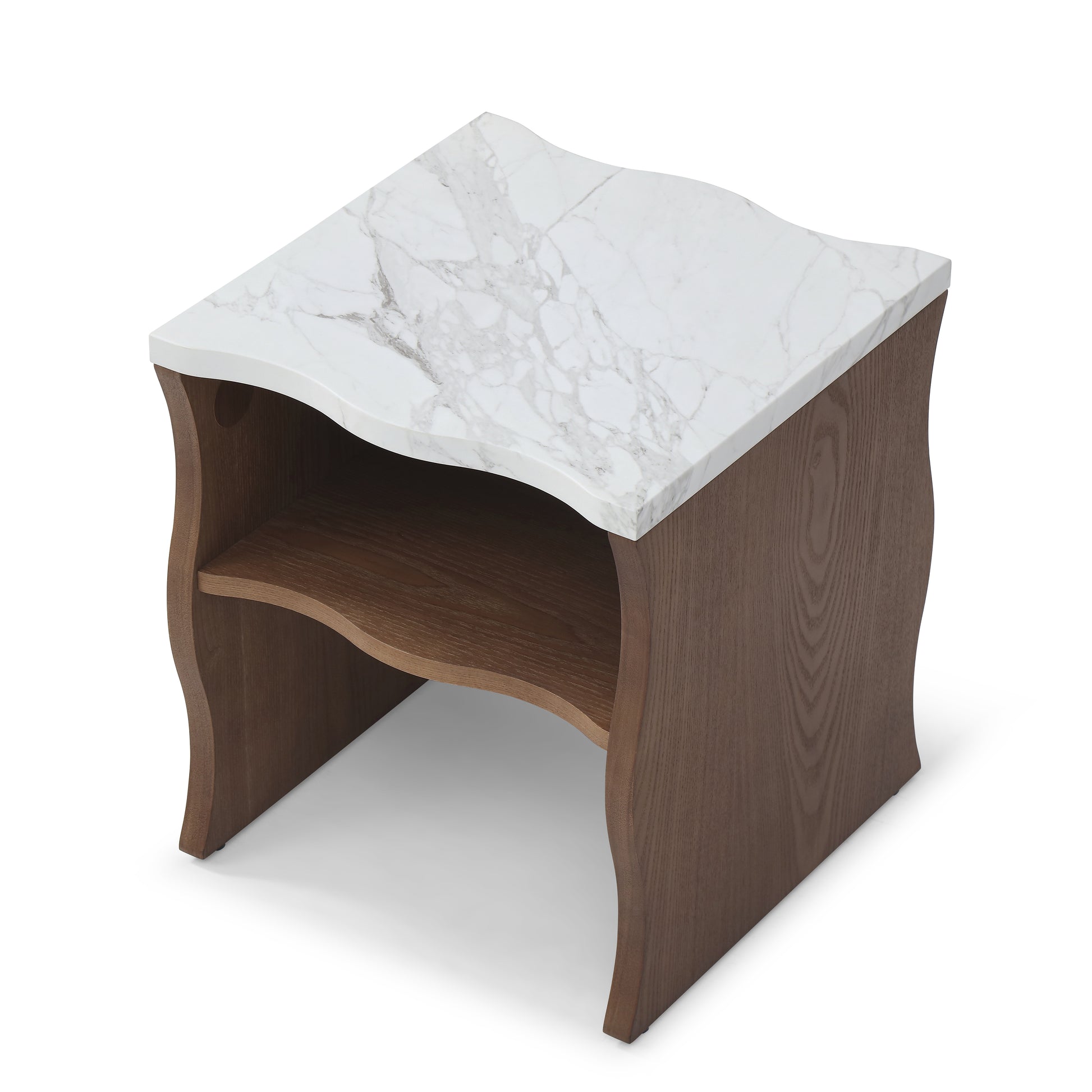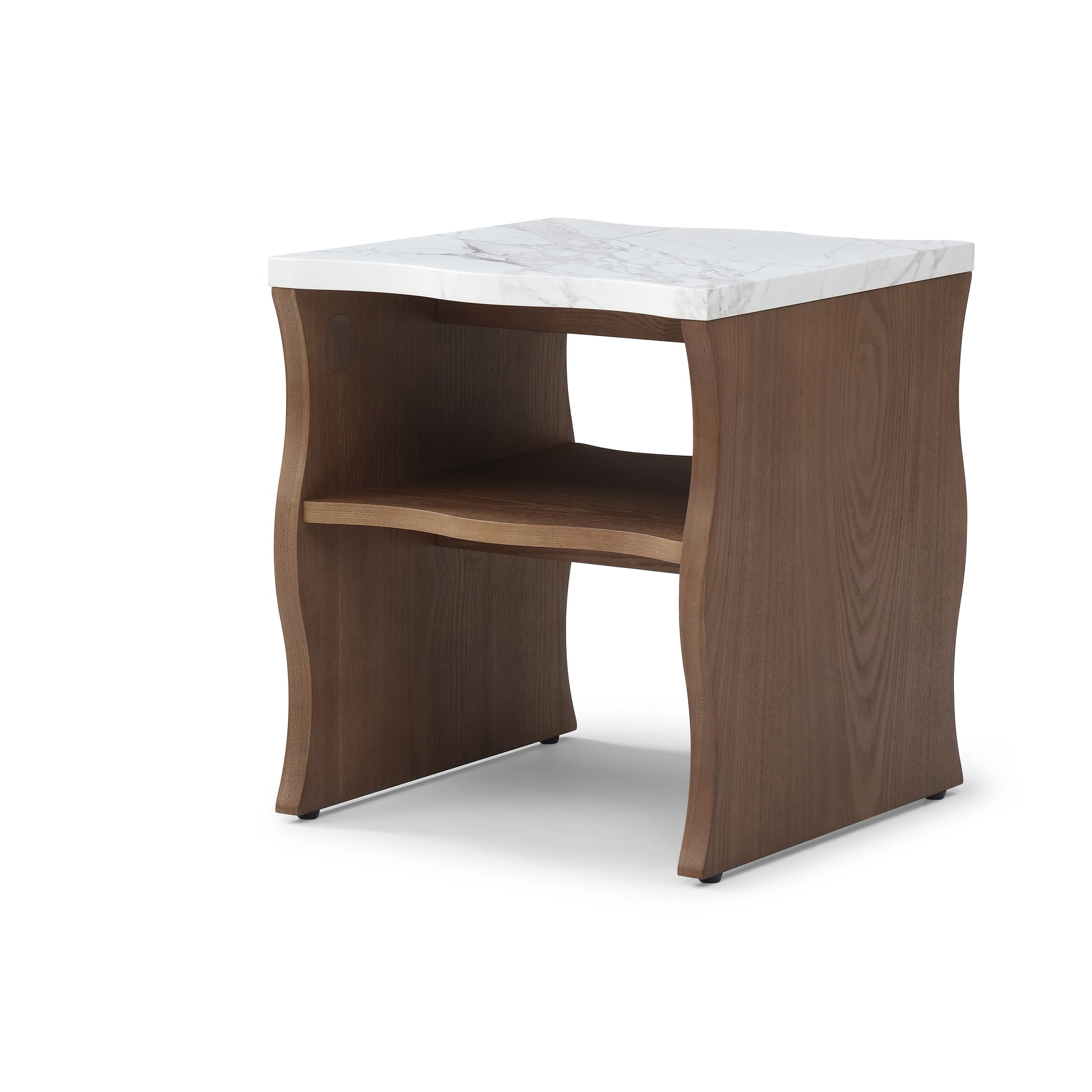 This 17.72 inch modern end table features a wavy silhouette and clean lines that combine simplicity with functional elegance. The faux marble top paired with a warm walnut brown wood veneered base adds natural texture and visual appeal, making it suitable for modern, farmhouse, and Scandinavian interiors. Made from durable MDF with a smooth and easy to clean surface, the table offers long lasting performance for daily use. The two tier structure enhances storage efficiency, providing space for books, lighting, and décor while fitting perfectly in living rooms, bedrooms, or compact apartments. With detailed instructions and labeled hardware, this end table can be assembled quickly and easily.