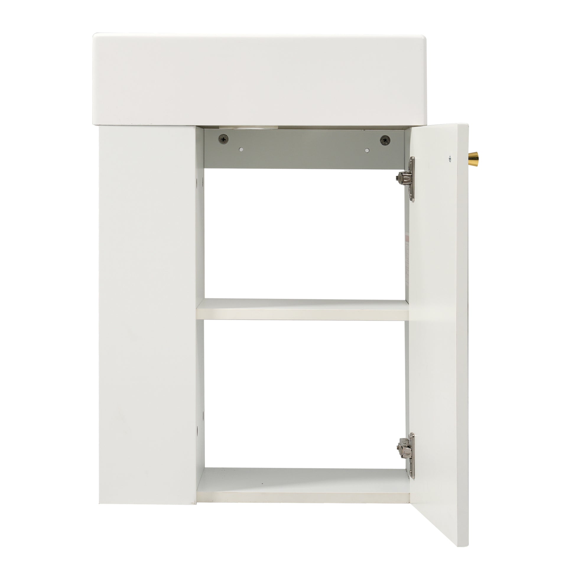This 18.5-inch modern floating bathroom vanity is designed for small bathrooms, offering both style and space efficiency. It features a durable resin sink that is stain-resistant and easy to clean, along with a spacious under-sink cabinet and convenient side storage shelves for organized daily essentials. Crafted from sturdy MDF with a painted finish and rose gold zinc alloy handle, it combines elegance with long-term durability. The wall-mounted design saves floor space, while the soft-close door ensures a quiet and comfortable experience.