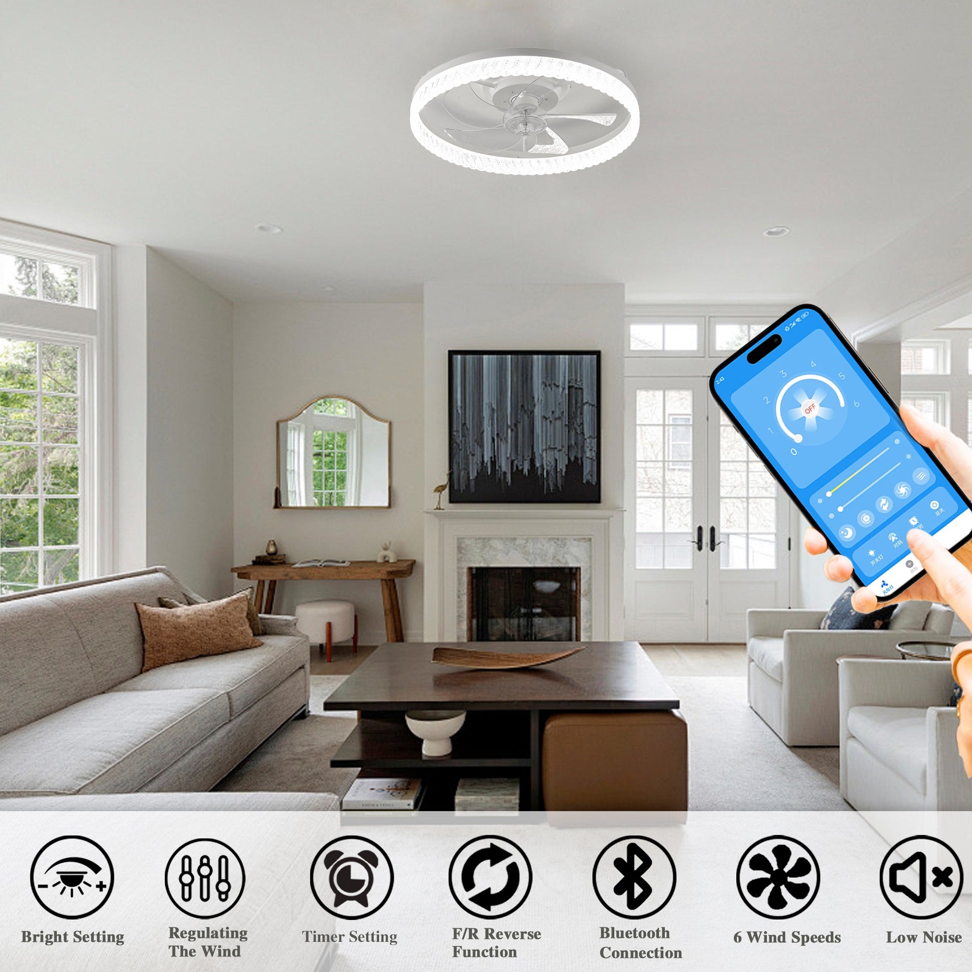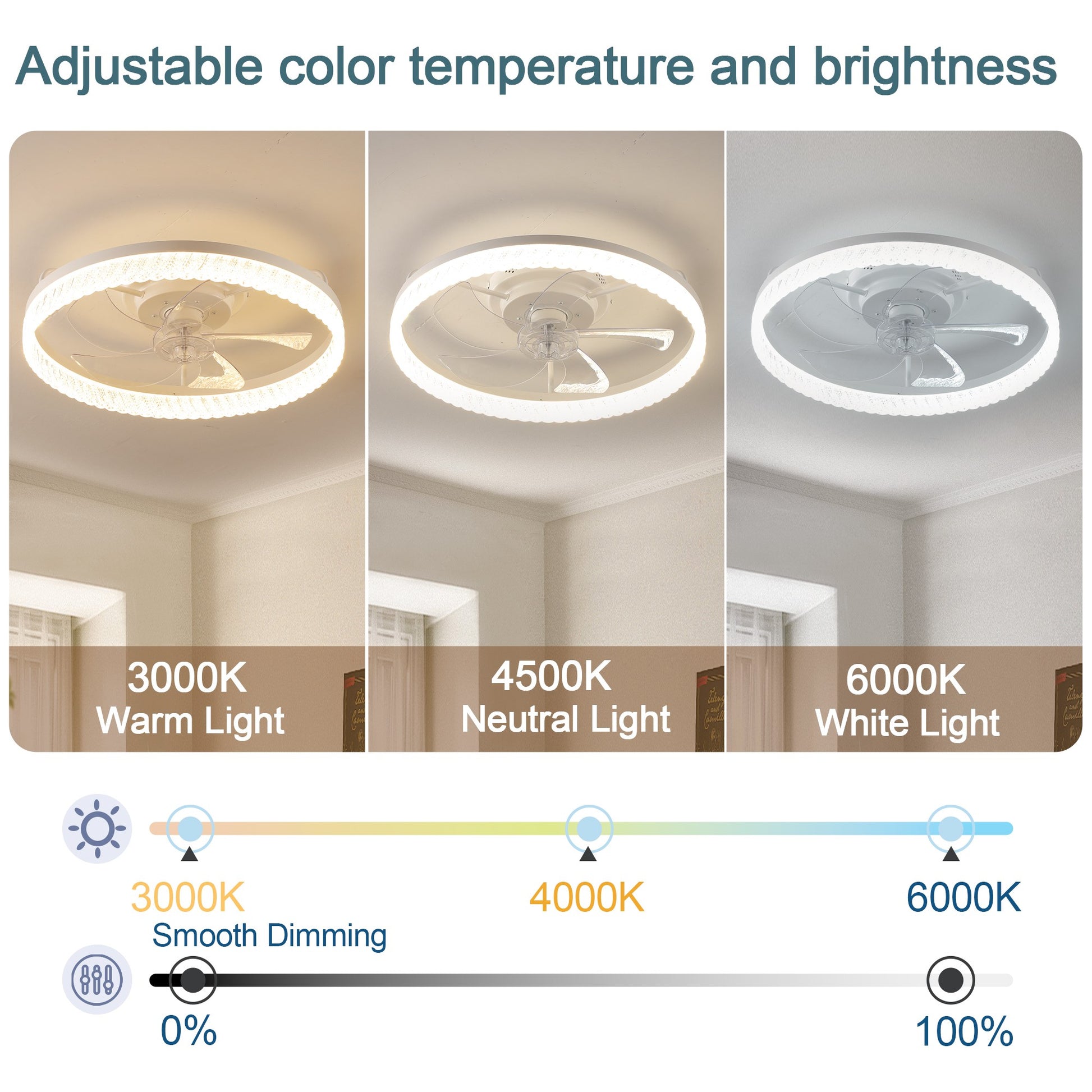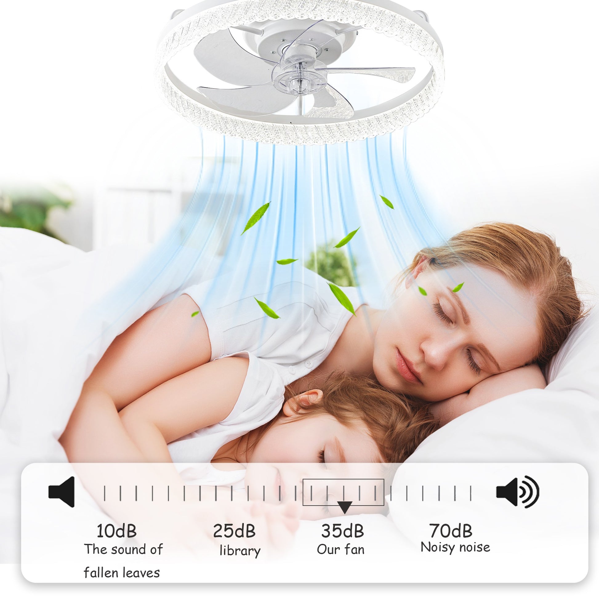 Imagine this white feather fan in your bedroom or kids room—it has remote/APP control, 6 speeds, <35dB quiet DC motor, 3000K-6000K RGB light, perfect for cozy, peaceful days.