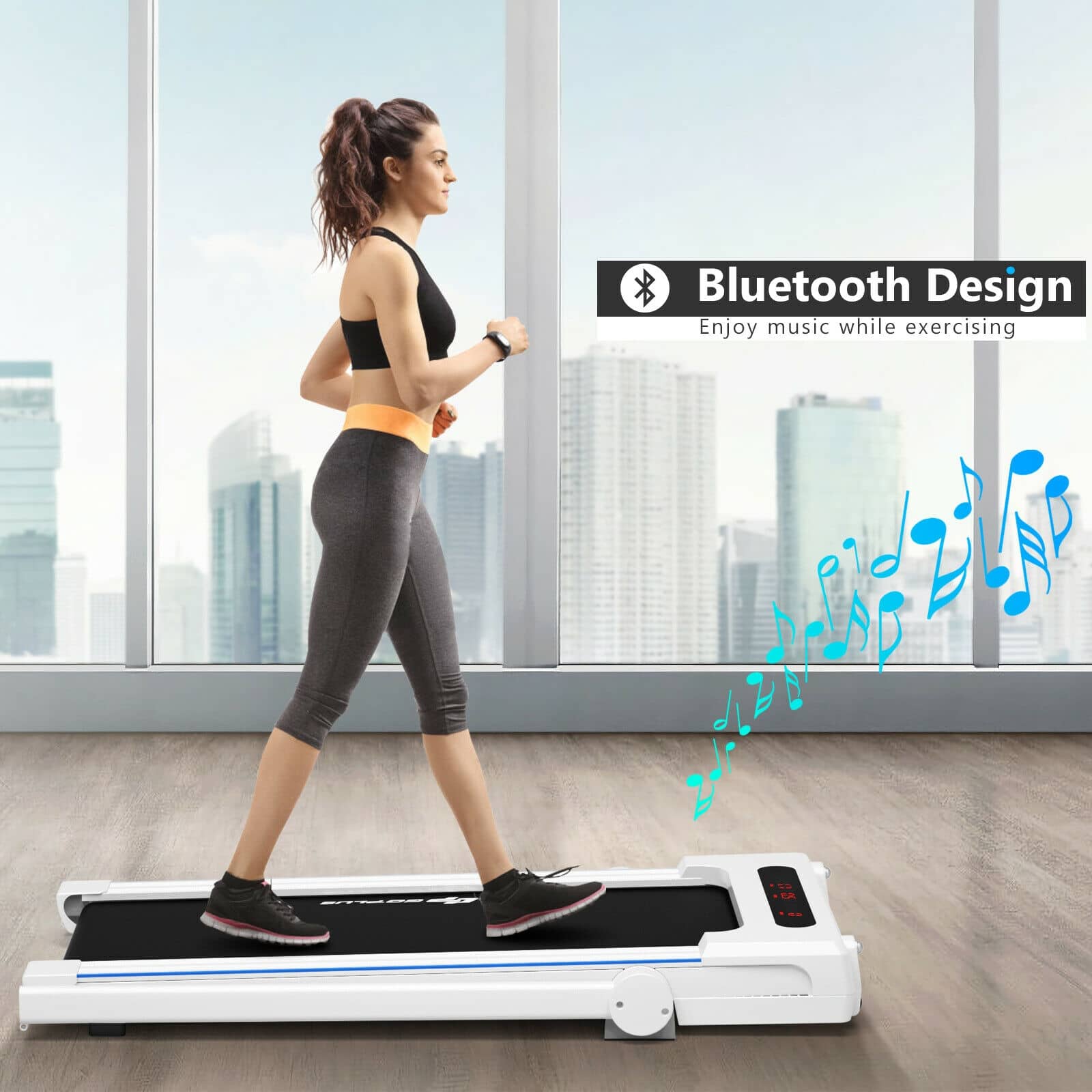 This 3-in-1 treadmill perfectly combines the advantages of treadmills, walking machines and working machines, which is a perfect choice for family and office workout. The 2.25 HP motor is powerful but quiet in operation.And the speed can be adjusted from 0.5Mile/H-7.5Mile/H, allowing users to choose a different exercising state. The large LCD display provides clear data, so you can monitor speed, time, step distance, distance and calories in real-time. Speakers and mobile phone holders allow you to enjoy music or favorite movies during your workout. When you finish exercising, the folding design and flexible wheels make it easy for you to store or move it from one room to another. Come to get it and have a healthy body easily!