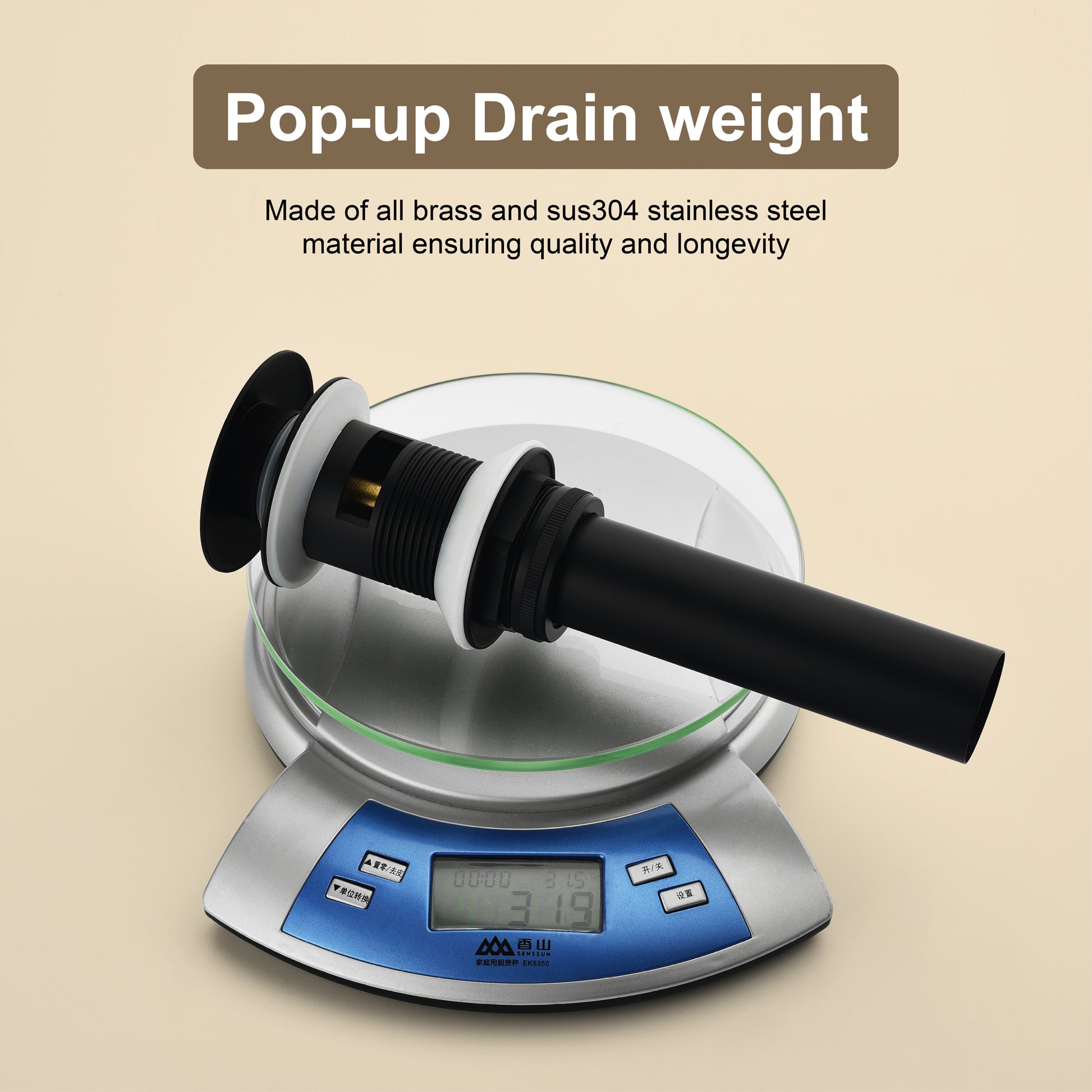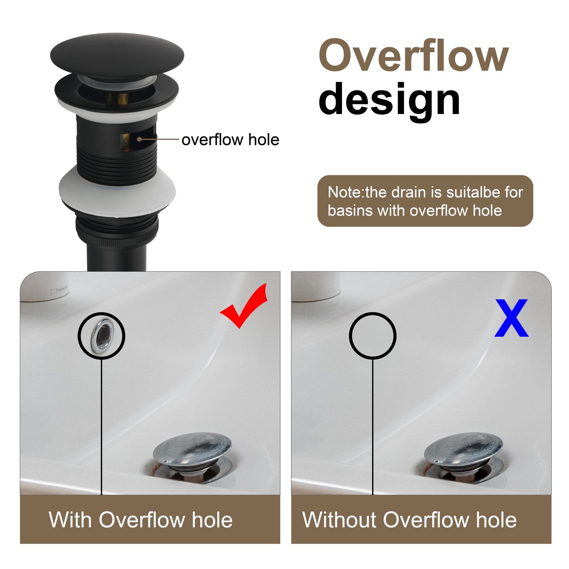 2.6 in. W x 8.66 in. H Pop - Up Drain, Matte Black. The elegant matte black finish will blend perfectly with your basin. It has a large - cap press structure, and you can simply press the stopper to fill or drain the water. The high - quality silicone seal can effectively prevent water leakage. Made of solid brass and SUS304 stainless steel materials, it ensures quality and longevity. Note: This drain is suitable for basins with overflow holes. The overall dimension is 2.6 in. W x 8.28 - 8.66 in. H.