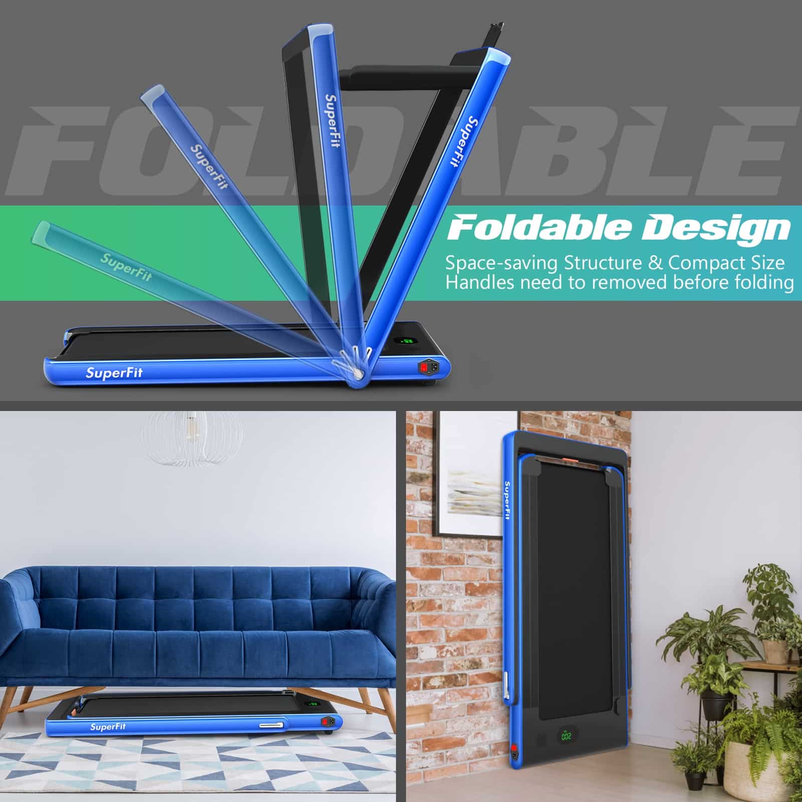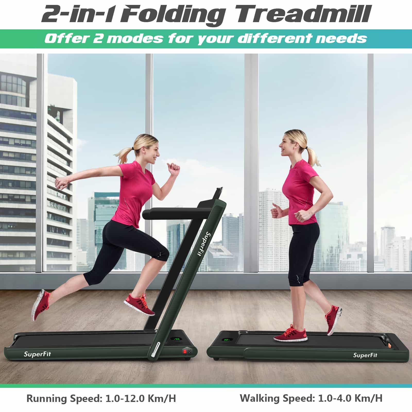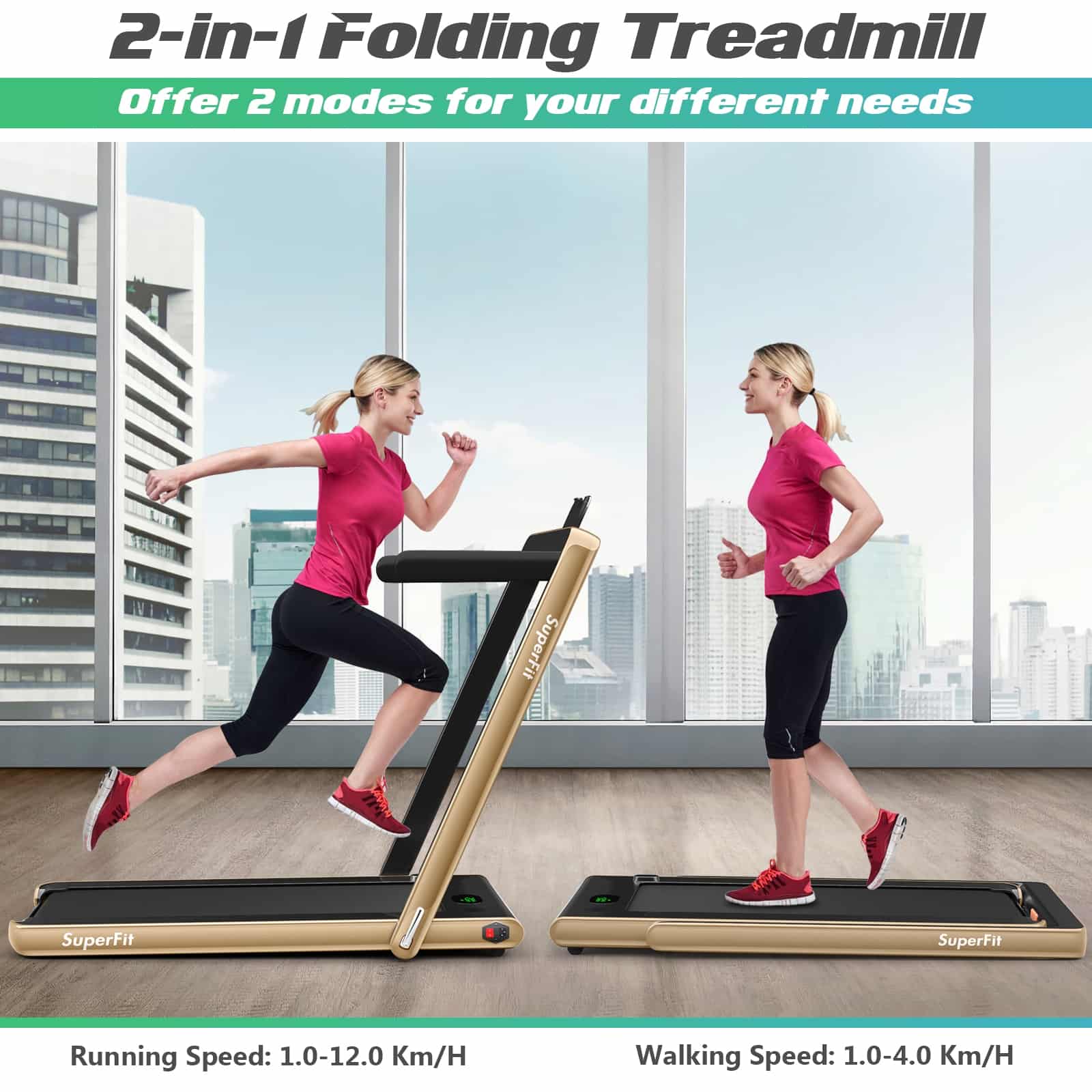 This innovative 2-in-1 foldable treadmill has 2 sport modes so that it can be used as a running treadmill and an under-the-desk walking treadmill.You can use it for walking, jogging, and running, making it suitable for homes, offices, and gyms. With a quiet 2.25 HP motor, it won’t disturb others. The 7-layered shock-absorbing running belt provides effective cushioning for your joints and muscles. The versatile LED display monitors your movement data in real-time. You can connect the treadmill with your phone and play music. It is equipped with remote control and a safety key for an immediate shut-down in emergency situations. The foldable design and transport wheels make it easy to move and store the treadmill. Start exercising now and burn calories!