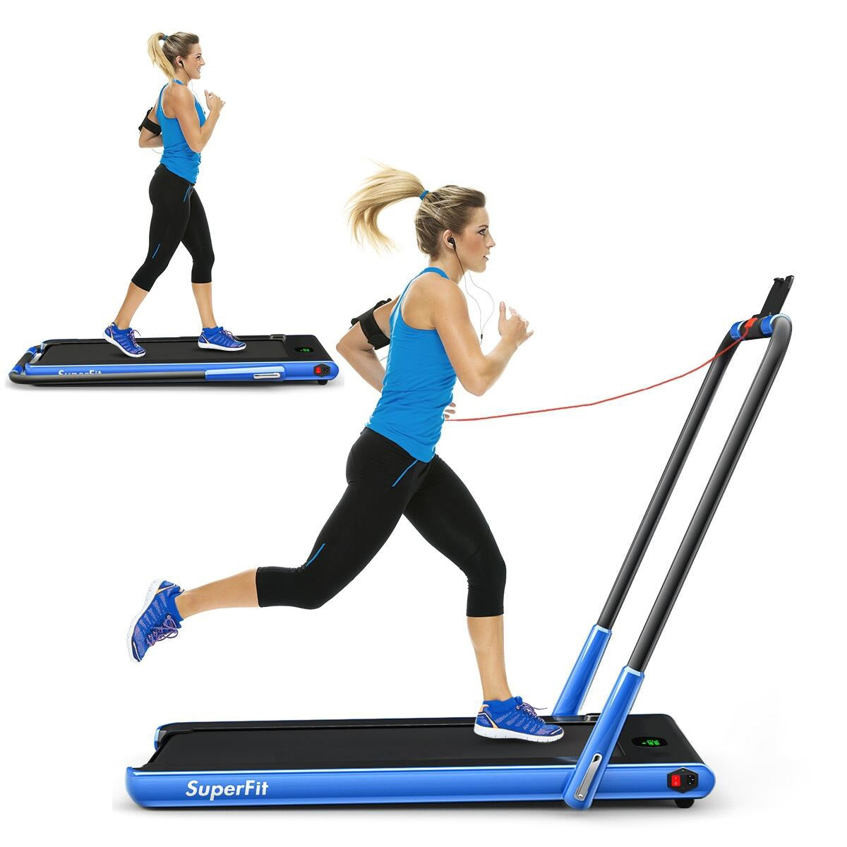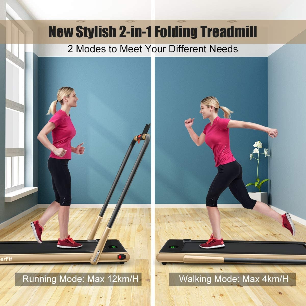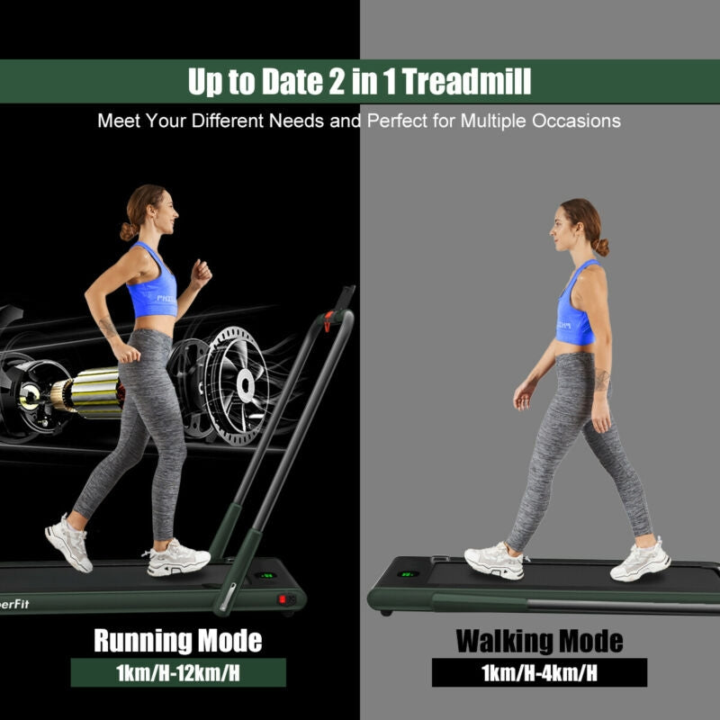 ● Innovative 2-in-1 Folding Treadmill: Compared to ordinary treadmills, the 2-in-1 treadmill has 2 modes to meet your different sports needs, so you can easily have a healthy body. When the riser is folded, it can be used as an under-desk treadmill at a speed of 1-4km/h, so you can do other things while walking. When the riser is raised, the running speed is 1-12km/h and you can run to reach your fitness goal.