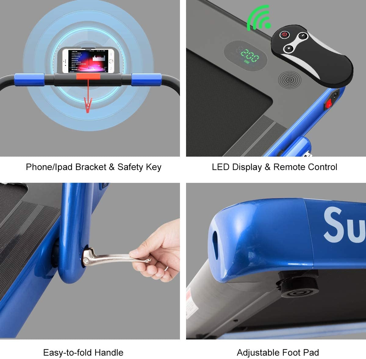 Featuring dual sports modes: running and walking, it can be used at any given time at your convenience.Its ultra-quiet motor and design structure allows it to be used at the home, office, and gym with no disturbances. Back, joints, knees, muscles, and ankles are provided great cushioning with its 5-layered anti-skid and shock-absorbing running belt. Moreover, all your workout’s real-time details are displayed on the versatile LED display. Next, the phone holder only is there to ease the placement and usage of your phone while exercising. Thanks to the remote control and emergency stop button, the user is guaranteed safety in case of a mishap.
