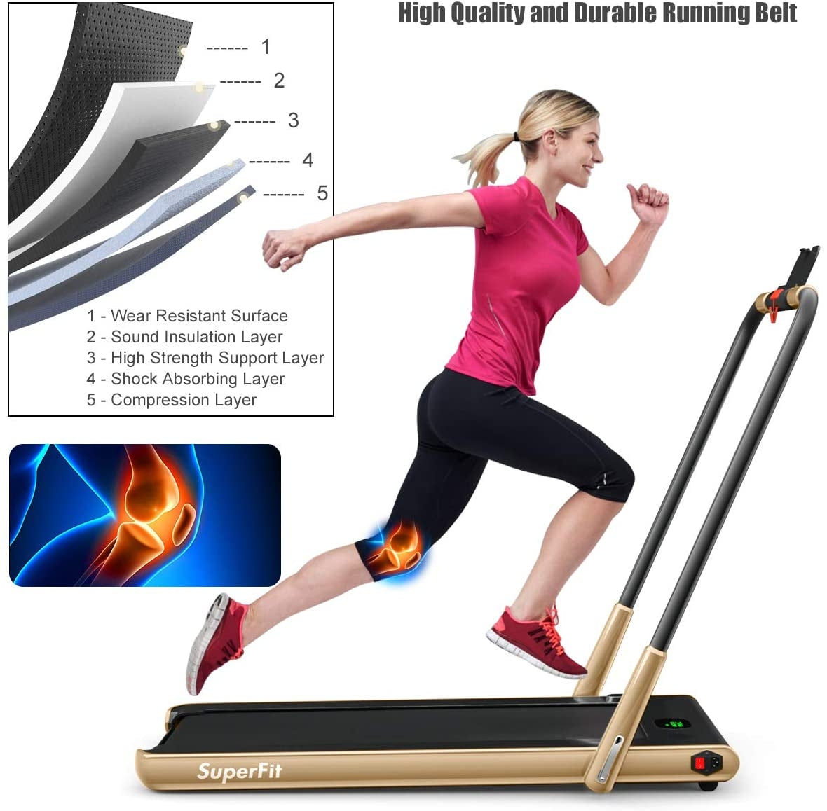 ● Non-slip Running Belt and Multifunctional LED Display: The 5-layer non-slip texture running belt features a spacious running area (40" x16"), providing an effective and safe cushion for your knees and muscles for a superior running experience. The LED display clearly shows time, speed, distance, and calories, monitoring your progress in real-time and keeping your movement data at a glance.
