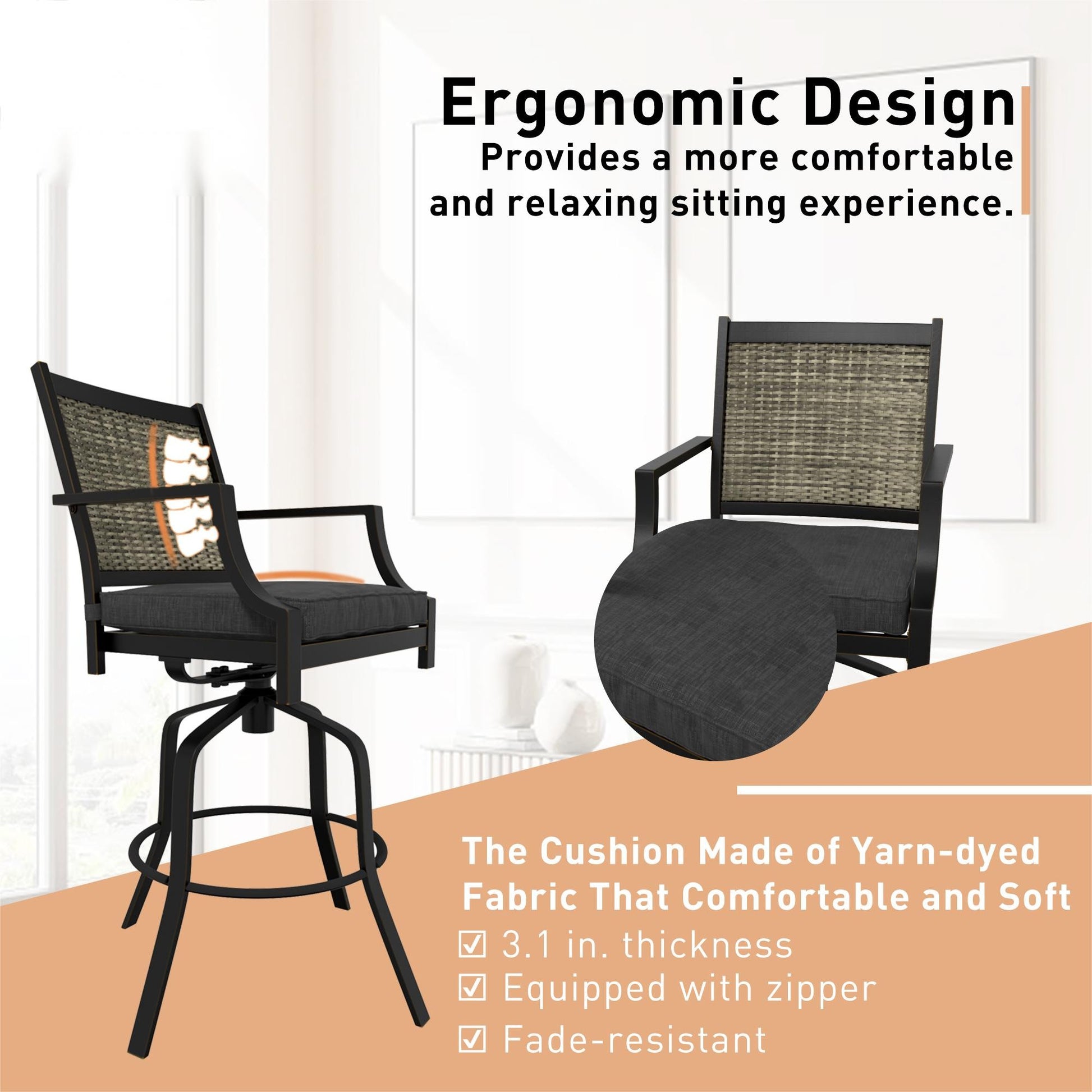 The outdoor swivel bar stool’s 360° swivel function lets you turn in any direction helping you easily enjoy the view or chat with friends and the swivel turntable system under the seat ensures smooth noiseless rotation