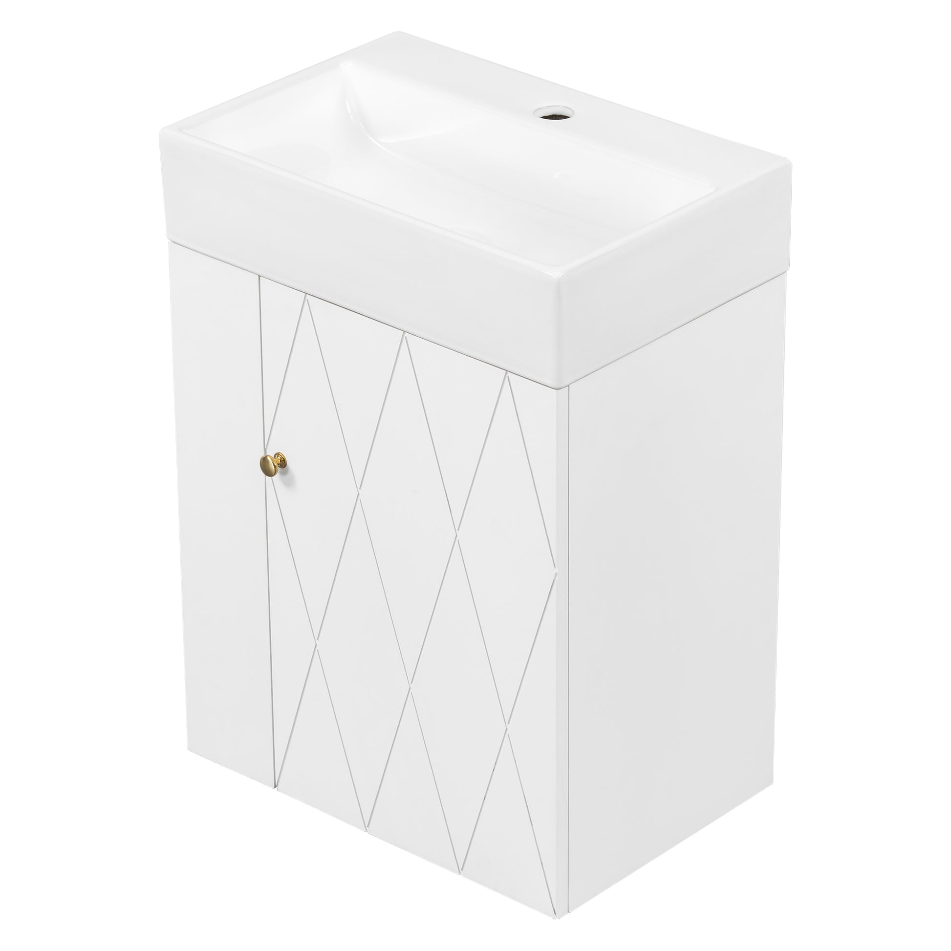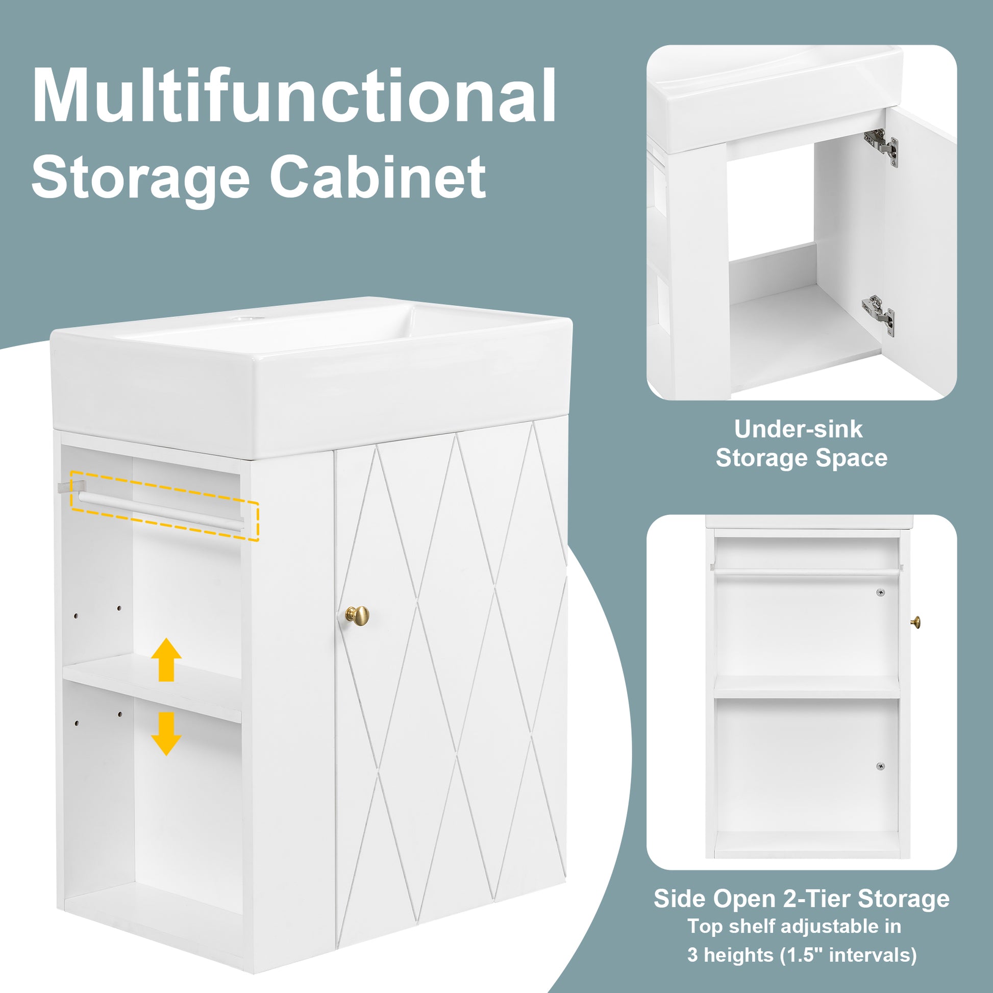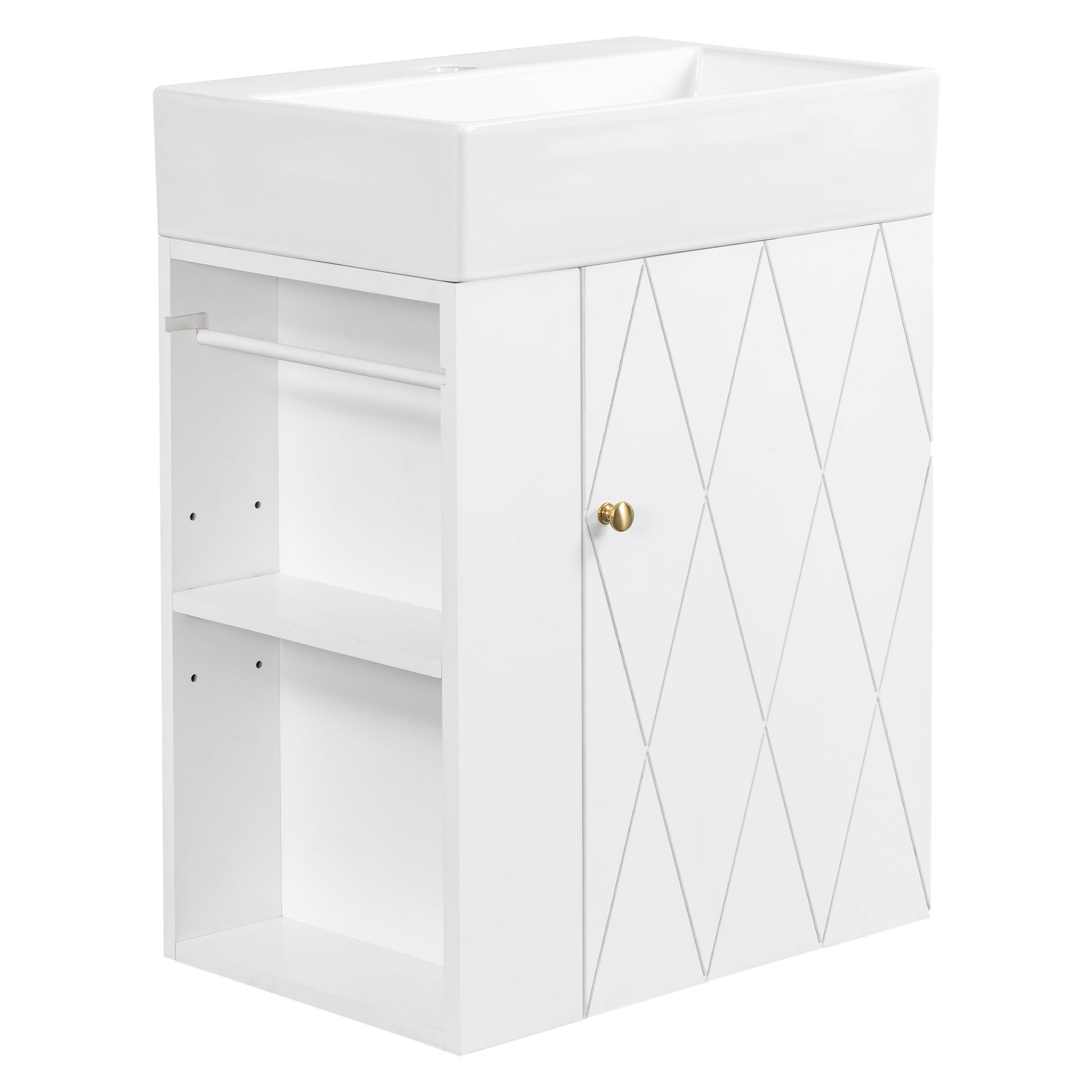 20 Inch Bathroom Vanity with Ceramic Sink Diamond Pattern Door Gold Handle Side Shelves and Towel Bar White