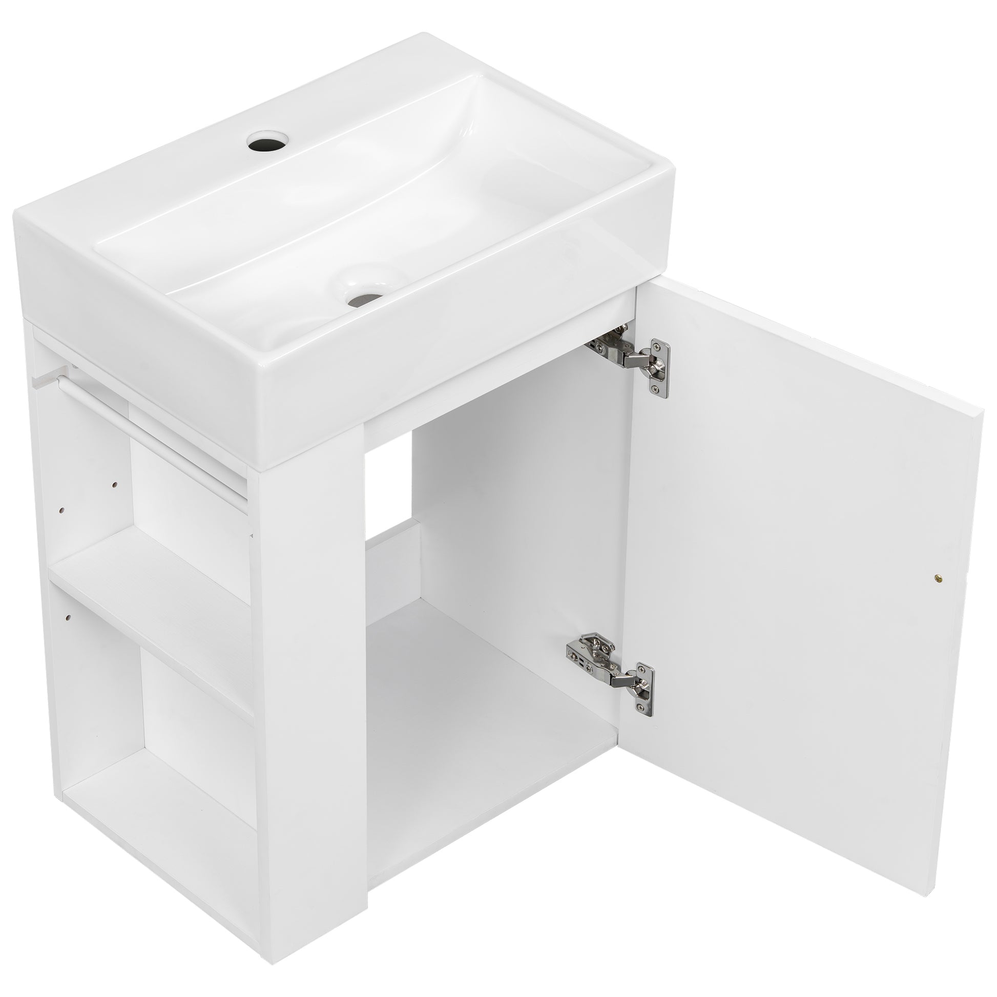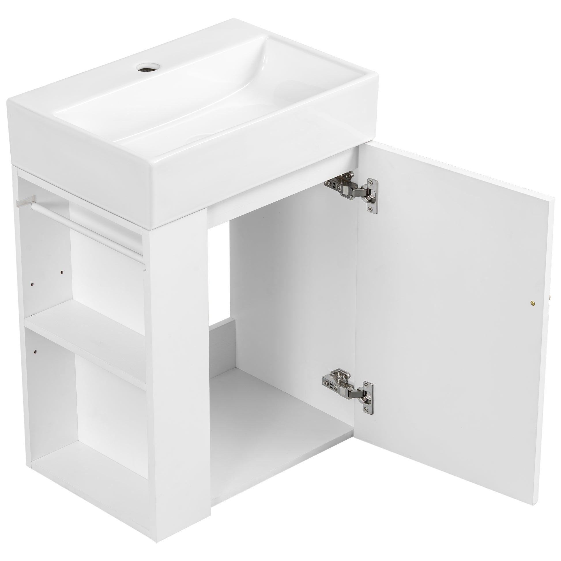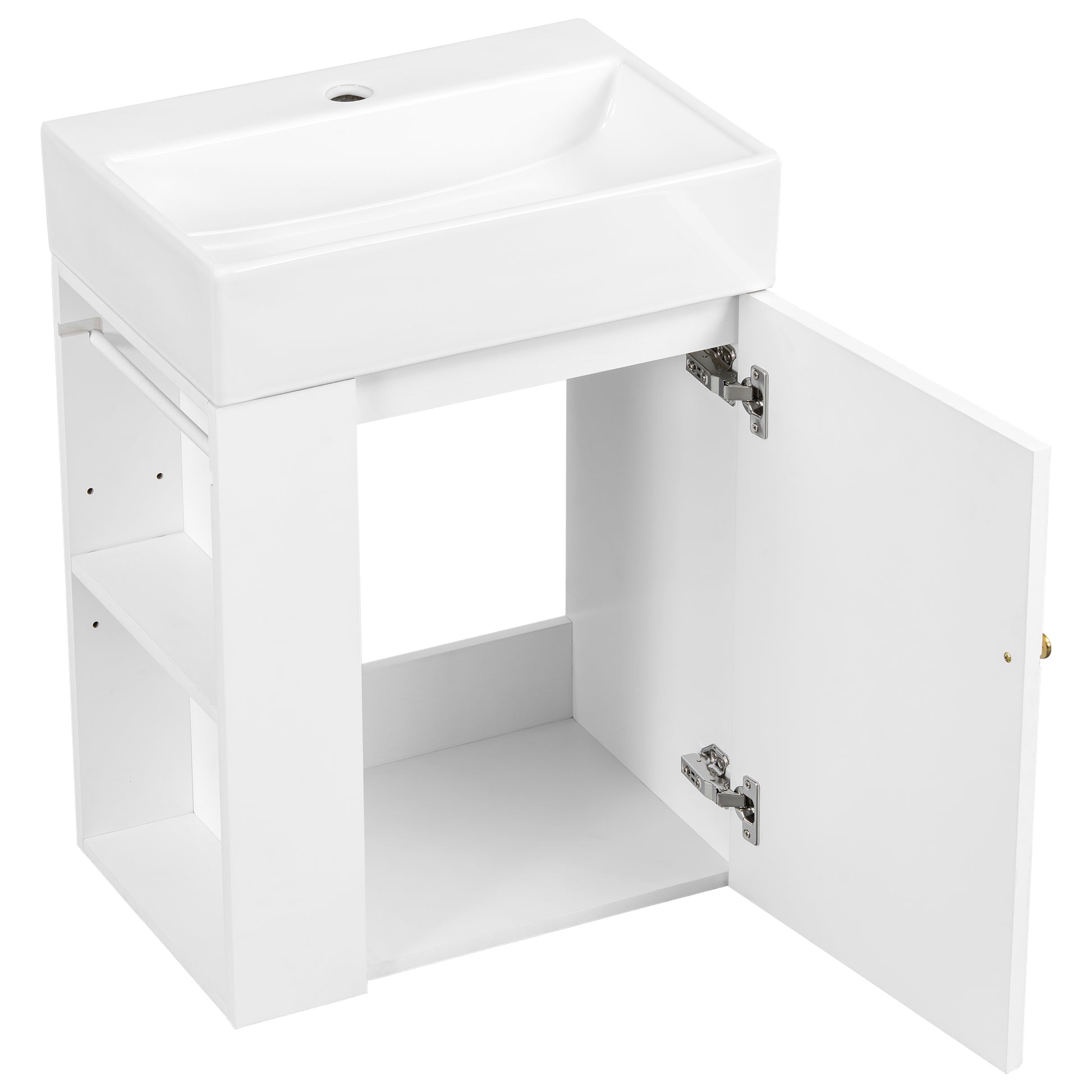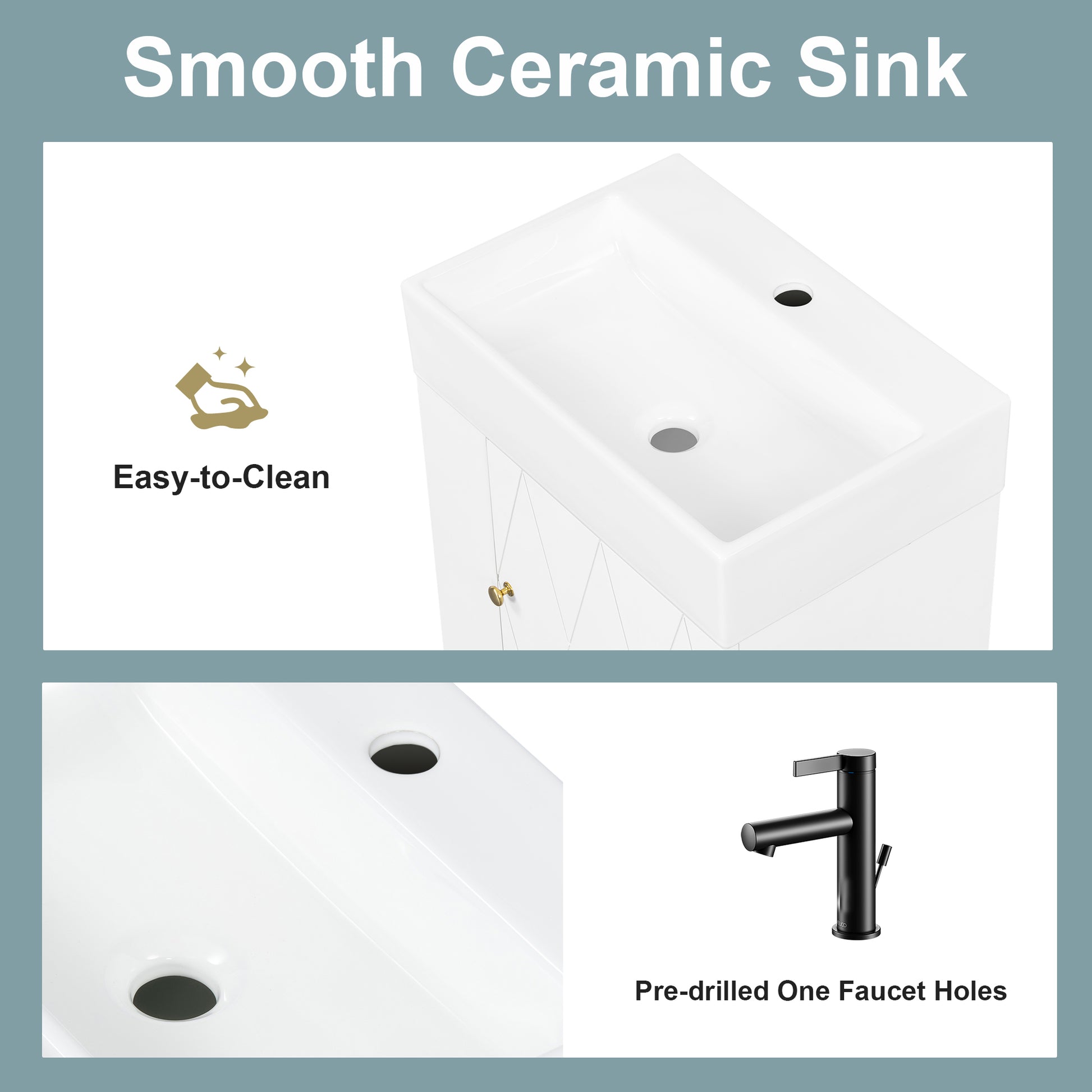This 20 inch bathroom vanity is designed for compact spaces such as small bathrooms, apartments, and powder rooms while providing practical everyday functionality. The cabinet is built from durable MDF and paired with a smooth ceramic sink that is easy to clean and suitable for daily washing needs. A stylish diamond pattern door with a gold handle adds a refined decorative element, while the side open shelves and integrated towel bar offer additional convenience. With enclosed cabinet storage and a space efficient layout, this vanity helps keep essential items organized and within reach. The unit requires assembly and comes with clear instructions for a straightforward installation.