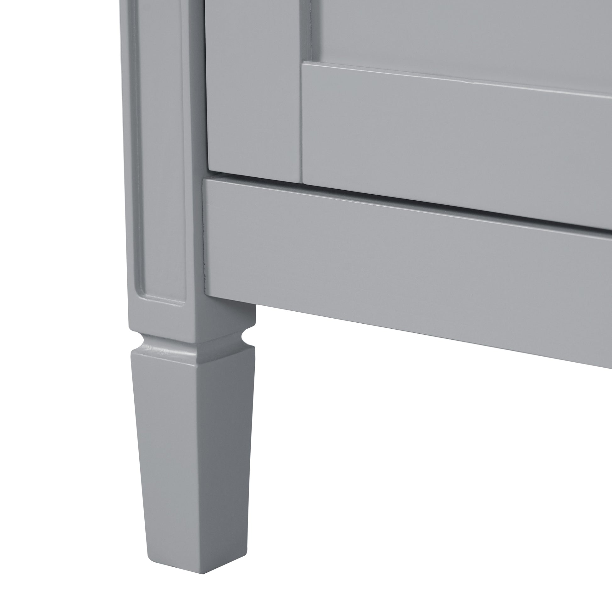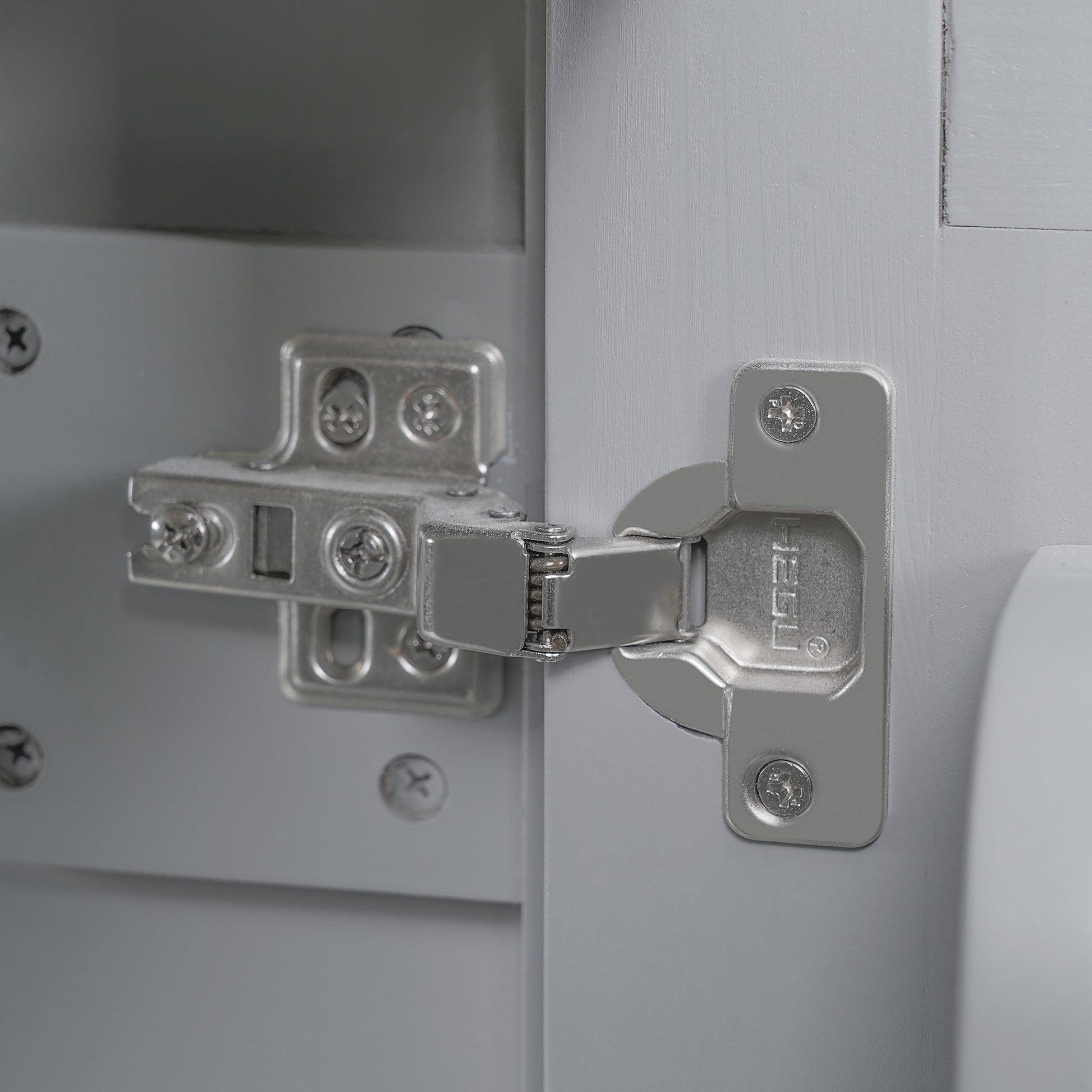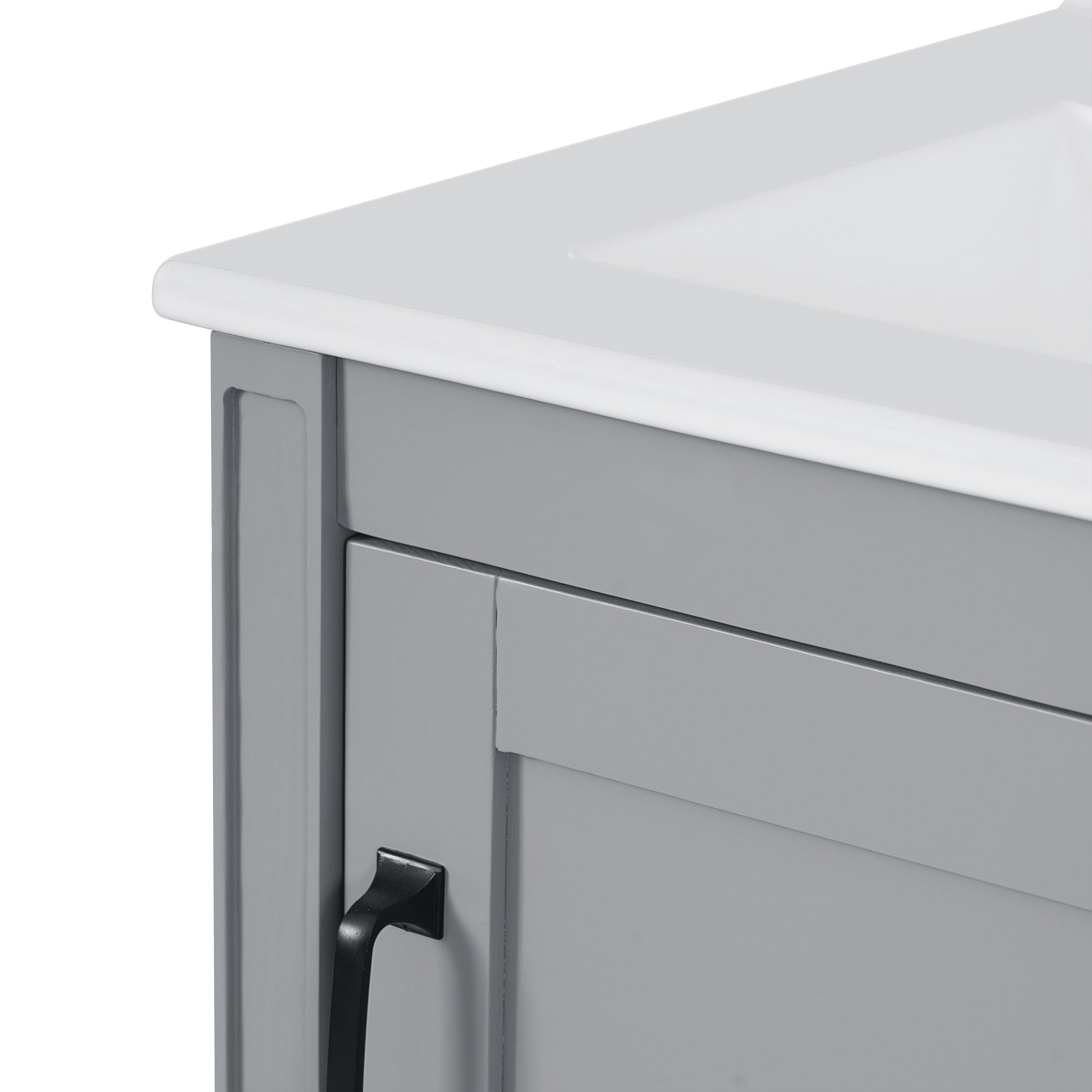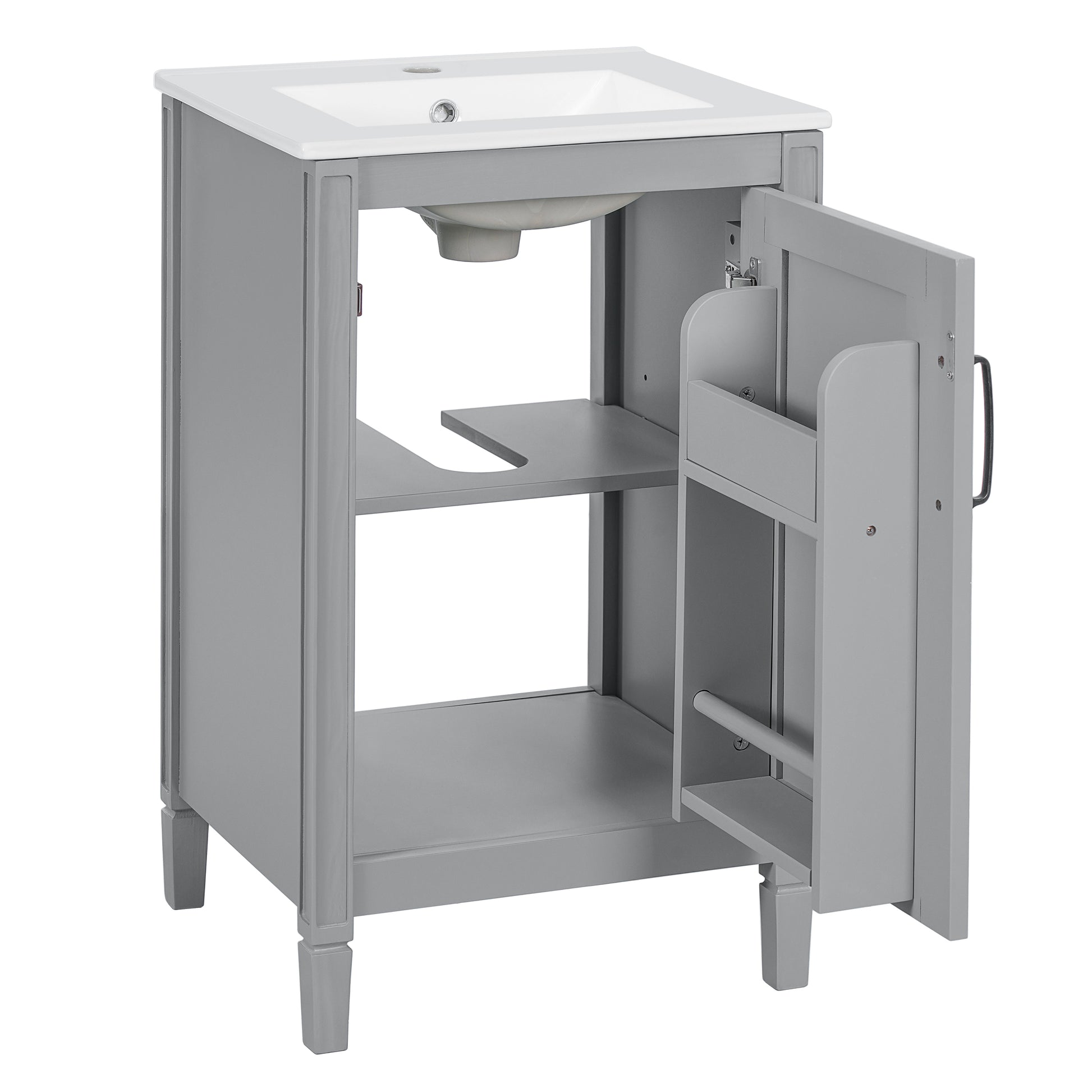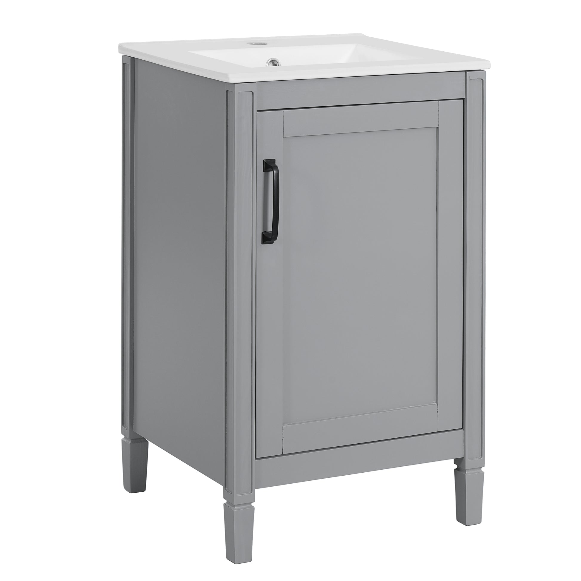 This 20-inch gray bathroom vanity offers a stylish and space-saving solution for small bathrooms. Featuring a stain-resistant ceramic sink with an overflow hole and a quiet soft-close door, it delivers both practicality and comfort. The adjustable U-shaped shelf, designed around plumbing, and dual shelves on the door provide efficient organization for toiletries, towels, and accessories. Solid wood legs and corrosion-resistant zinc alloy handles ensure durability while enhancing the modern look of your bathroom.