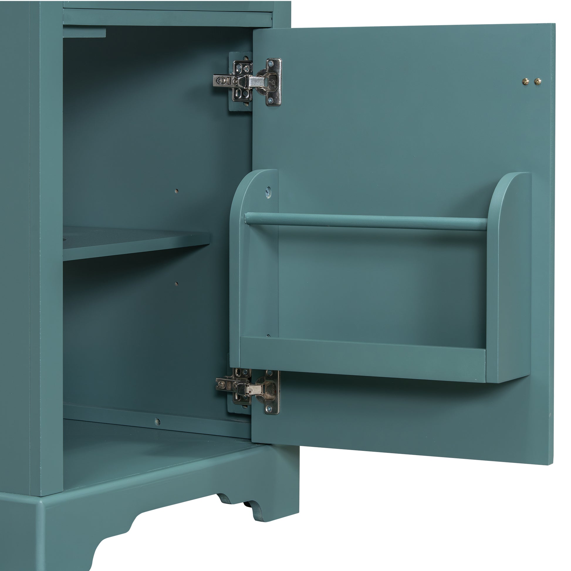 This 20-inch green bathroom vanity is perfect for small bathrooms, offering a smart balance of compact size and ample storage. It features a durable ceramic sink with an overflow hole, a solid wood and MDF cabinet, and a soft-close door for quiet operation. Inside, a U-shaped adjustable shelf fits neatly around plumbing, while a door-mounted rack keeps daily essentials within reach. The aluminum alloy handle adds a stylish modern touch, and the open-back design allows for easy plumbing installation.
