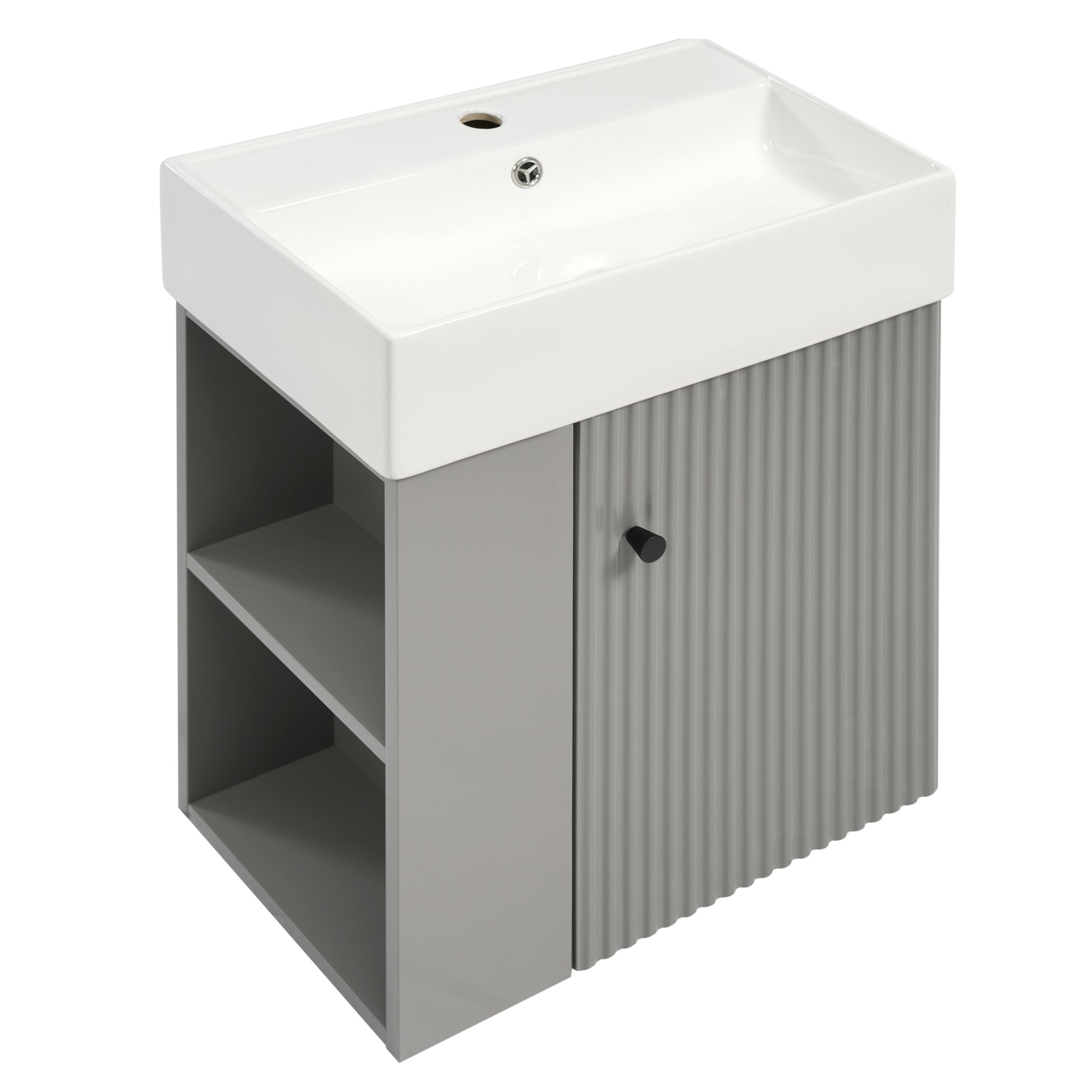 This 21.6-inch gray modern floating bathroom vanity is designed to save space while offering smart storage for compact bathrooms. It features a high-quality ceramic sink with an overflow hole and a pre-drilled single faucet hole for quick installation, plus an under-sink cabinet and open left-side shelves for organized access to daily essentials. Crafted from durable MDF with a painted finish and a corrosion-resistant aluminum alloy handle, it combines modern aesthetics with long-lasting durability. The soft-close door ensures quiet operation, and the wall-mounted design helps maximize floor space.