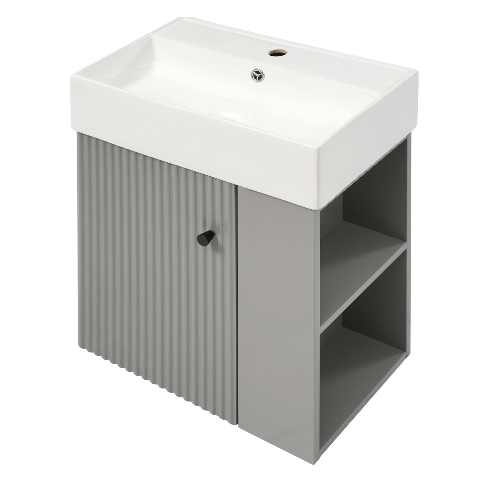 This 21.6-inch gray modern floating bathroom vanity is designed to save space while offering smart storage for compact bathrooms. It features a high-quality ceramic sink with an overflow hole and a pre-drilled single faucet hole for easy installation, plus an under-sink cabinet and open right-side shelves for organized storage. Crafted from durable MDF with a painted finish and fitted with a corrosion-resistant aluminum alloy handle, it combines modern style with long-lasting functionality. The soft-close door ensures quiet operation, while the wall-mounted design maximizes floor space.