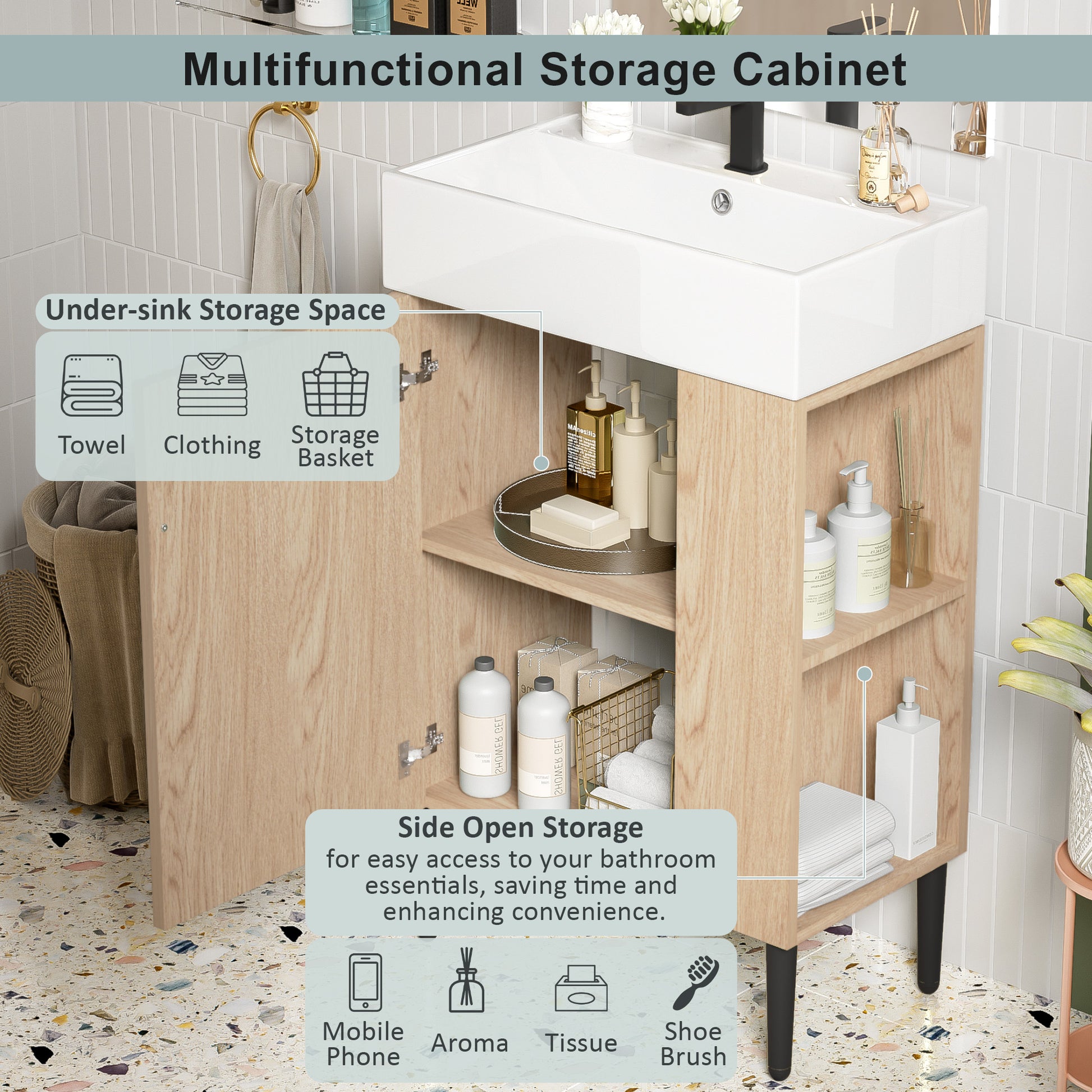 This 21.6-inch wood bathroom vanity is designed to maximize functionality in compact spaces while adding a modern, stylish touch to your bathroom. It features a high-quality ceramic sink with an overflow hole and water barrier edges to prevent spills, as well as a triple-coat finish for long-lasting moisture resistance. The vanity offers a spacious cabinet with an internal shelf for storing toiletries and towels, plus a convenient right-side storage pocket for quick access to everyday items.