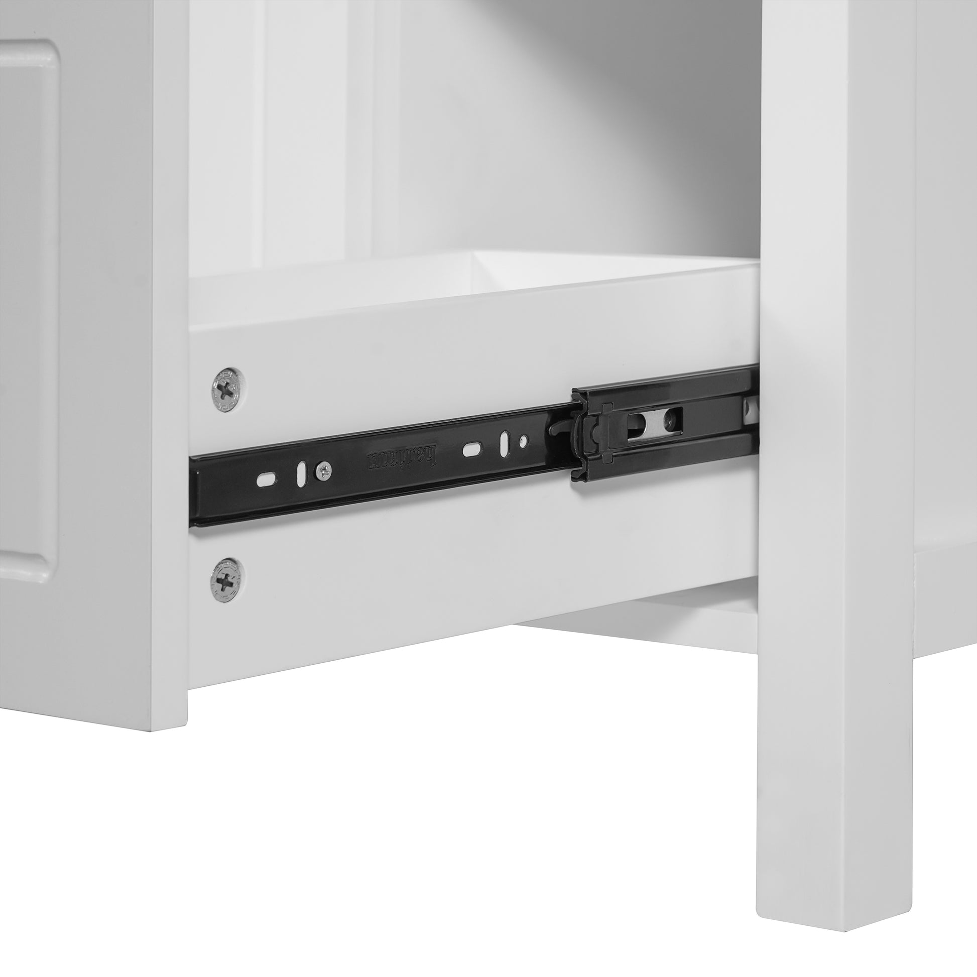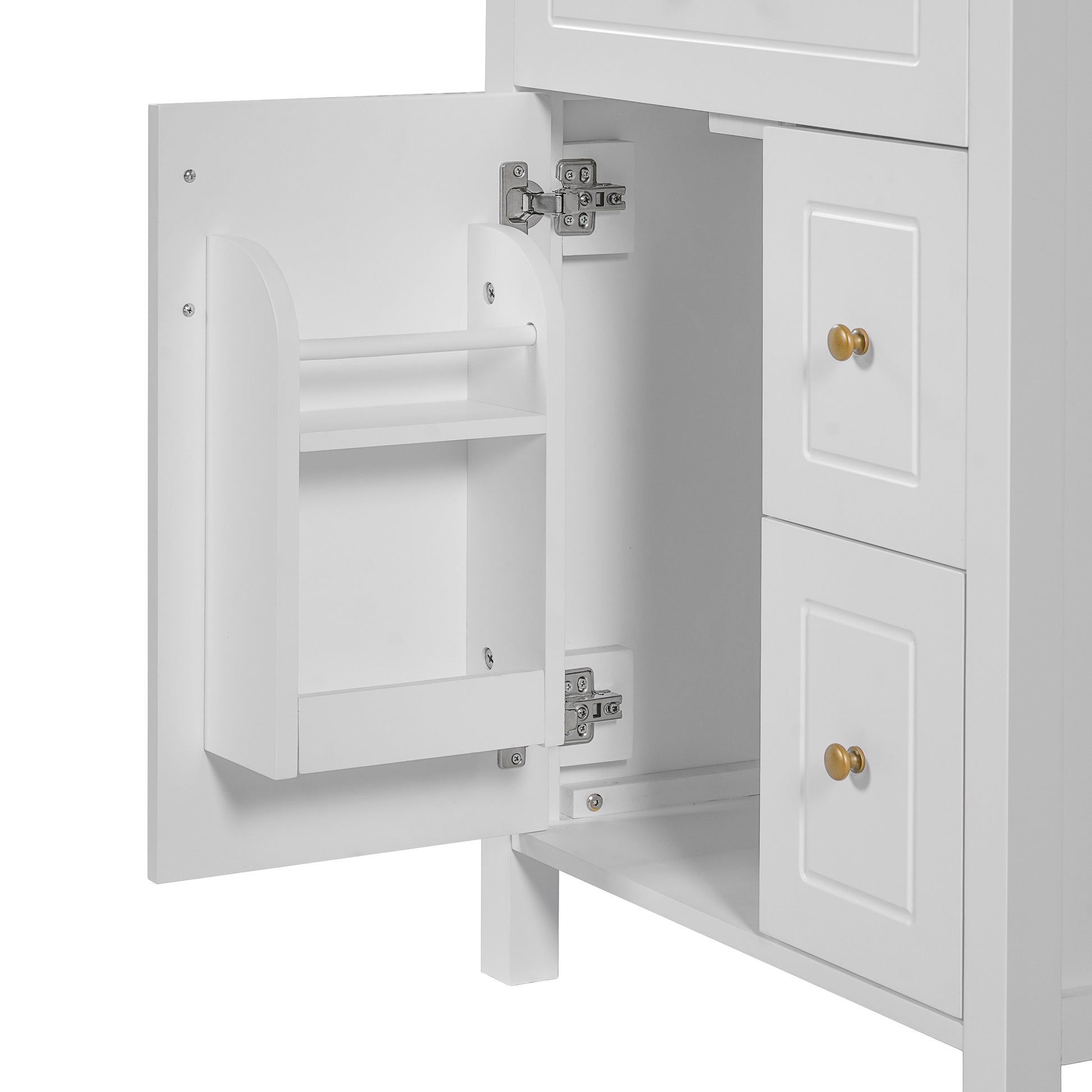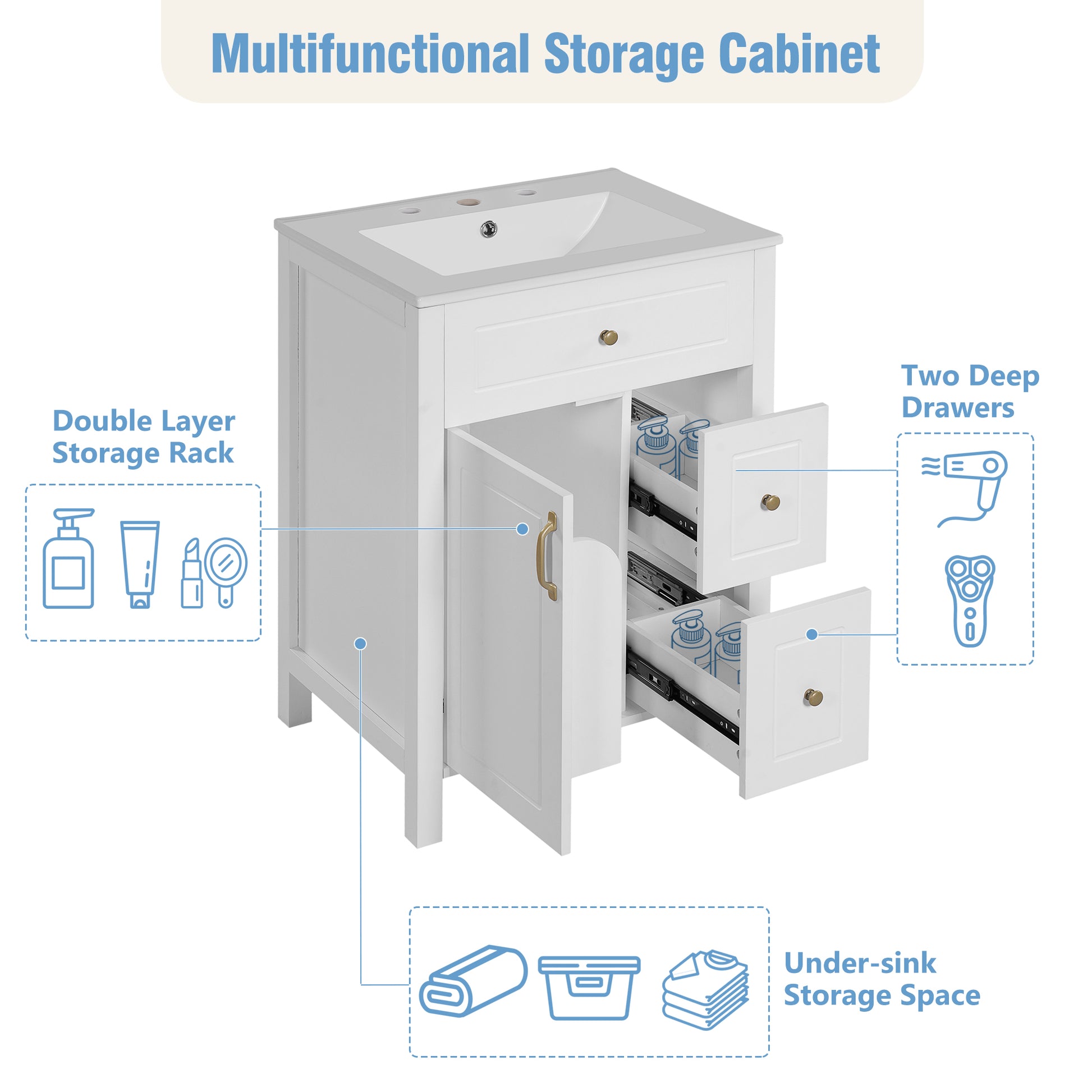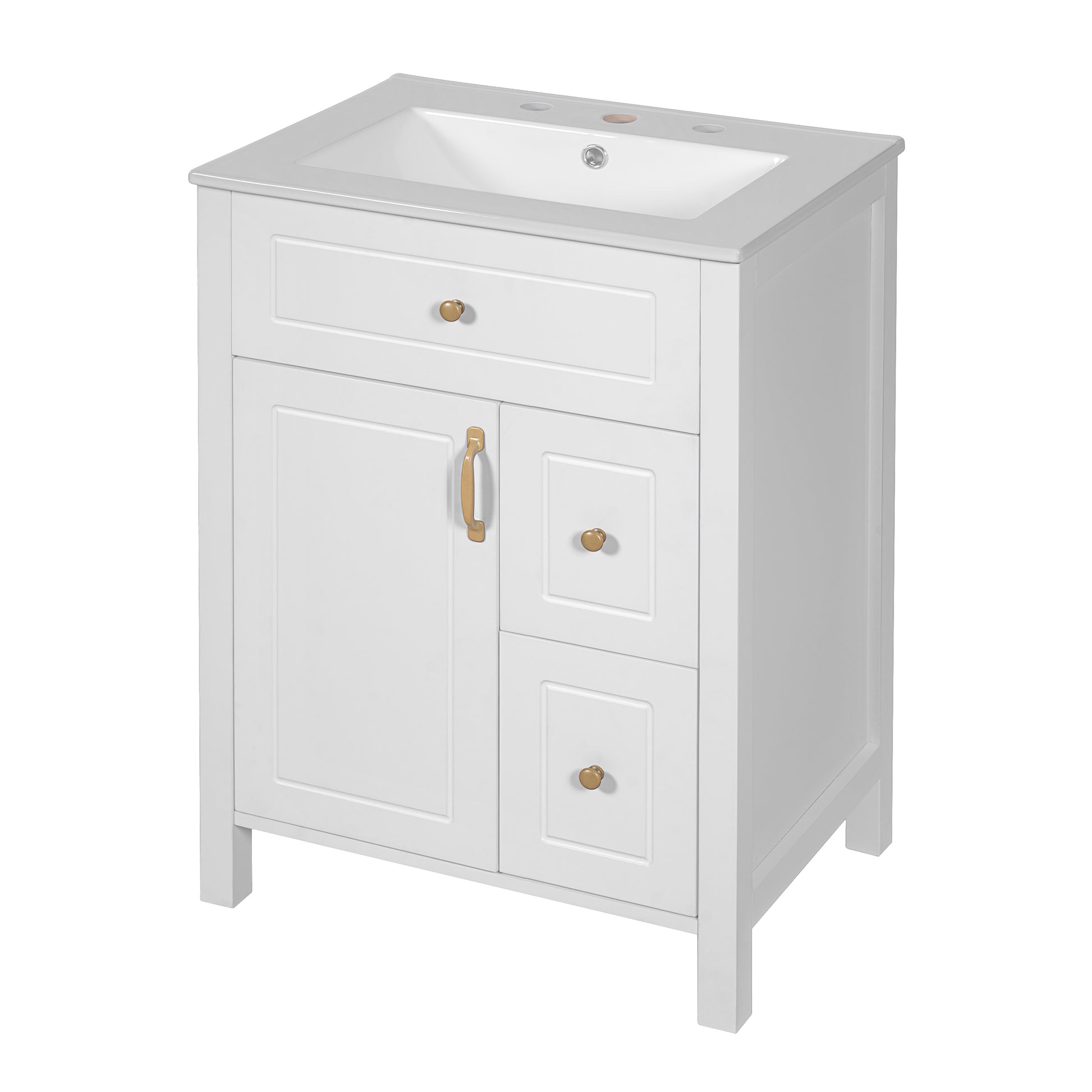 This 24-inch white bathroom vanity combines elegance, practicality, and durability to enhance your daily routine. Featuring a smooth, easy-to-clean ceramic sink with overflow protection, it offers both style and convenience. With a solid wood frame, MDF panels, two soft-close drawers, a soft-close door, and double door storage racks, this vanity maximizes space while keeping your bathroom organized.