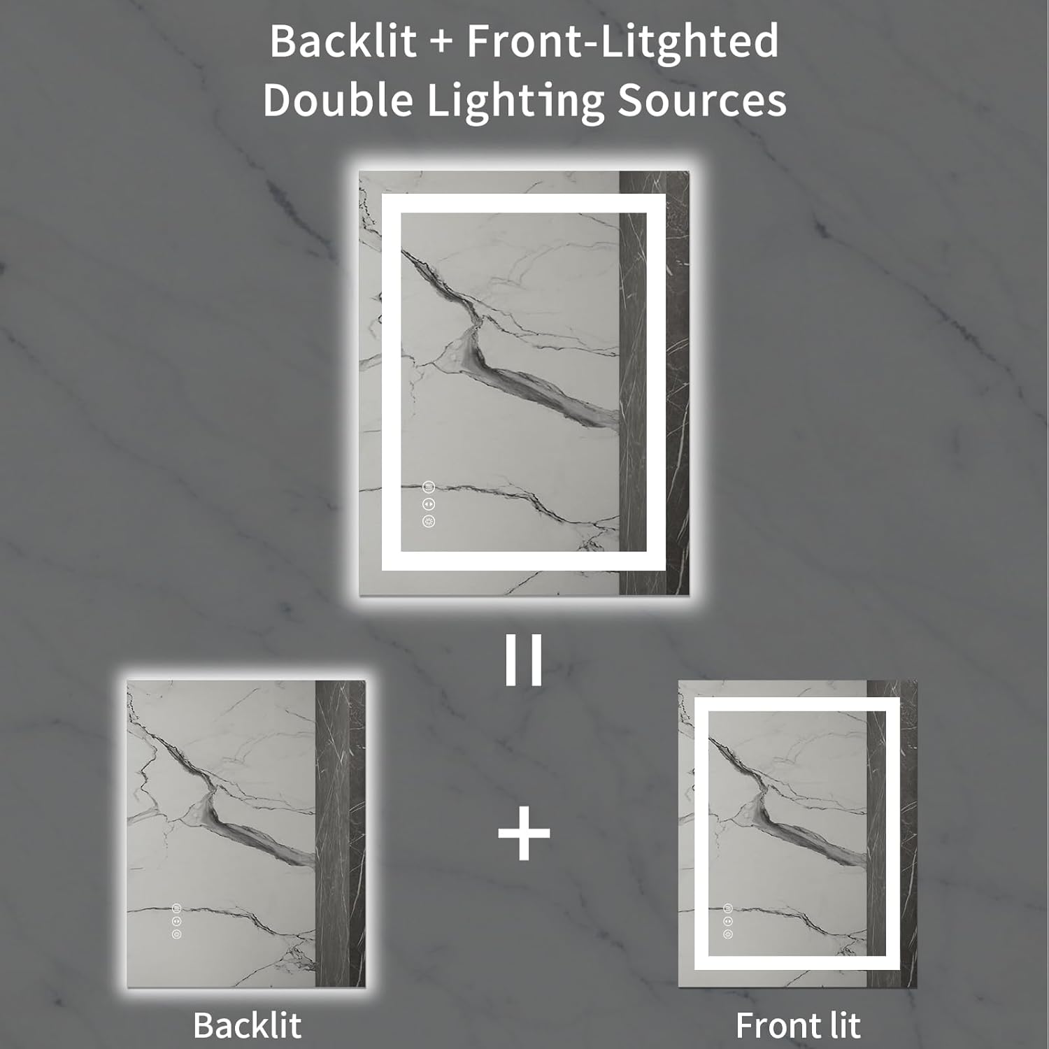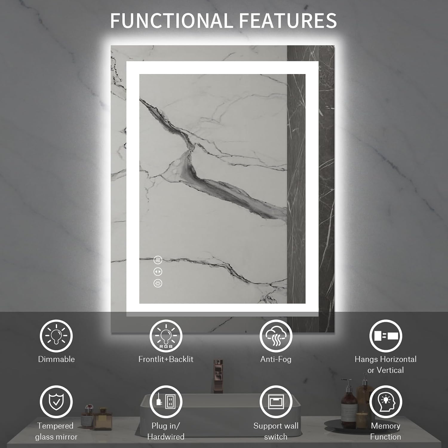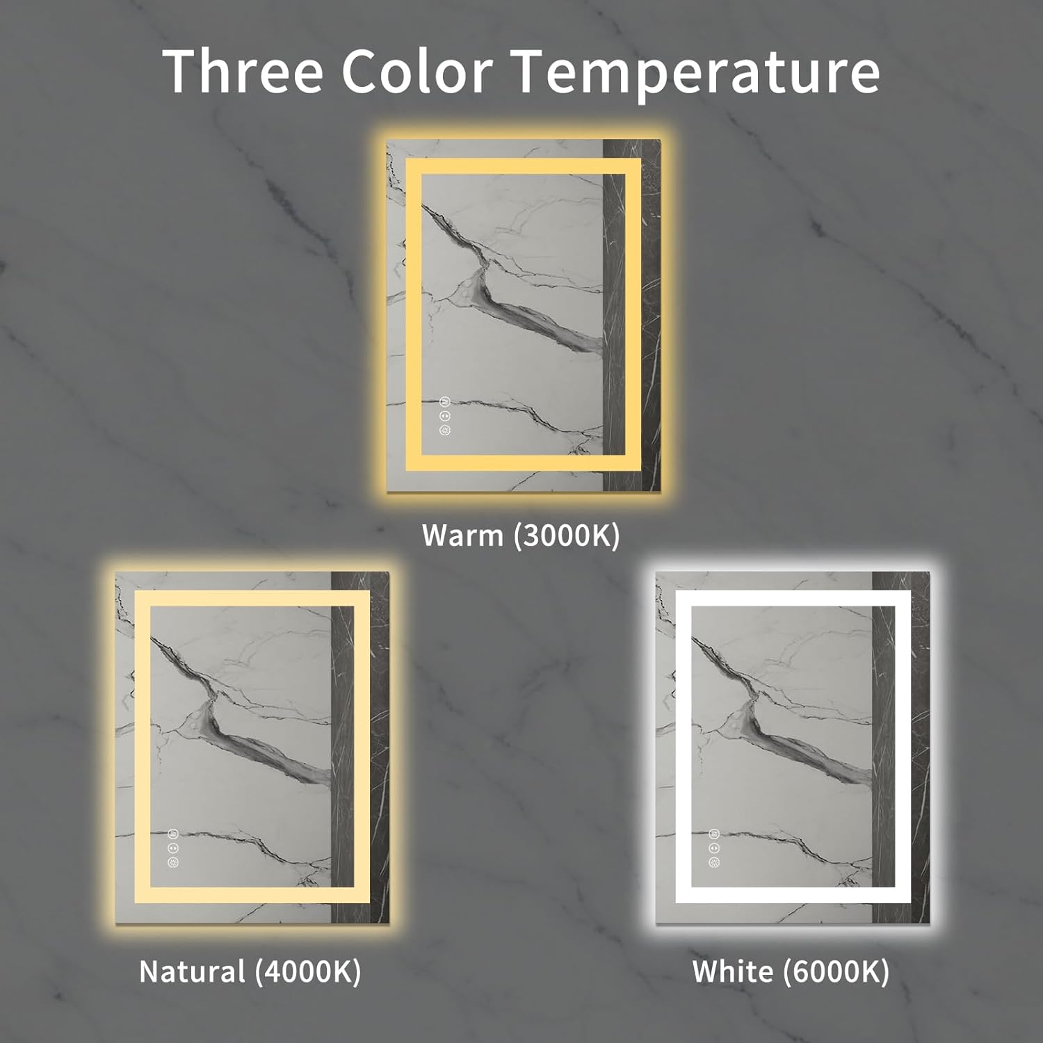 Upgrade your bathroom with this 28x36 inch IP54 waterproof vanity mirror, designed with front and backlit LED lighting, touch controls, and a built-in anti-fog function. The mirror offers infinitely dimmable brightness from 10%–100% and three adjustable color temperatures (3000K/4500K/6000K) with high lumen output and CRI 95 for natural, vivid reflection. Its integrated design features power and anti-fog switches, wall switch compatibility, and memory function for added convenience. Built with UL-certified components, copper-free silver glass, and 5mm tempered glass, it provides safety, durability, and an LED lifespan of over 50,000 hours. Easy to install with upgraded protective packaging and included mounting hardware.