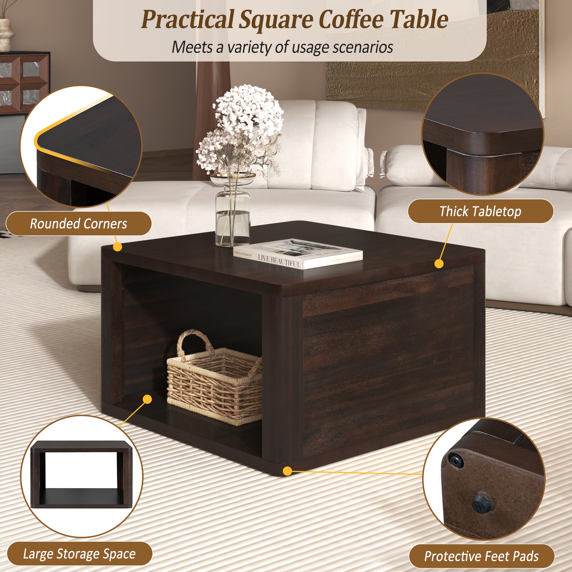 This dark brown farmhouse coffee table adds rustic charm and rich wood texture to your living room. Designed with two tier storage and a half open compartment it provides both hidden storage and display space to help keep your home tidy and organized. Built with durable MDF and acacia veneer this table offers long lasting stability for everyday use. Its 30.8 inch square size fits seamlessly into both small and large rooms creating a warm and functional centerpiece for any living space.