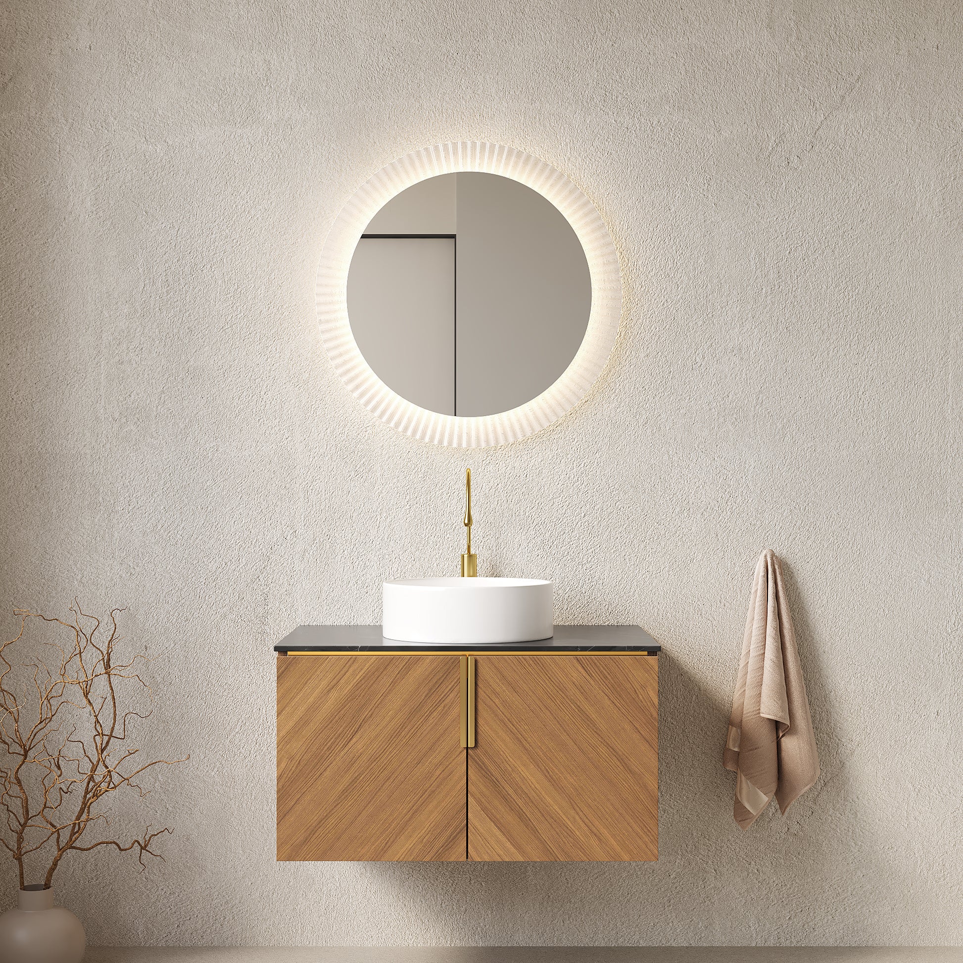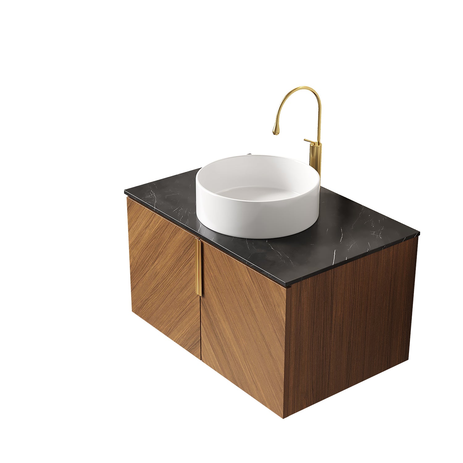 This bathroom vanity comes with a 14-inch glossy white round ceramic vessel sink, crafted from high-hardness ceramic that offers excellent durability, stain resistance, and easy maintenance for long-term use. The countertop is made of high-hardness sintered stone with superior water and moisture resistance for lasting performance. *Please note: faucet mounting hole size is 1.38'', a faucet with a spout height ≥9'' is recommended, and a sink drain stopper without overflow hole is suggested. The cabinet features a brown oak grain finish with uniquely designed symmetrical diagonal textures on the doors, paired with brushed gold metal handles that exude elegance and charm. Made of premium plywood, the cabinet ensures excellent water and moisture resistance, preventing deformation or mold even in humid bathrooms. *Please note: color and grain patterns may vary under different lighting conditions. The double-door design provides ample storage space for bathroom essentials, while the built-in soft-close damper ensures quiet and smooth door operation. This bathroom vanity comes flat-packed and requires self-assembly, but it includes a detailed, easy-to-follow installation manual. The assembly process is simple and does not require professional skills. Available in two sizes (30"/60"), this vanity is designed to meet the needs of different households and bathroom spaces.