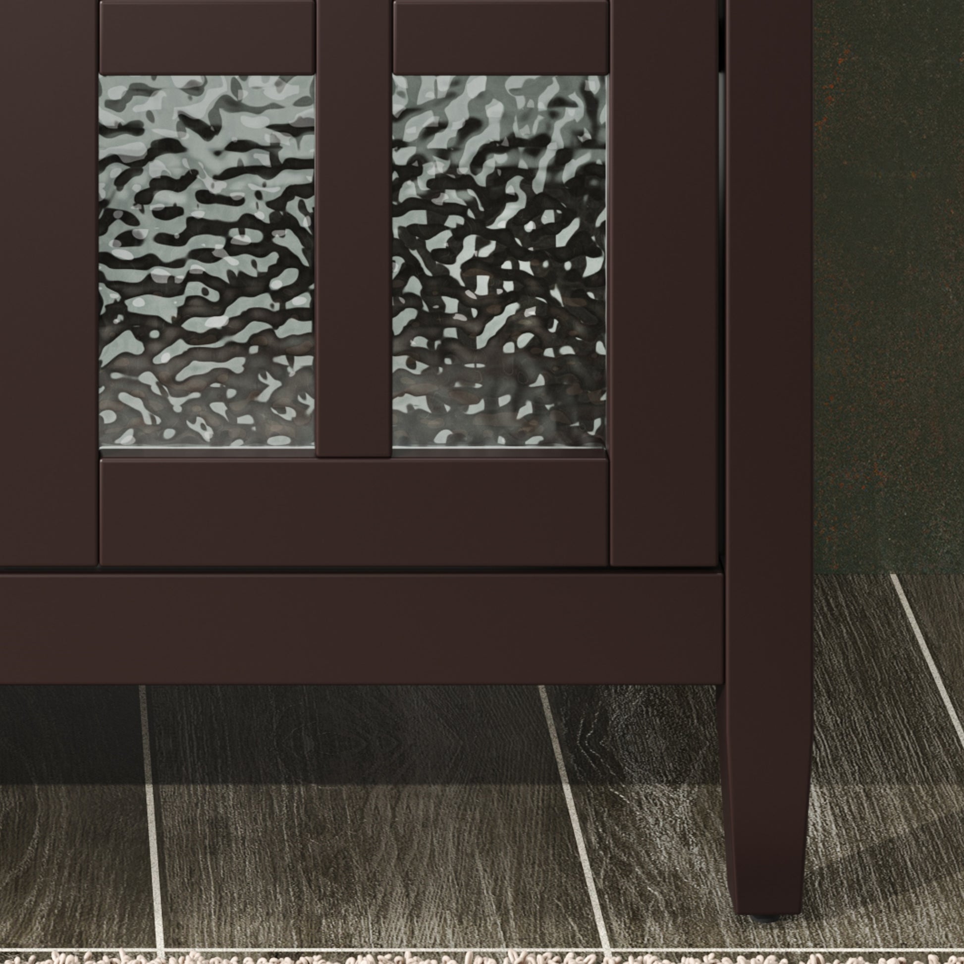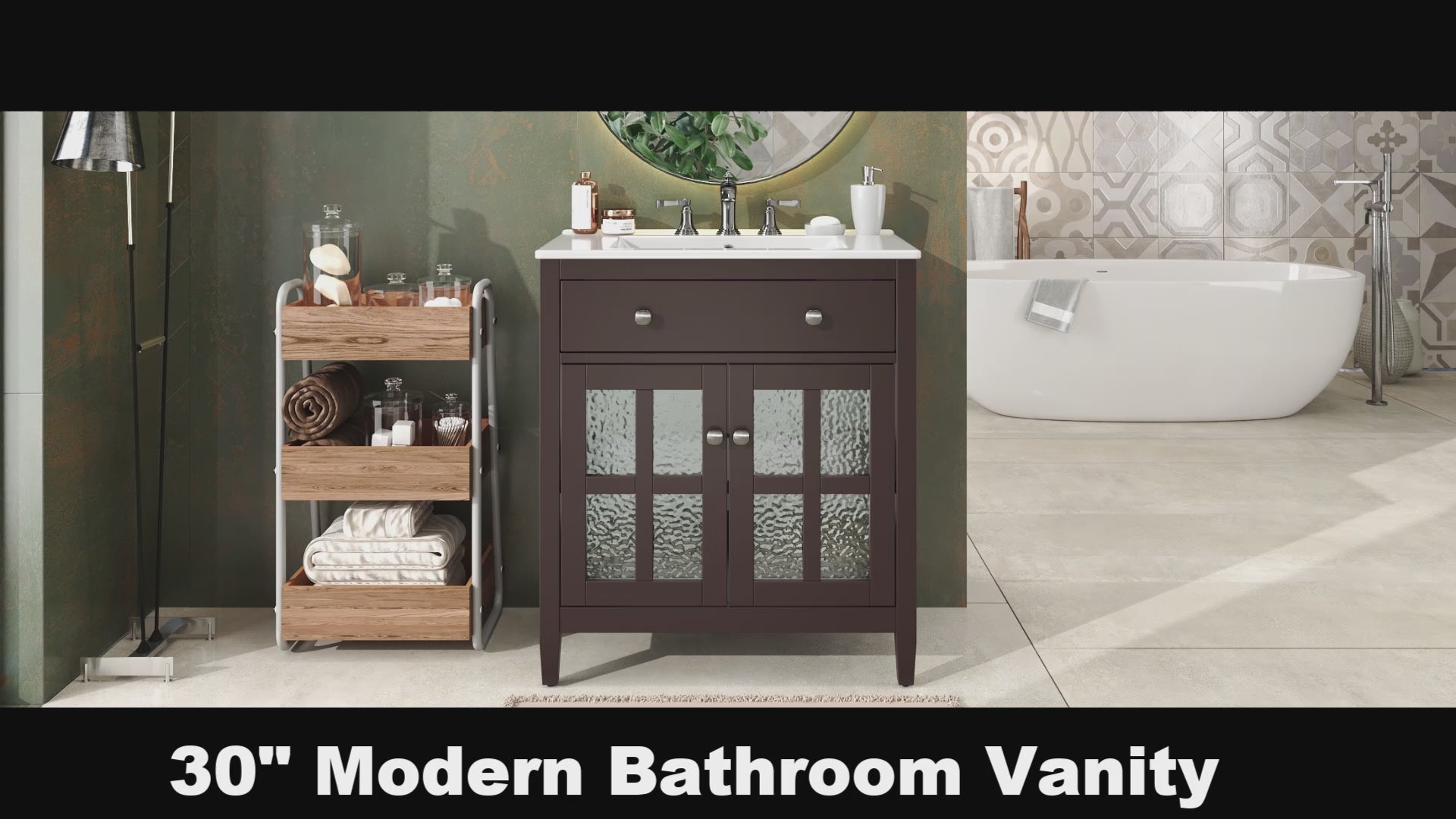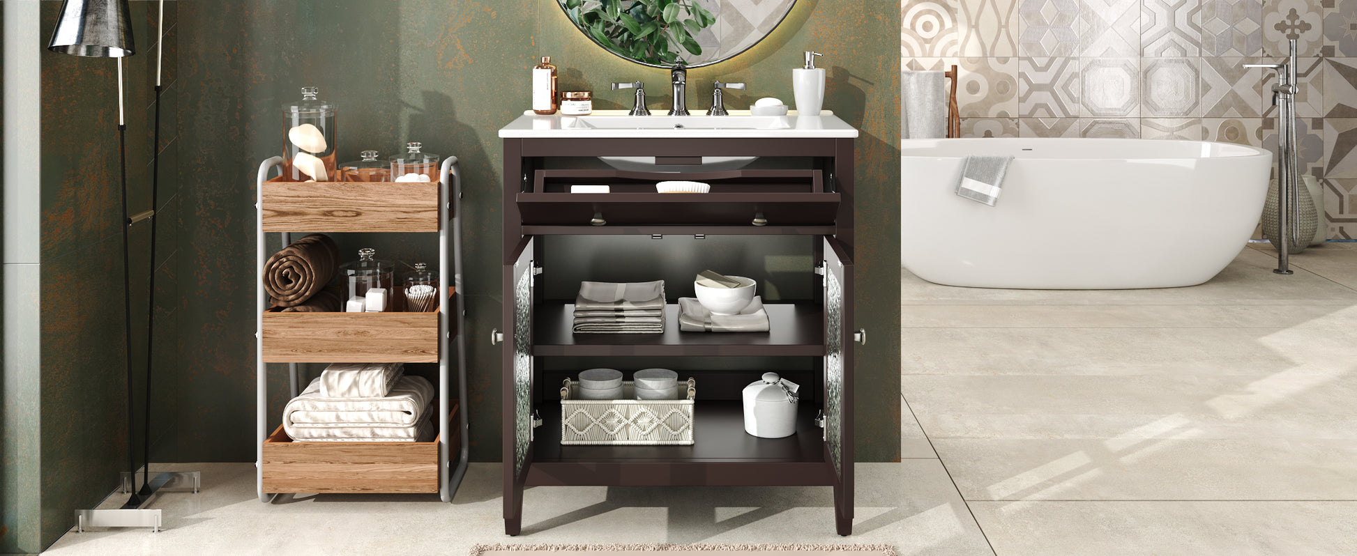 30 Inch Bathroom Vanity with Ceramic Sink Adjustable Shelf Tip Out Tray Solid Wood Legs Dark Brown