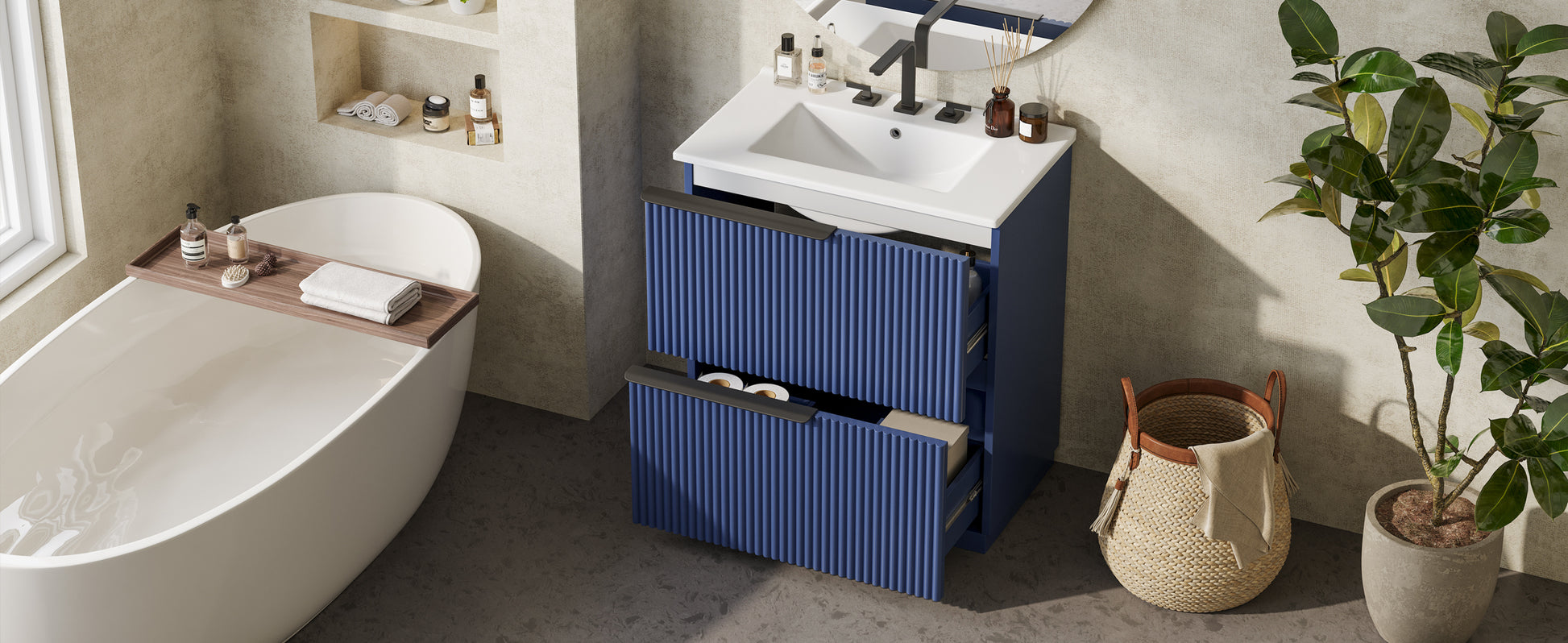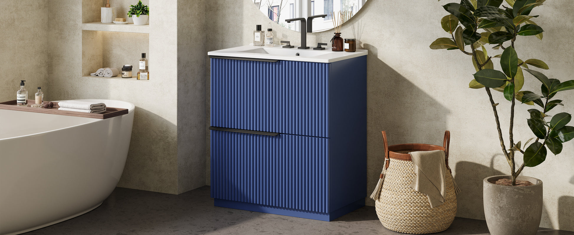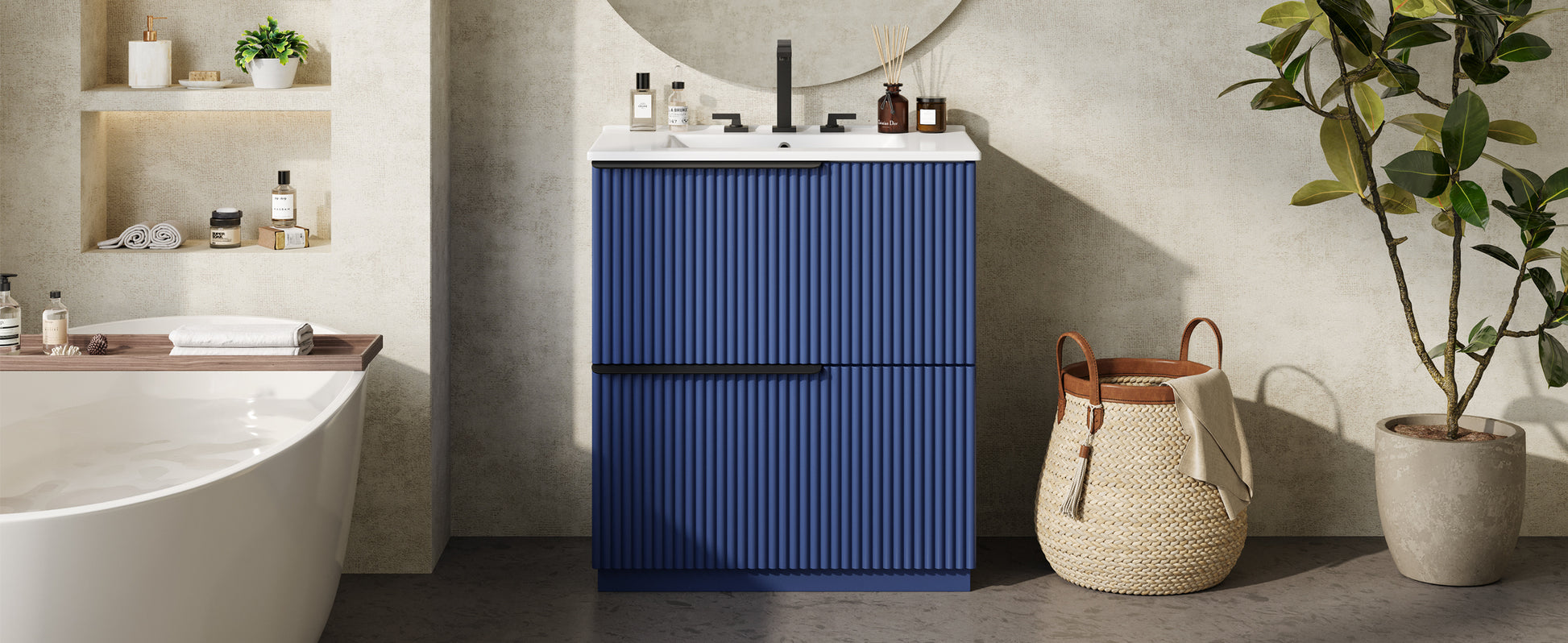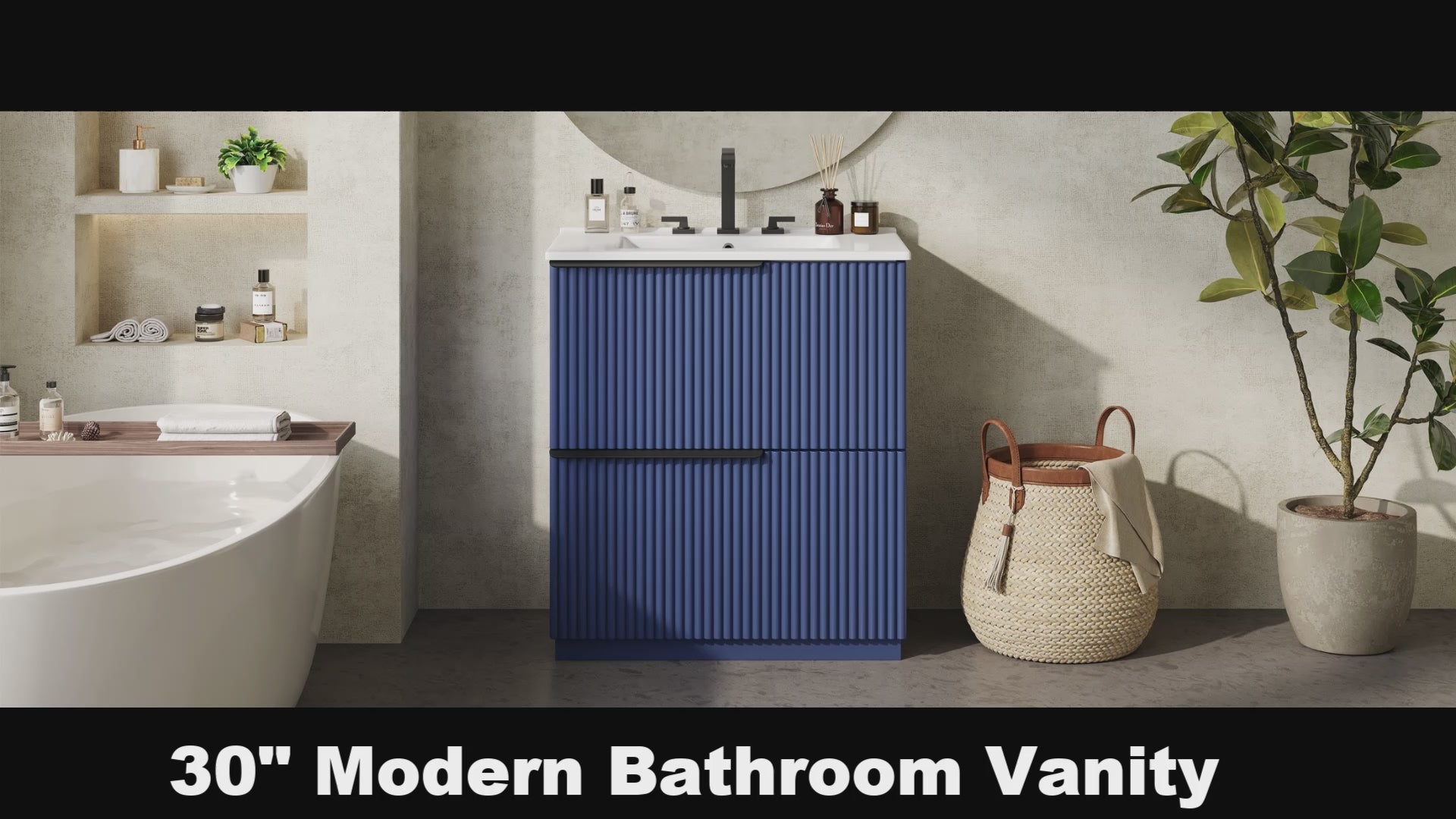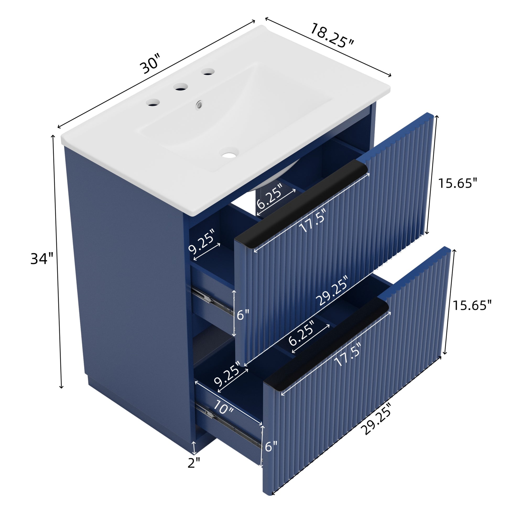 30 Inch Bathroom Vanity with Ceramic Sink Full Extension Drawers Soft Close Fluted Design Blue