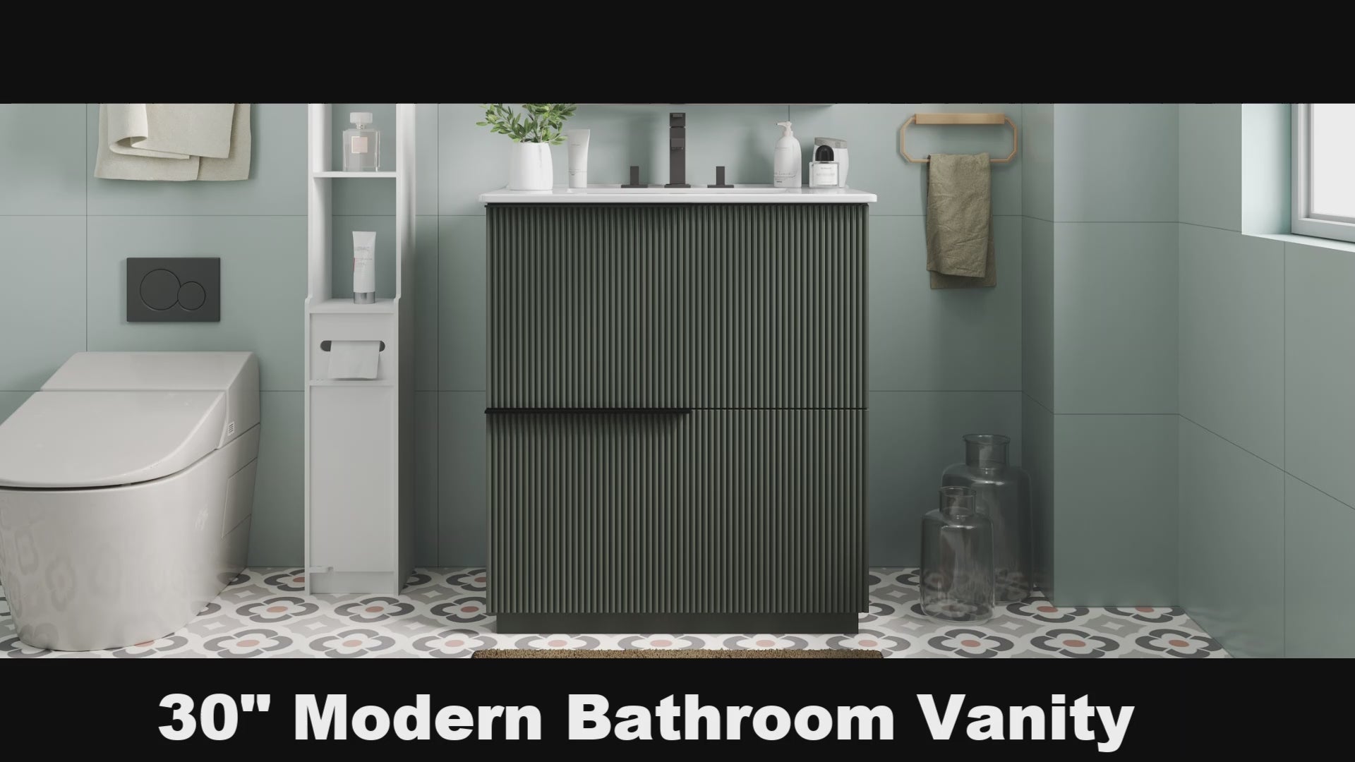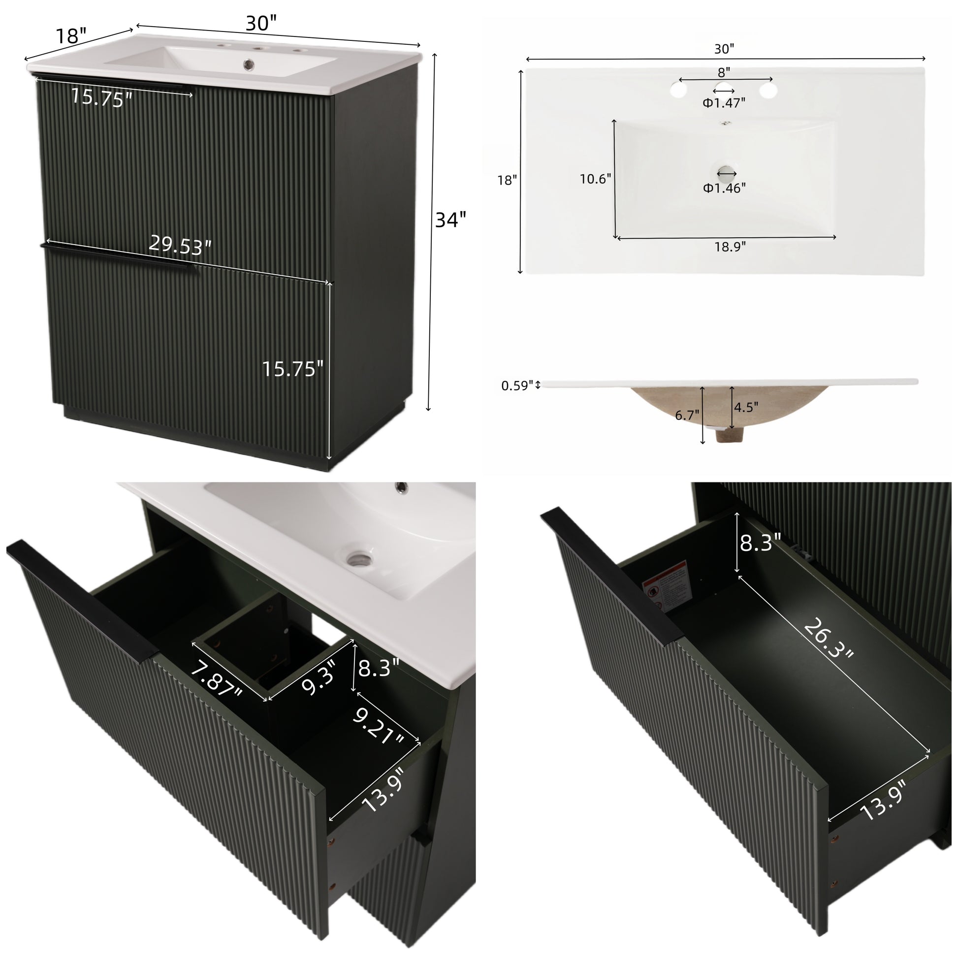 This 30-inch bathroom vanity features a high-quality white ceramic sink with a glossy, stain- and scratch-resistant surface that is easy to clean and designed with a deep basin to reduce splashing. It is equipped with soft-close undermount drawer slides that maximize storage space, provide full-extension access, and ensure durability. The handcrafted fluted design adds elegance and depth, while sleek black finger pulls enhance its minimalist, modern aesthetic. With overall dimensions of 30"L × 18"W × 34"H, a weight of 103.18 lbs, and a 120 lbs weight capacity, this vanity perfectly blends style, practicality, and durability.