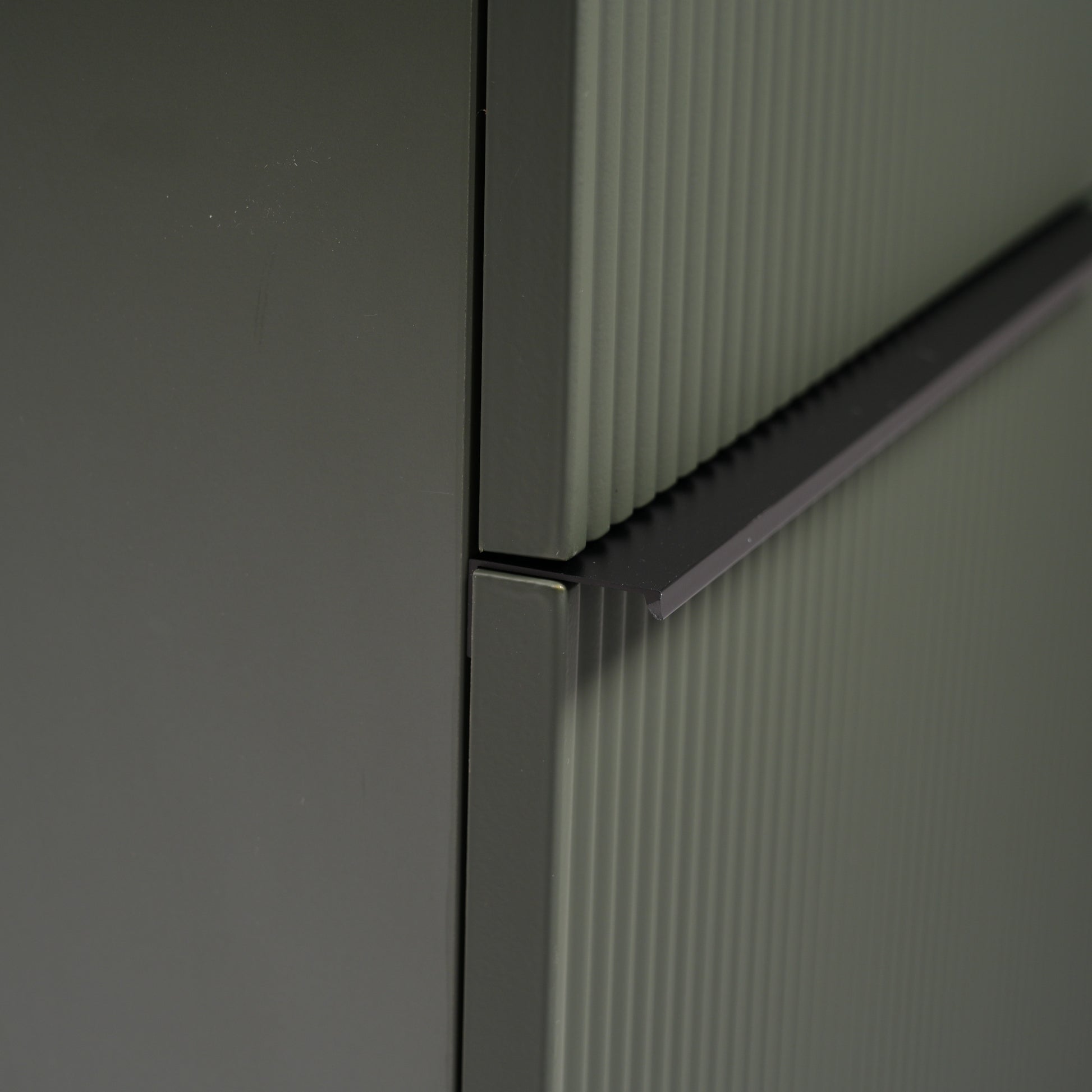 Handcrafted grooves with slim black pulls add modern elegance and resist fingerprints