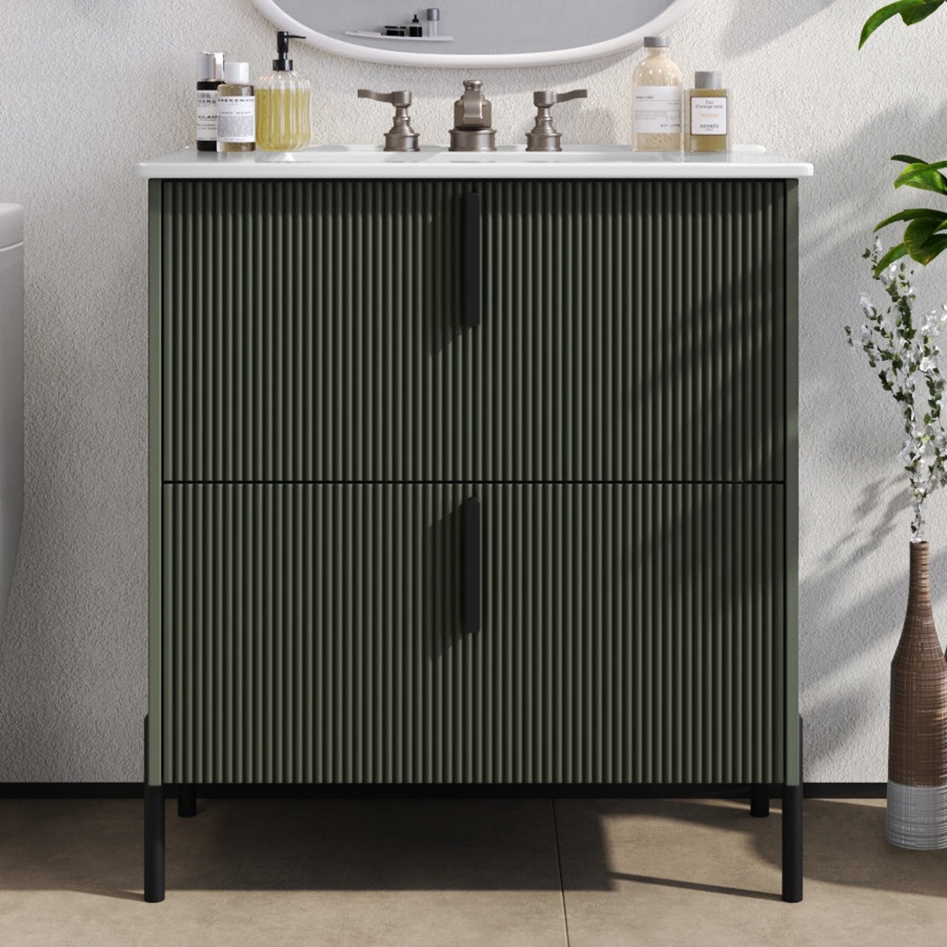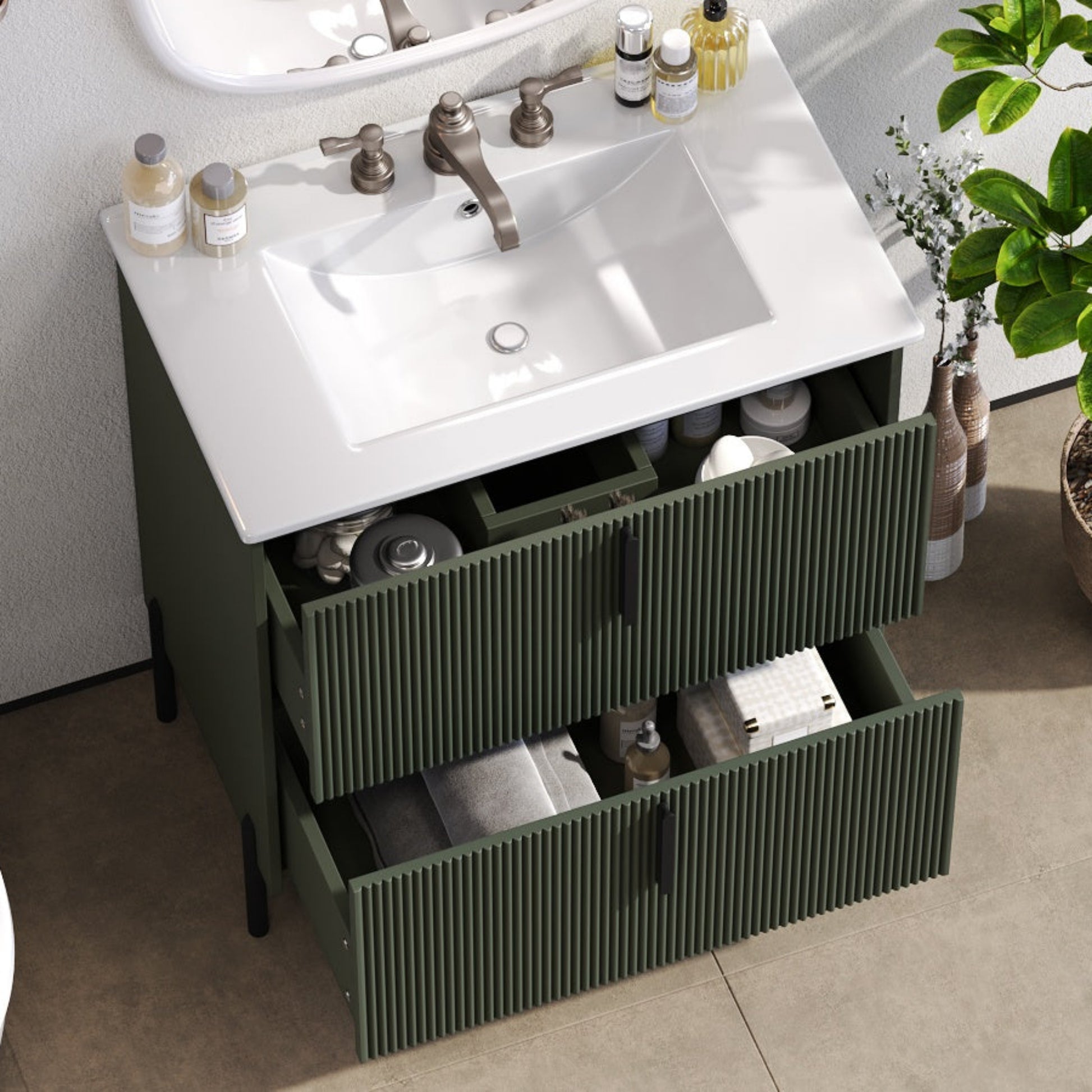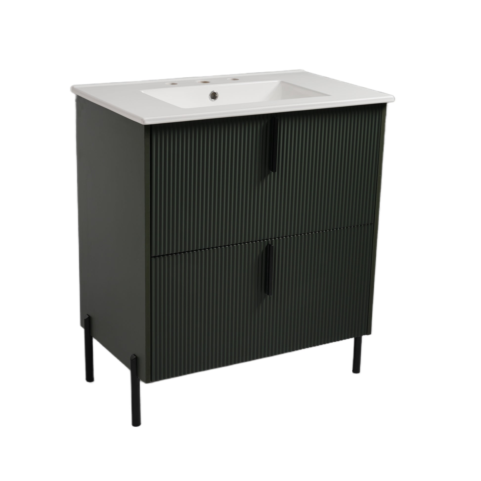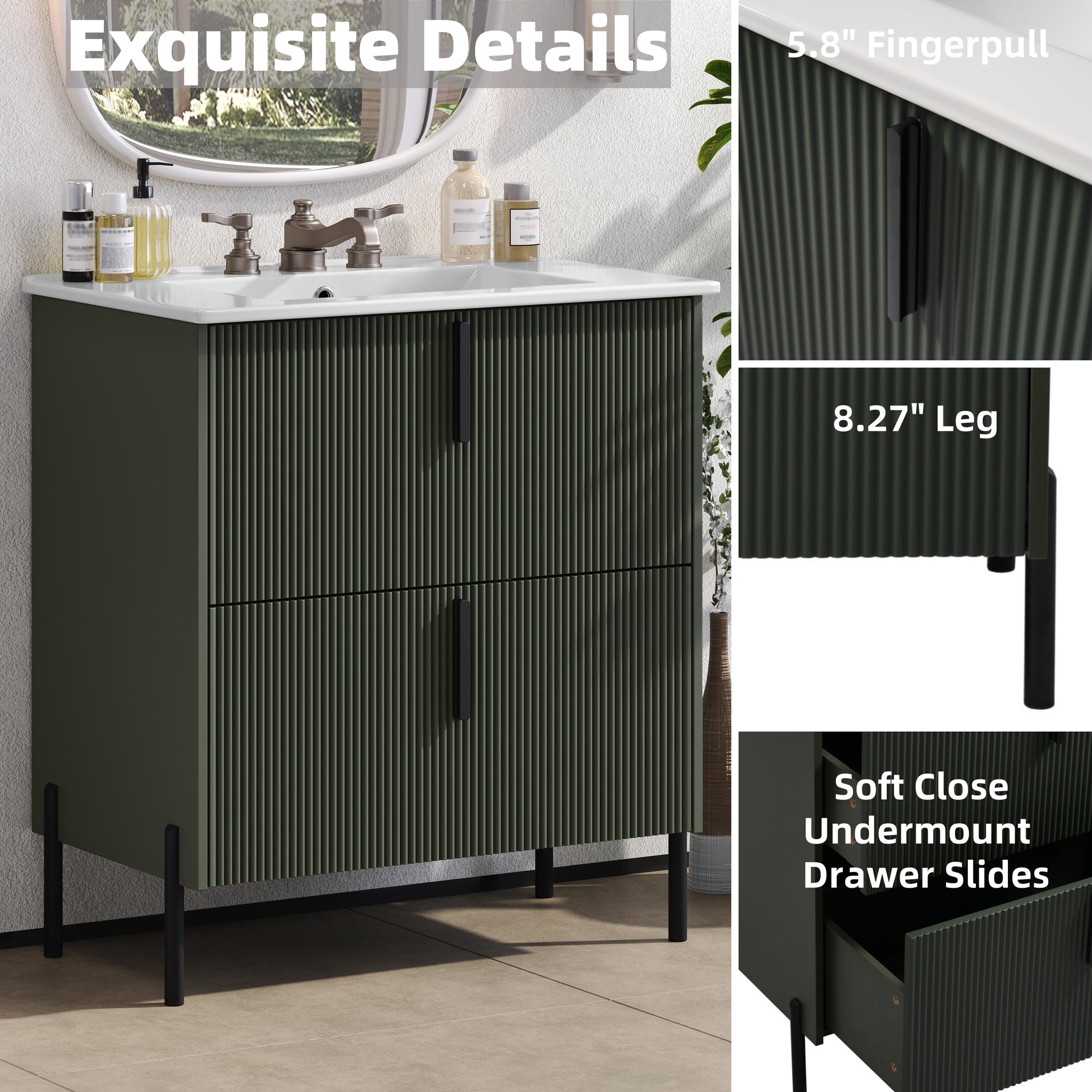 30 Inch Bathroom Vanity with Ceramic Sink Full Extension Drawers Soft Close Fluted Design Green