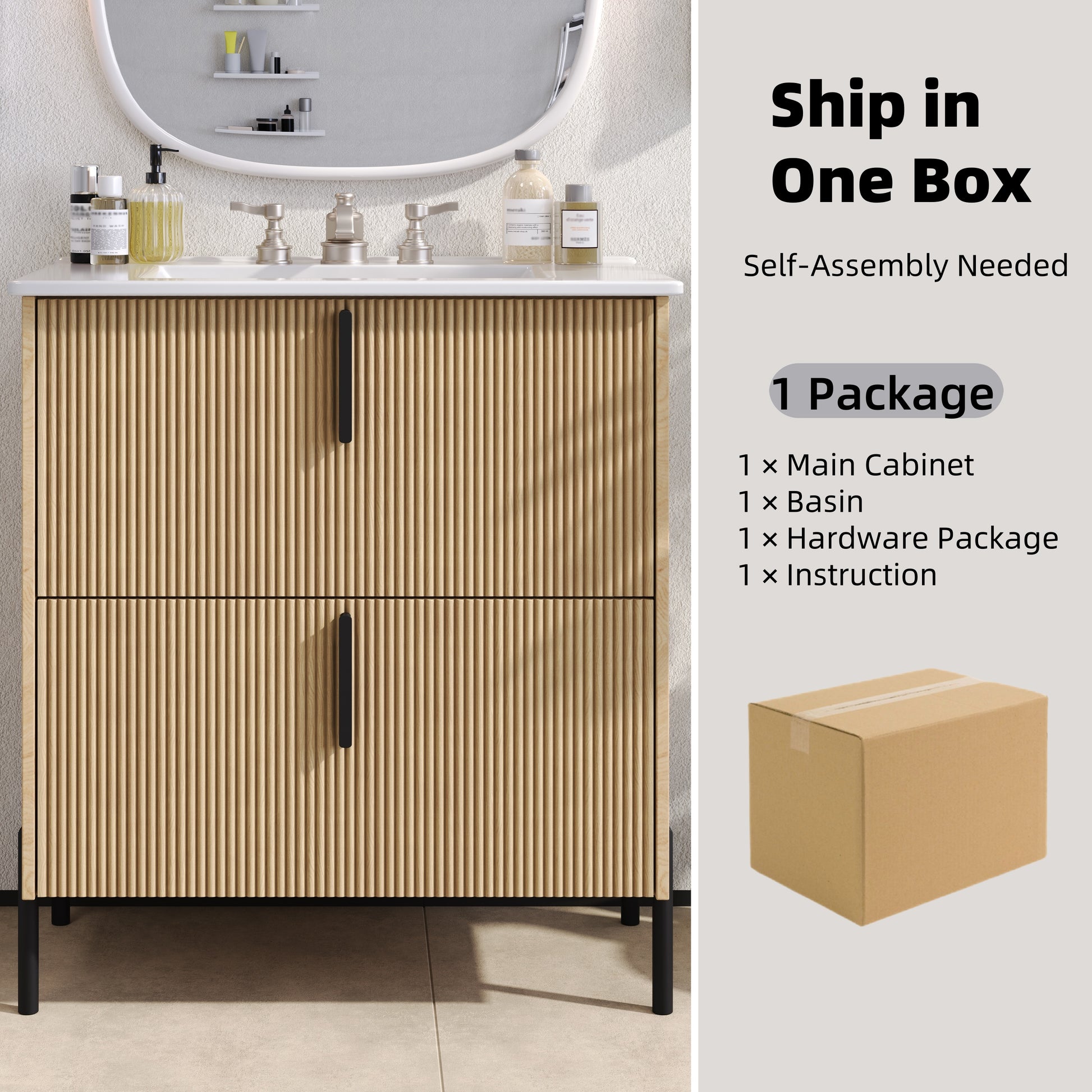 This bathroom vanity combines elegance and functionality with a high-quality ceramic sink that is glossy, durable, and easy to clean, featuring a deep basin to prevent splashing. The soft-close undermount drawer slides maximize space with full-extension access and a stable, minimalist design. Handcrafted fluted details add sophistication, while sleek black finger pulls enhance modern aesthetics. With overall dimensions of 30"L × 18"W × 34"H, a total weight of 95.68 lbs, and a weight capacity of 120 lbs, it offers durability, ample storage, and timeless style.