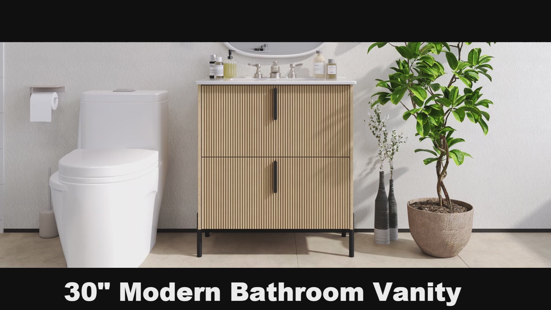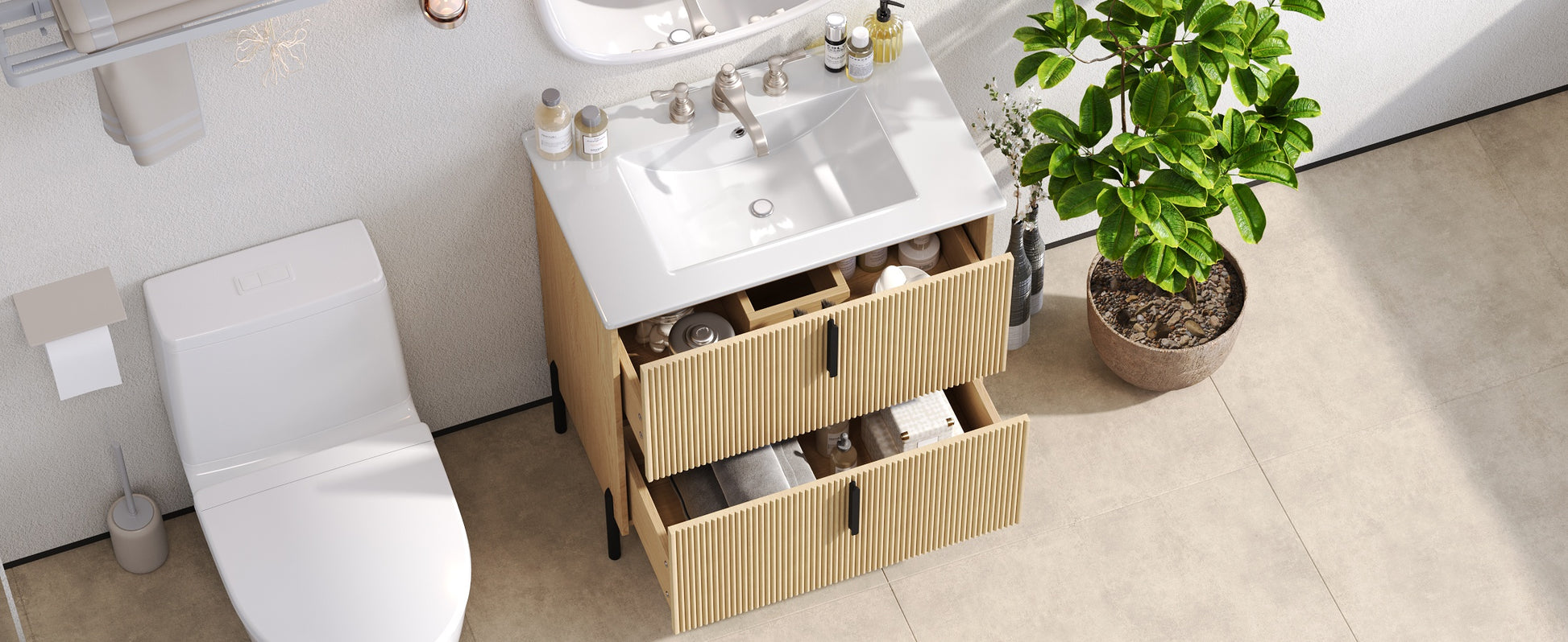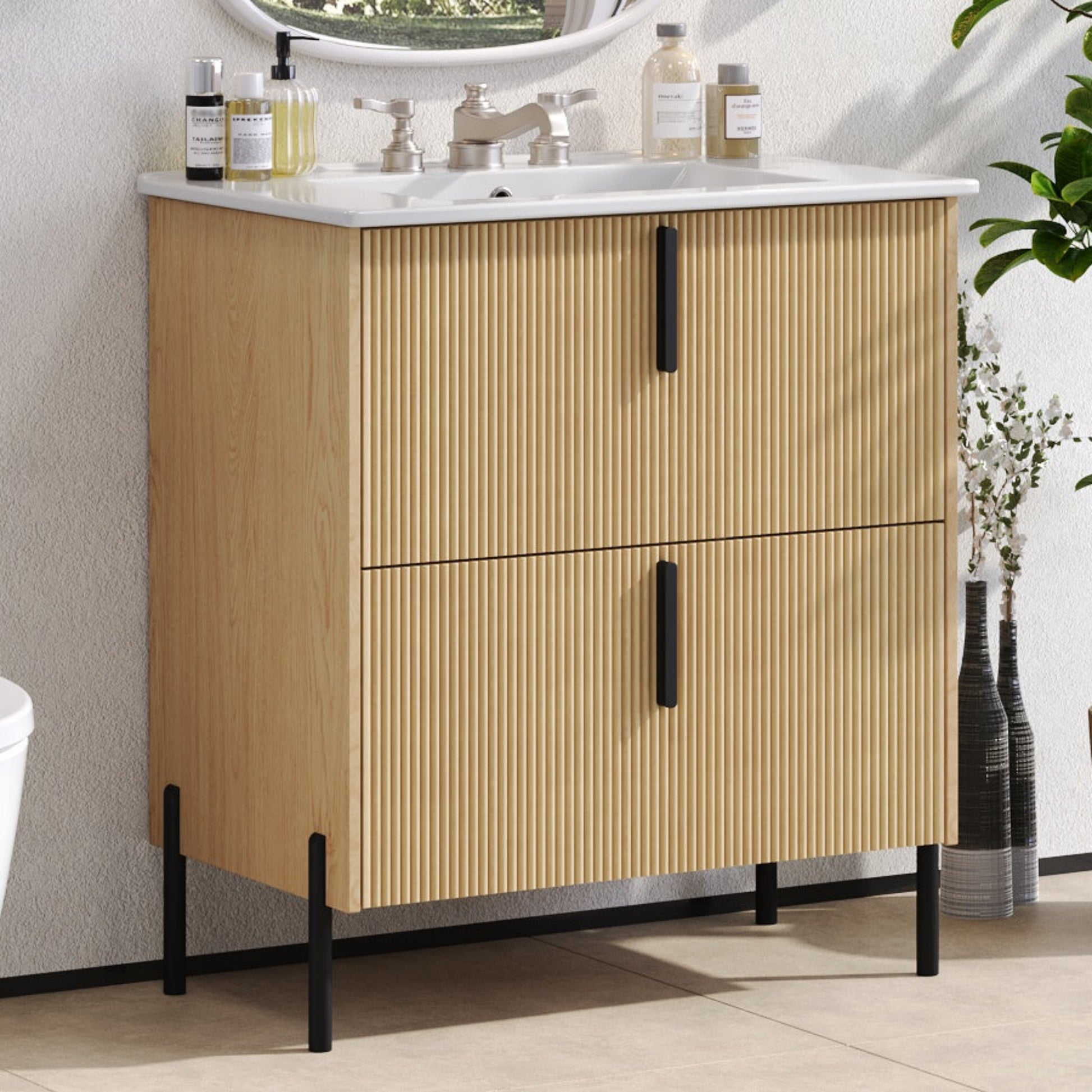 30 Inch Bathroom Vanity with Ceramic Sink Full Extension Drawers Soft Close Fluted Design Natural
