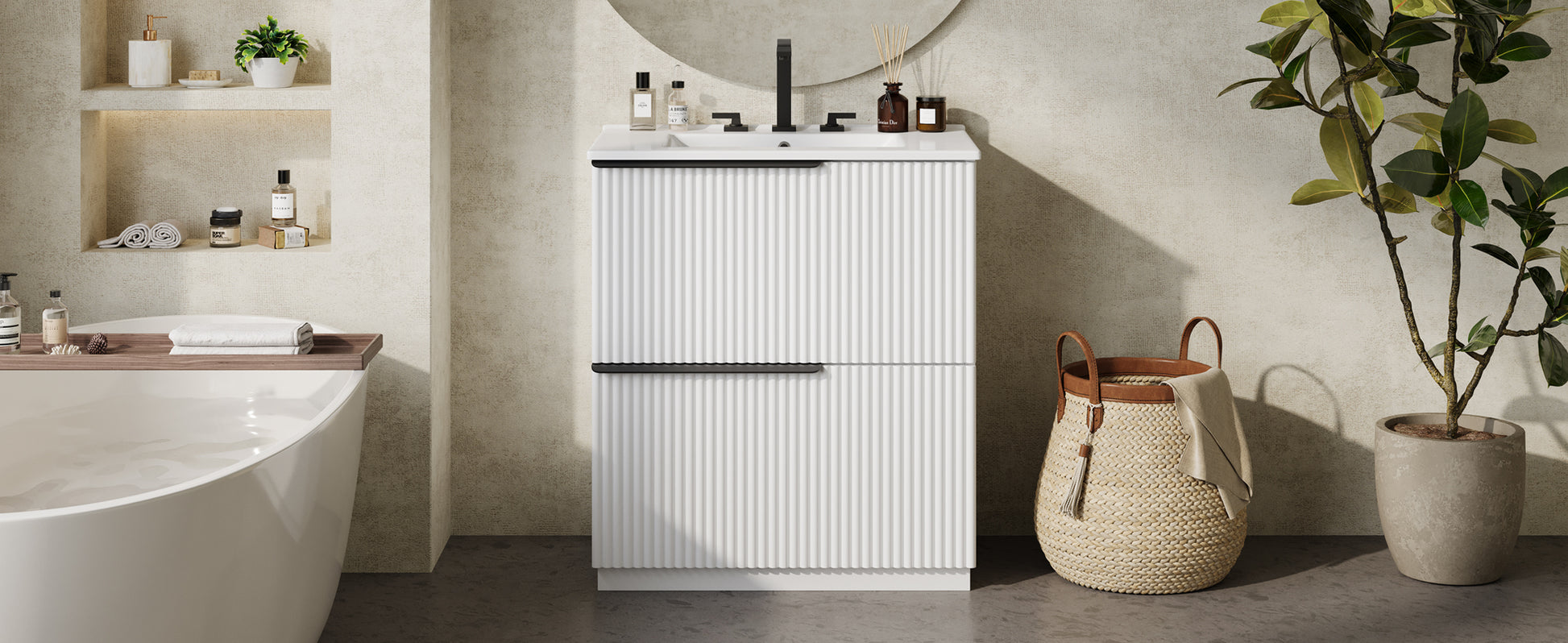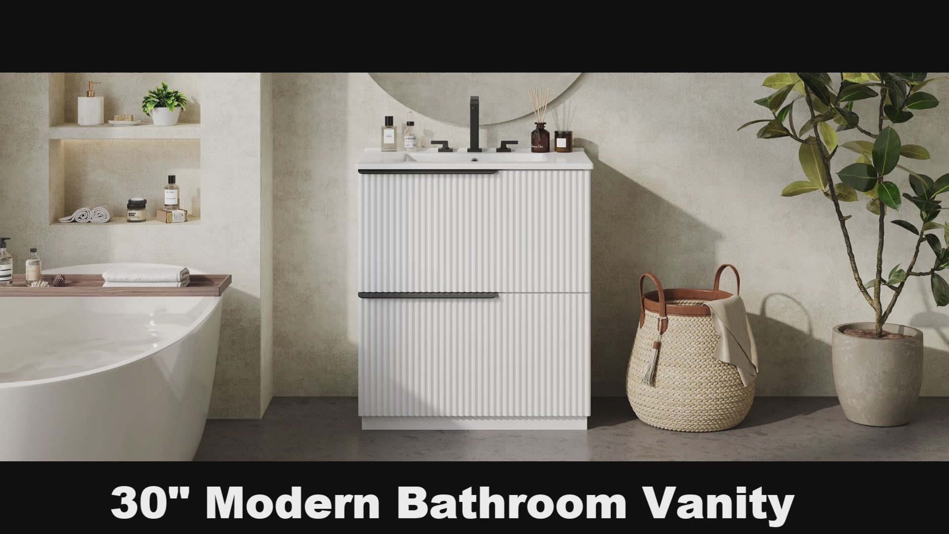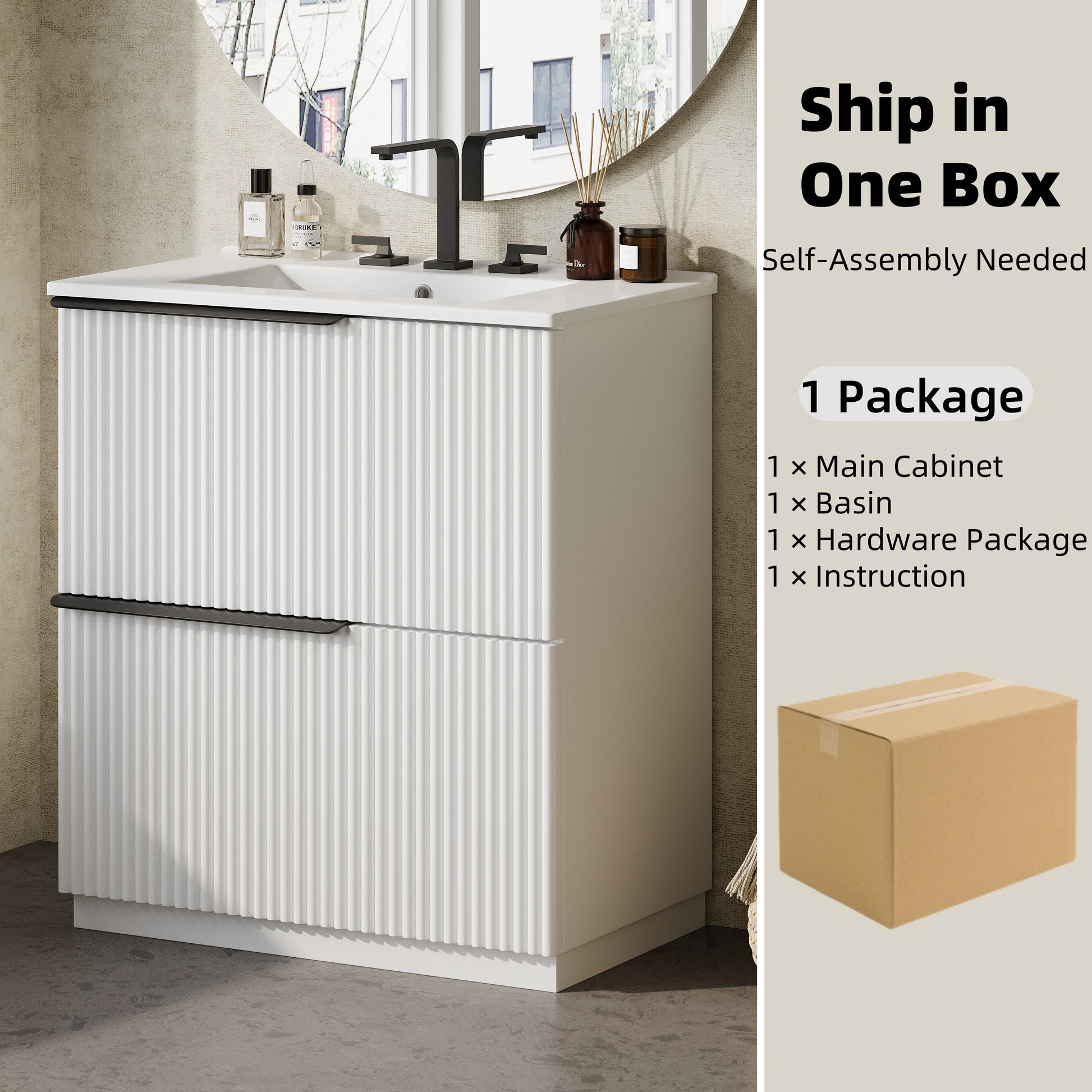 This 30" bathroom vanity combines elegant design with intelligent functionality. Shipped in one box for self-assembly, it includes the main cabinet, ceramic basin, hardware, and instructions (faucet not included). The vanity features full-extension, soft-close drawers with thoughtful partitioning for customizable organization, complemented by a 17.5" fingerpull for easy access. Its separate ceramic basin includes 8" pre-drilled faucet holes, an anti-spill hole, a glossy, easy-to-clean countertop, and a 6" deep basin for daily convenience. Built with a moisture-proof structure and a fluted artisan design, it offers both durability and timeless texture. A connecting panel between drawers maintains a clean, seamless facade while concealing smart interior storage. Measuring 30"L × 18.25"W × 34"H overall and weighing 99.21 lbs, this vanity supports up to 120 lbs, making it a functional, durable, and stylish addition to modern or vintage-inspired bathrooms.