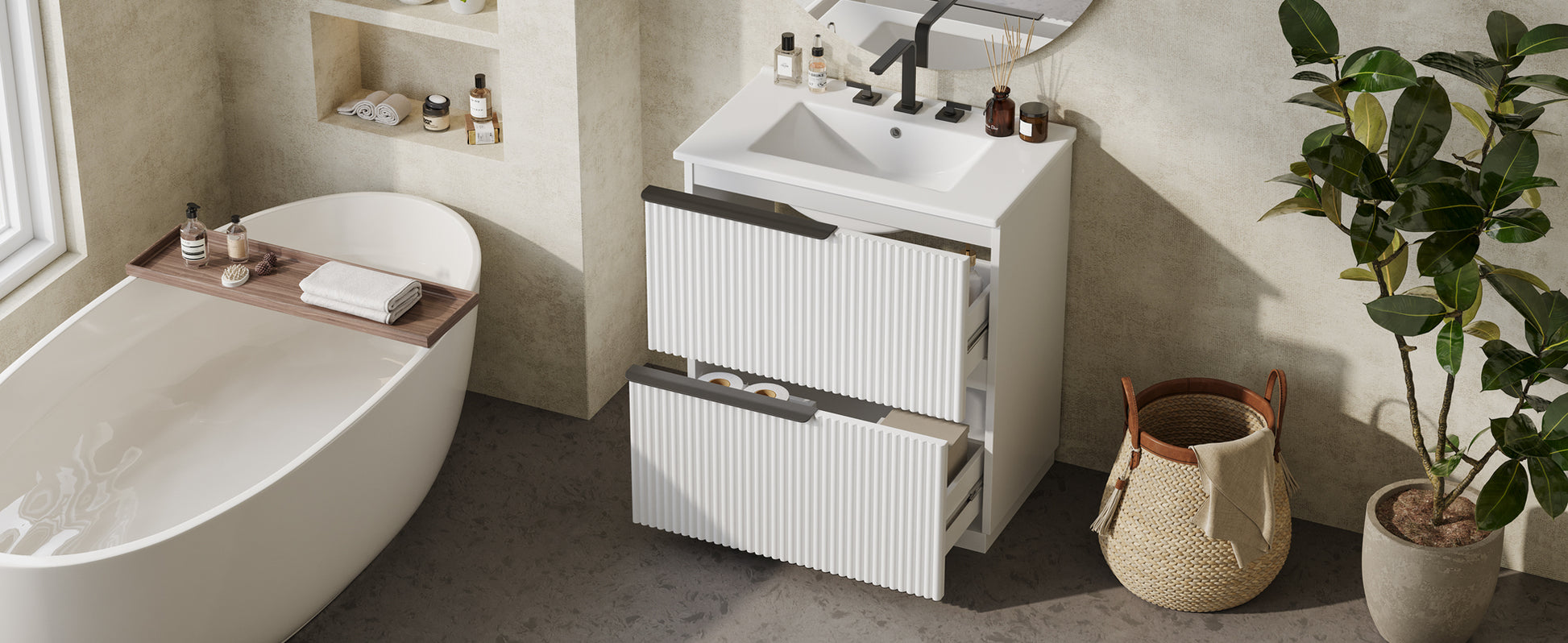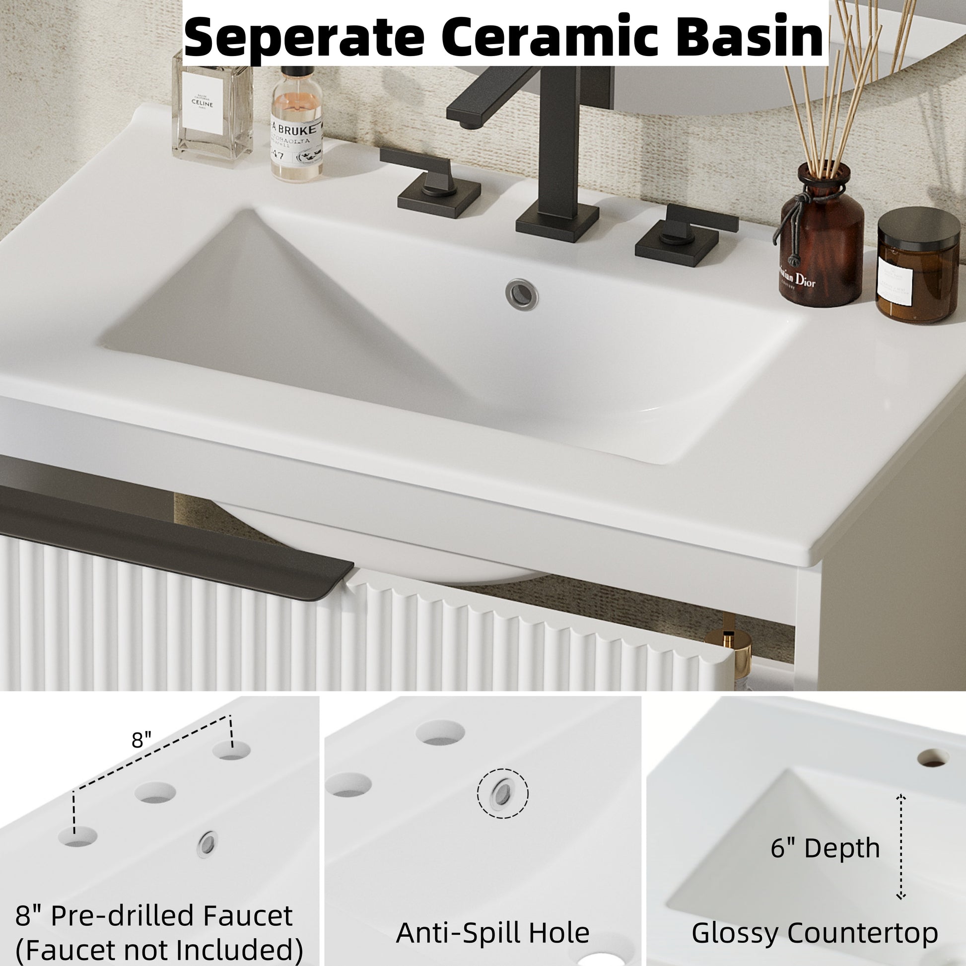 30 Inch Bathroom Vanity with Ceramic Sink Full Extension Drawers Soft Close Fluted Design White