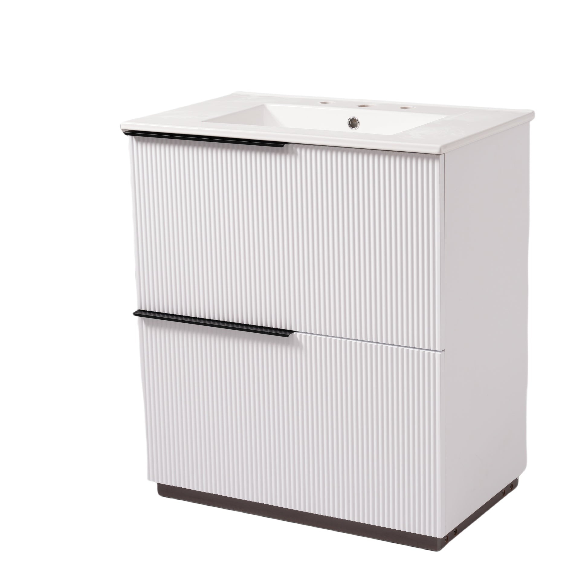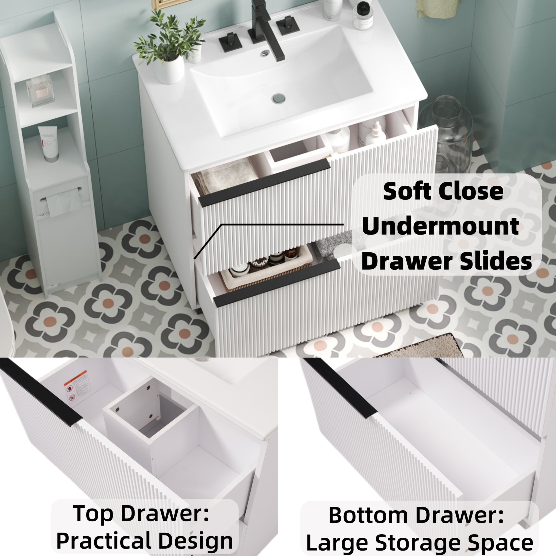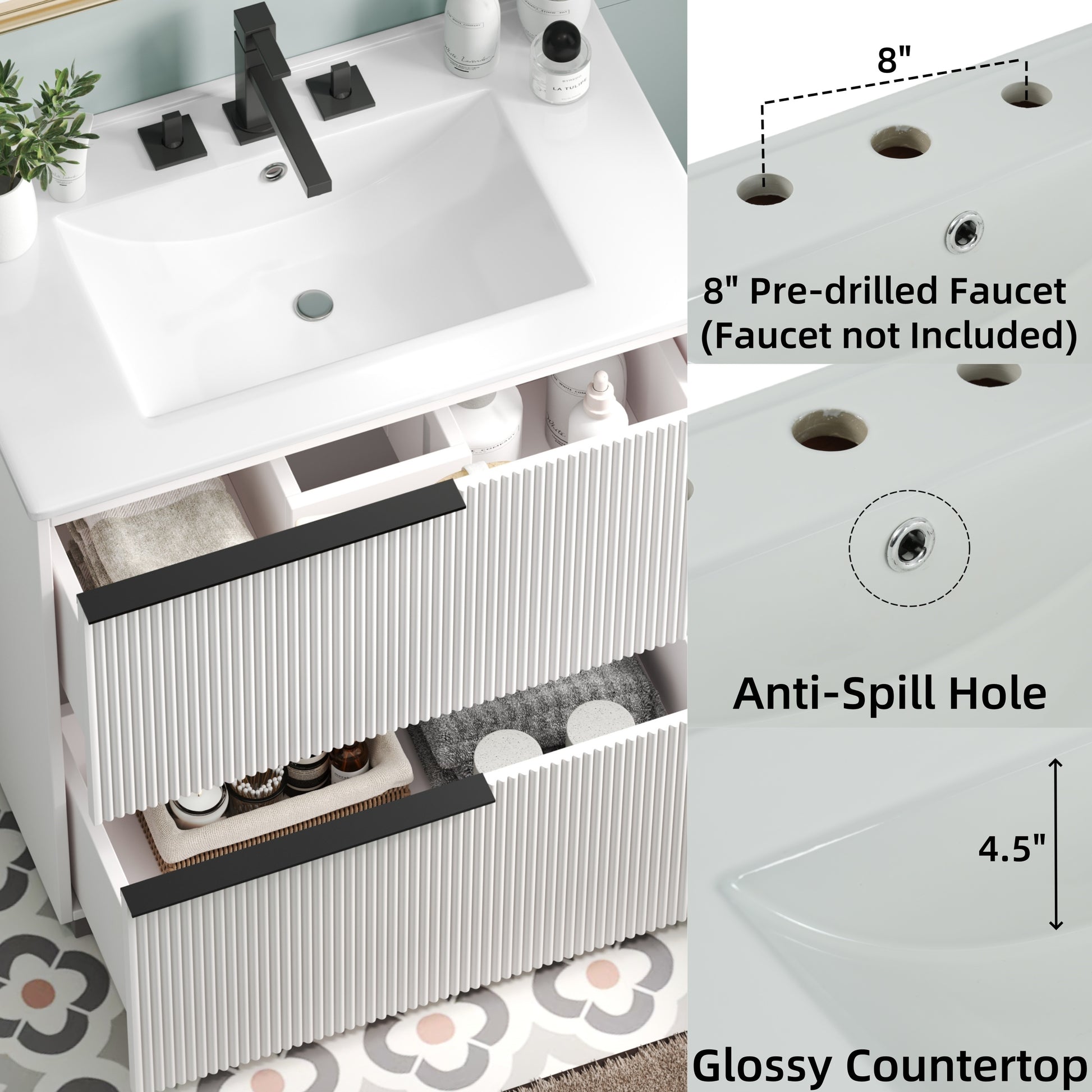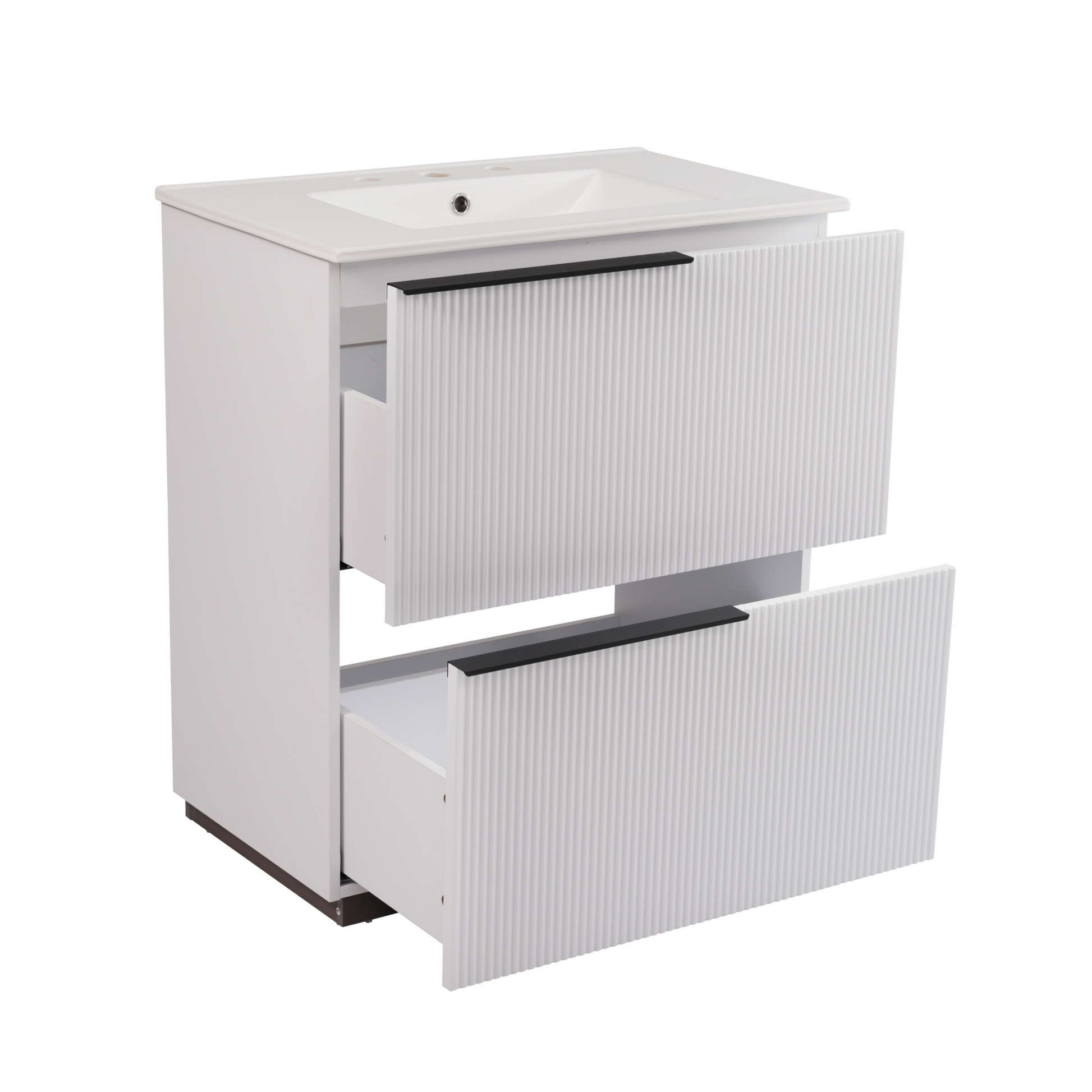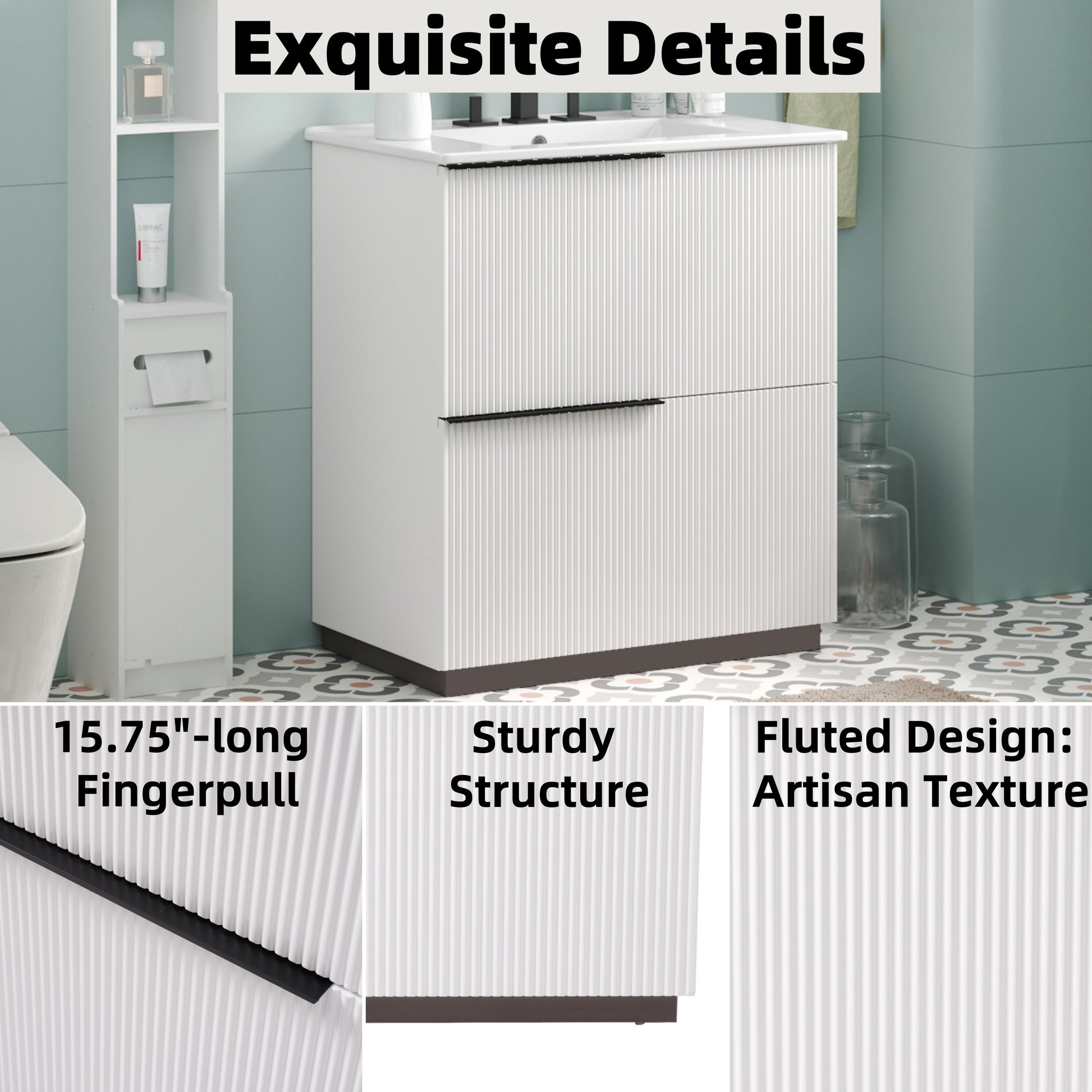30 Inch Bathroom Vanity with Ceramic Sink Full Extension Drawers Soft Close Fluted Design White