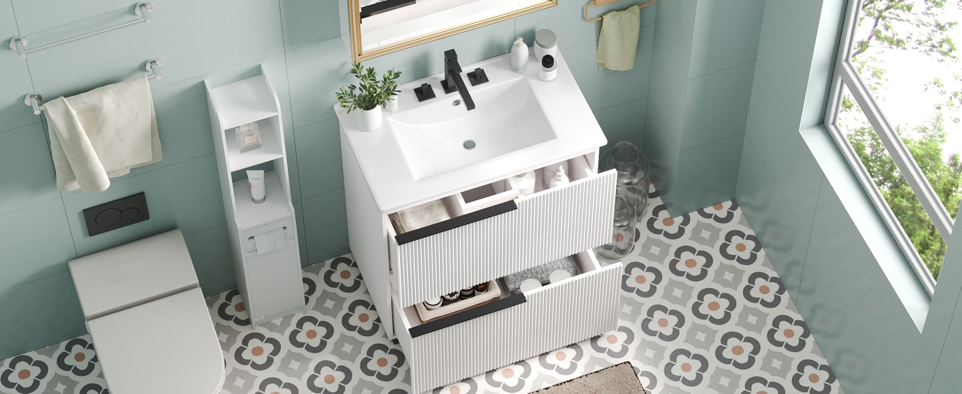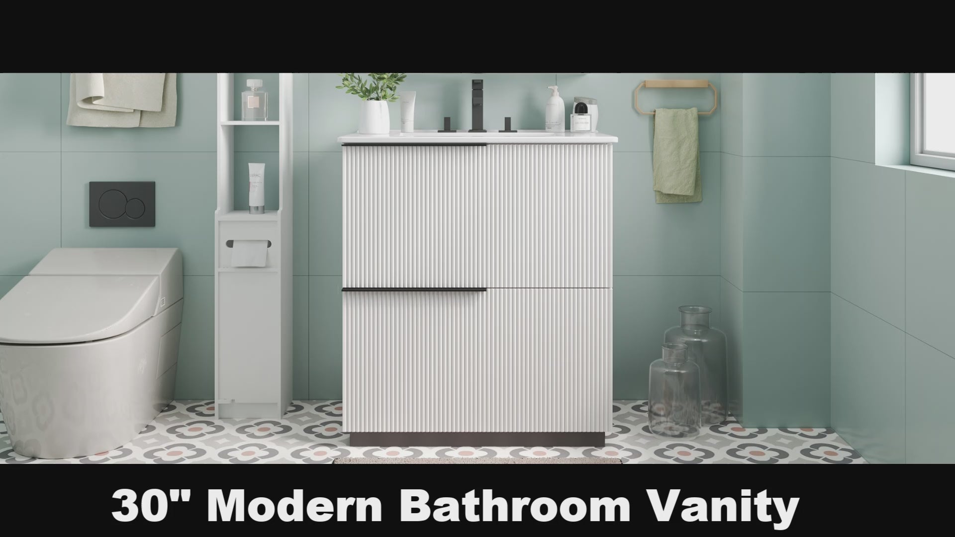 This 30-inch bathroom vanity features a premium white ceramic sink basin with a glossy, stain-resistant, and easy-to-clean surface, paired with a deep design to reduce splashing. Its soft-close undermount drawer slides maximize storage space while ensuring smooth, full-extension access and long-lasting stability. The handcrafted fluted design adds depth and sophistication, while the sleek black finger pulls enhance its minimalist, modern style. With dimensions of 30"L × 18"W × 34"H, a weight capacity of 120 lbs, and an overall weight of 103.18 lbs, this vanity blends elegance, practicality, and durability.