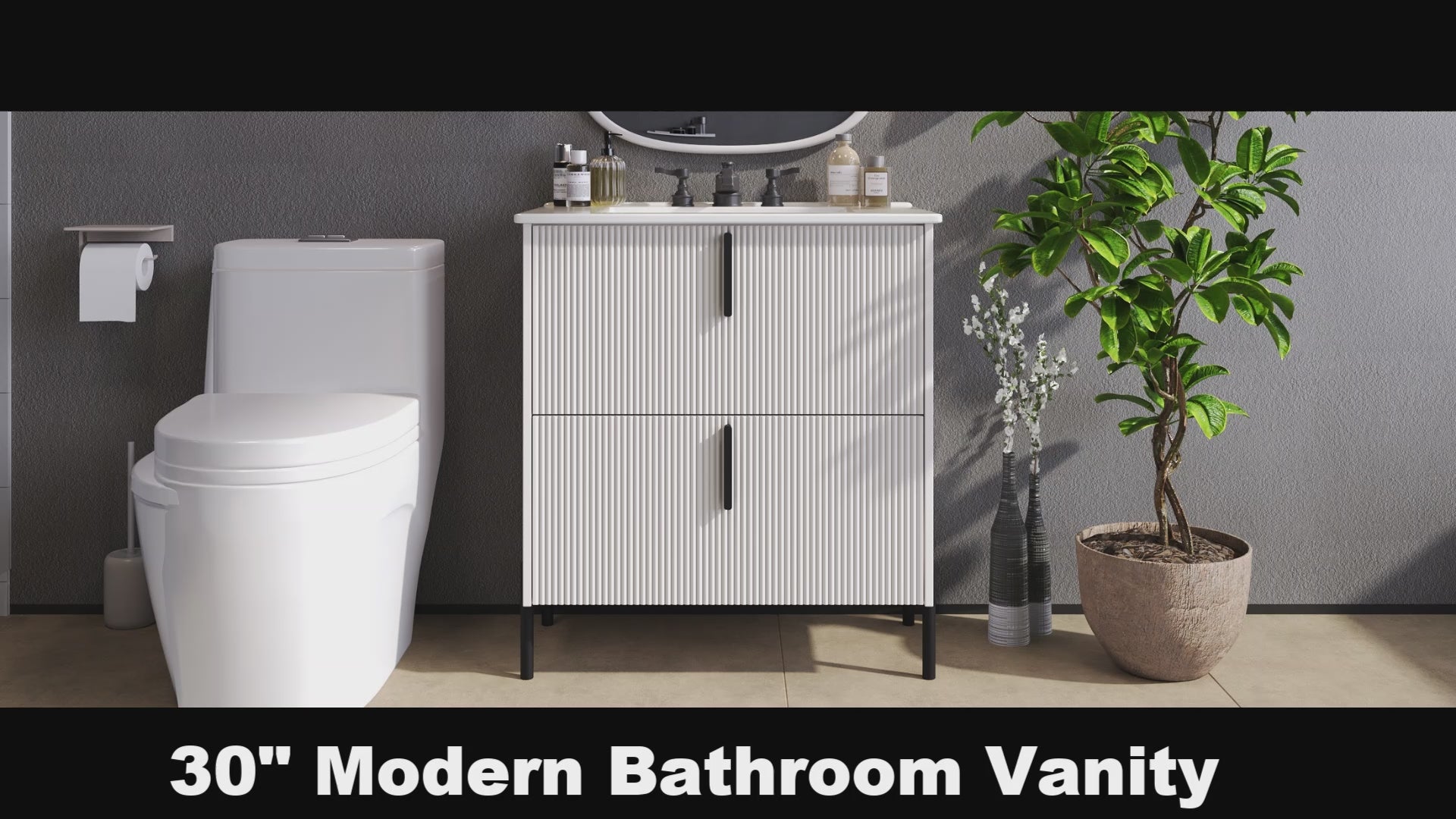 This bathroom vanity features a high-quality ceramic sink with a glossy, stain- and scratch-resistant surface that is easy to clean, along with a deep basin that prevents splashing. The soft-close undermount drawer slides create a minimalist look while maximizing storage space with full-extension access. Handcrafted fluted details add elegance, and black finger pulls enhance its modern minimalist style. With overall dimensions of 30"L × 18"W × 34"H, a total weight of 95.68 lbs, and a weight capacity of 120 lbs, it offers durability, practicality, and refined aesthetics.