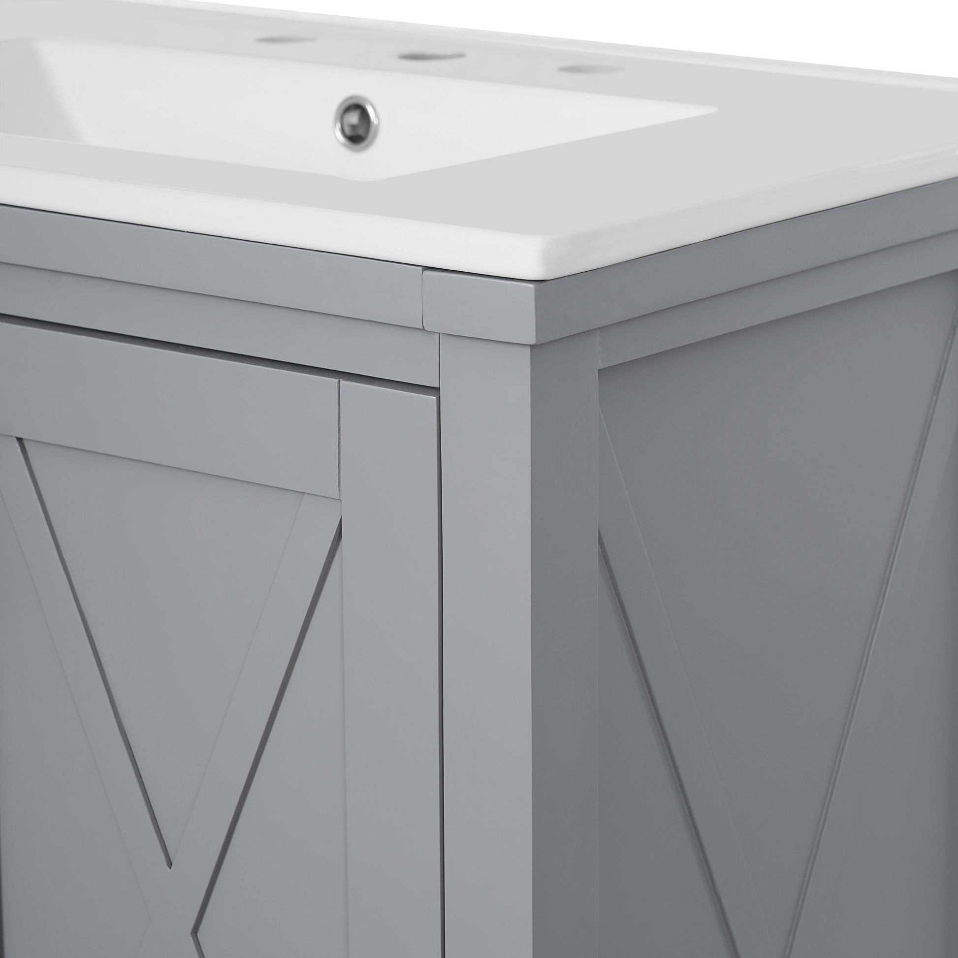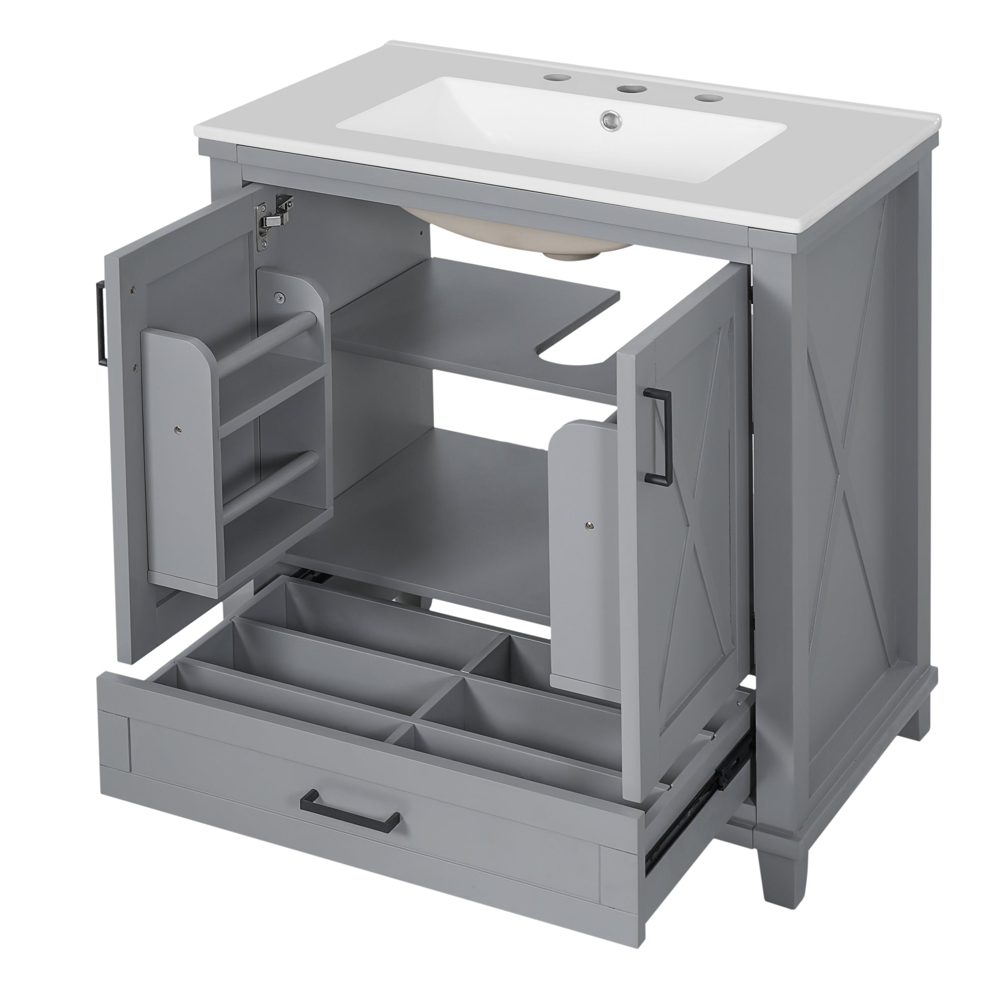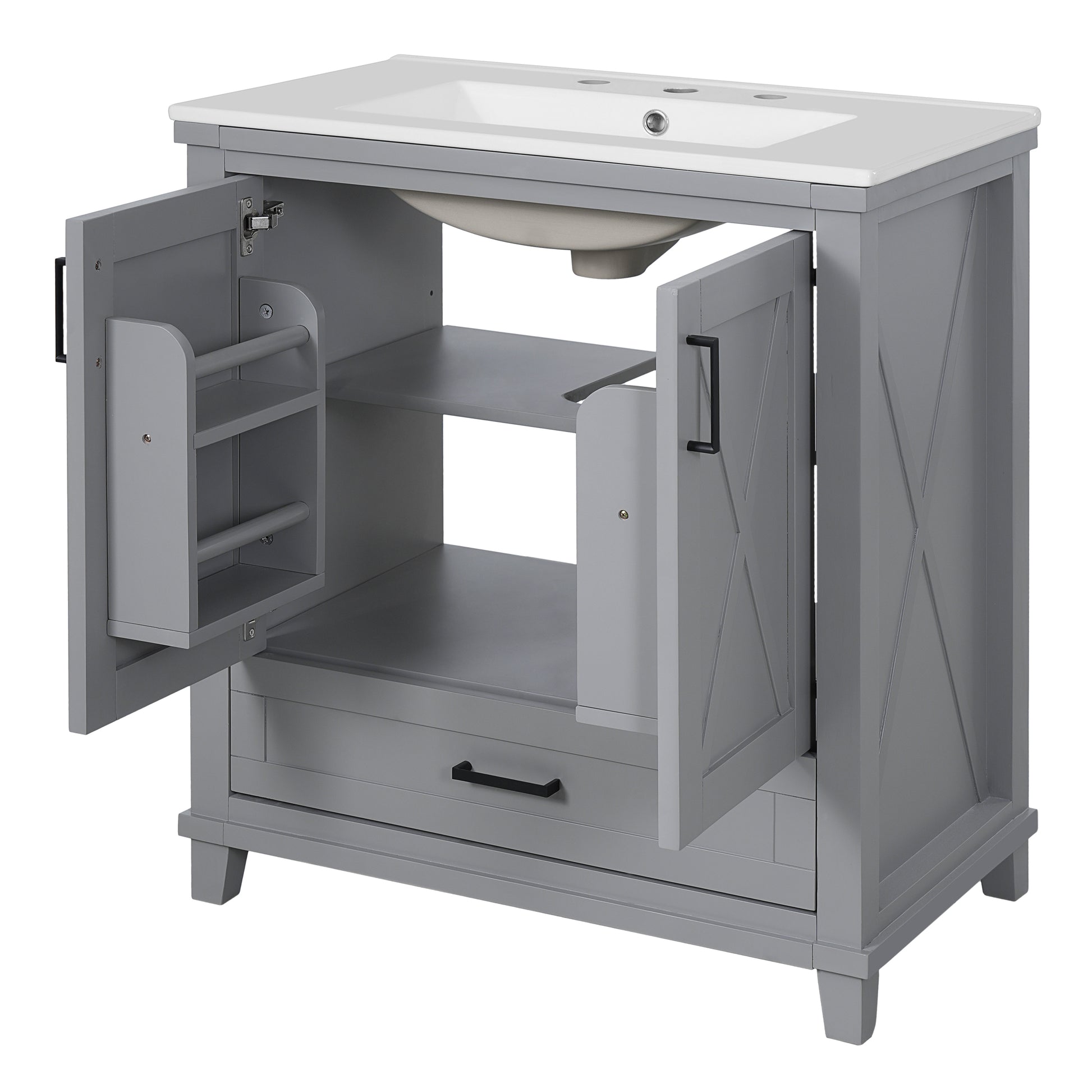 This 30-inch gray bathroom vanity combines modern design with functional storage, making it perfect for small to medium bathrooms. It features a durable ceramic sink with overflow and pre-drilled faucet holes, two soft-close doors, and a partitioned drawer for organized storage. Adjustable shelves and dual door racks provide flexible storage solutions, while the solid wood frame with MDF panels ensures stability and long-term use. Finished with zinc alloy handles and a smooth painted surface, it offers both style and practicality for your bathroom upgrade.