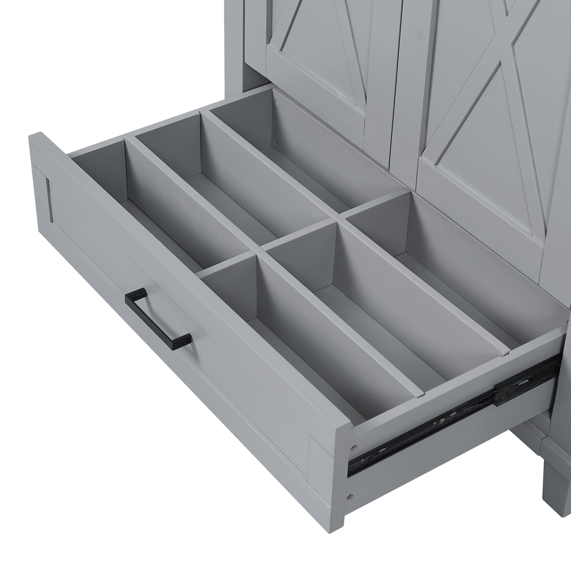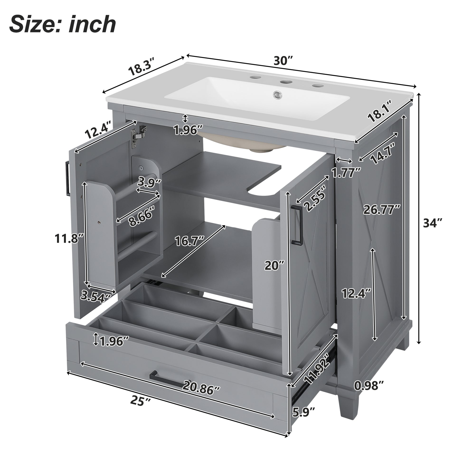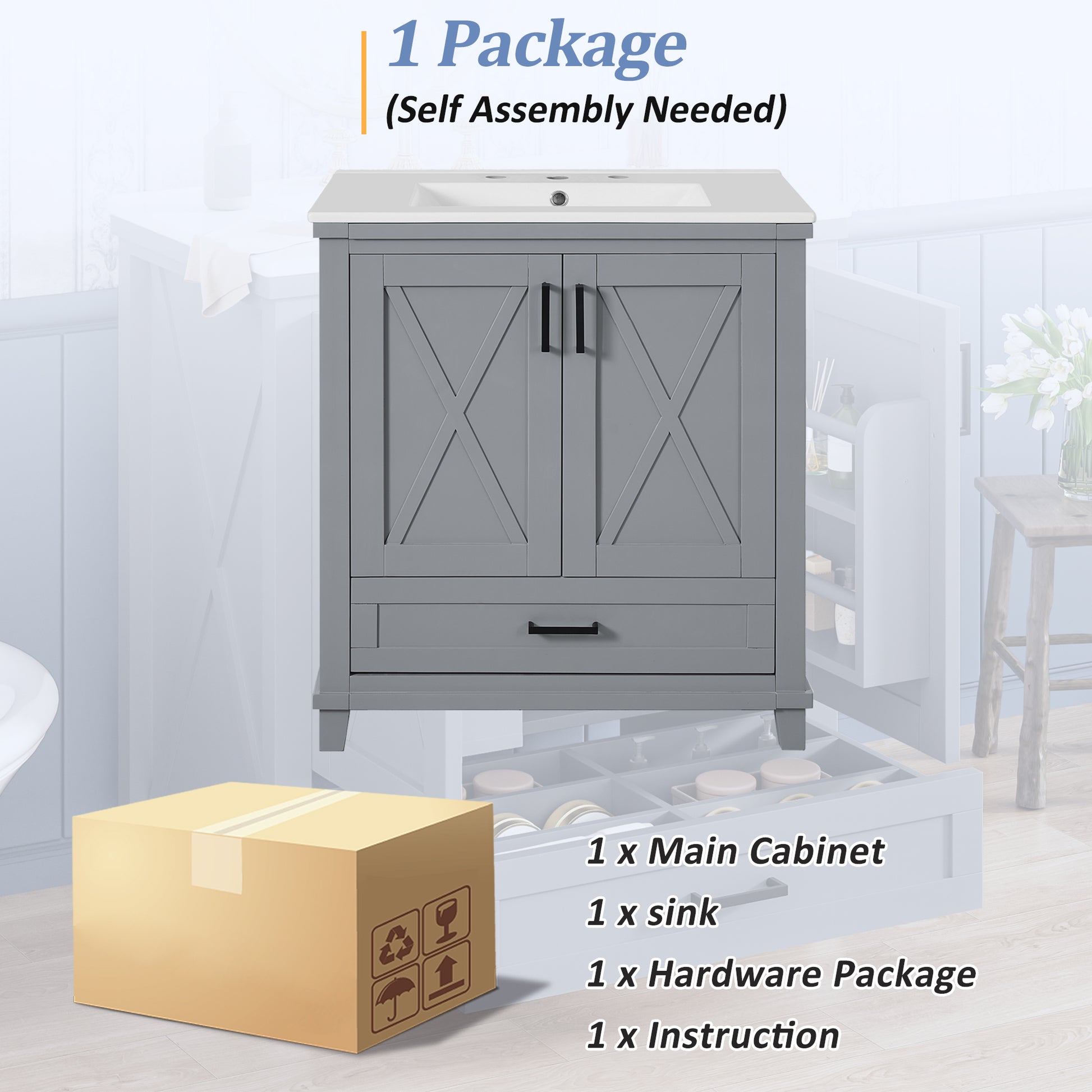 This 30-inch gray bathroom vanity combines modern design with functional storage, making it perfect for small to medium bathrooms. It features a durable ceramic sink with overflow and pre-drilled faucet holes, two soft-close doors, and a partitioned drawer for organized storage. Adjustable shelves and dual door racks provide flexible storage solutions, while the solid wood frame with MDF panels ensures stability and long-term use. Finished with zinc alloy handles and a smooth painted surface, it offers both style and practicality for your bathroom upgrade.