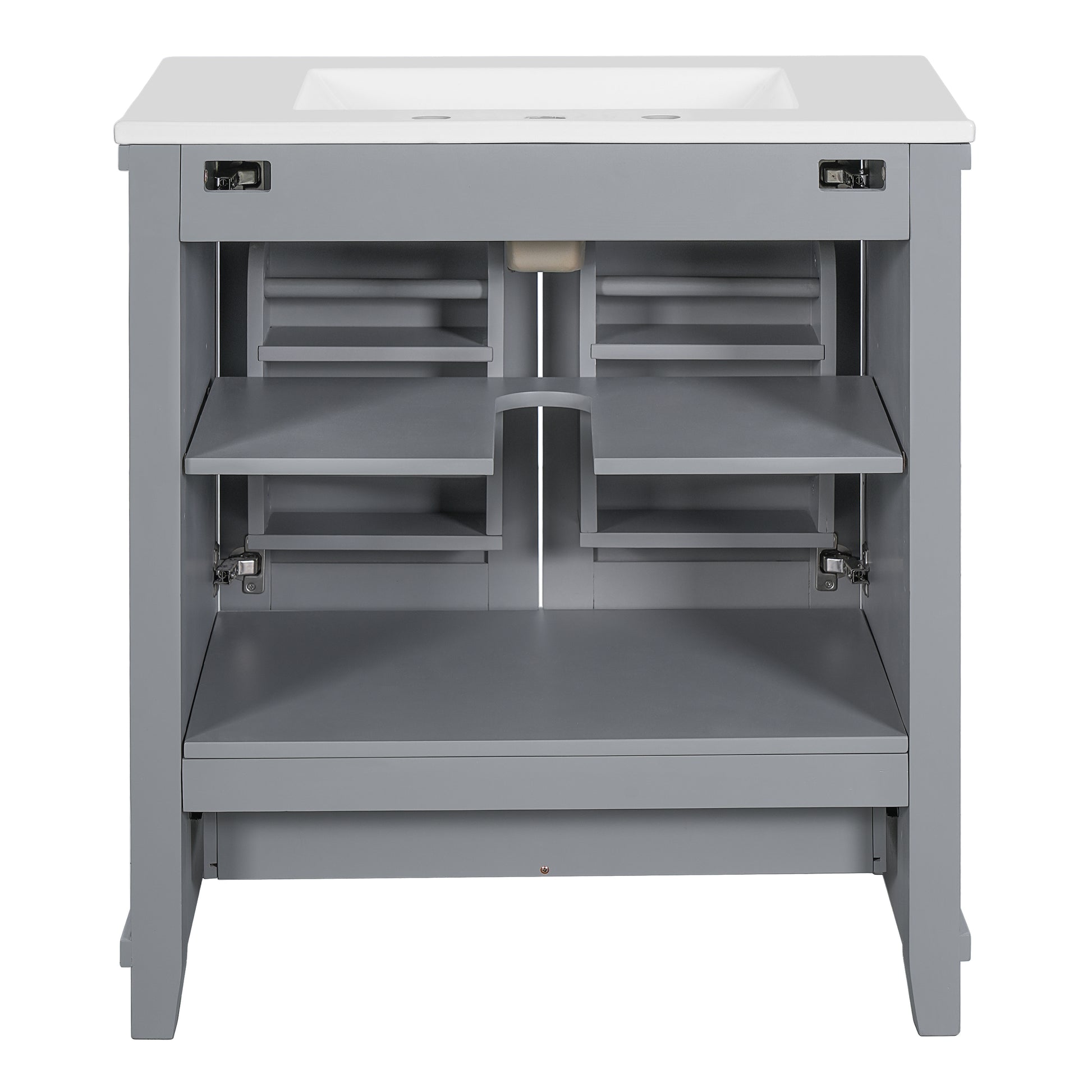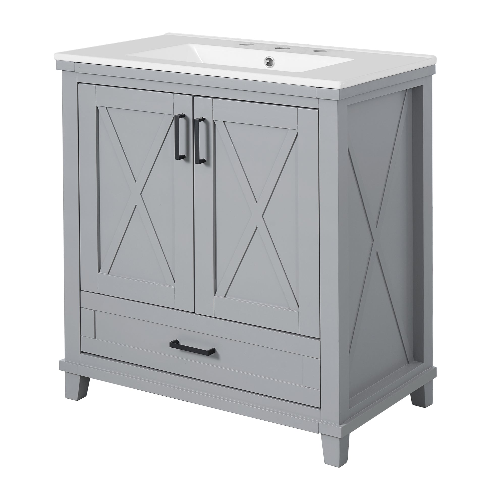 30 Inch Gray Bathroom Vanity with Ceramic Sink Solid Wood Frame MDF 2 Soft Close Doors 1 Drawer Dual Storage Shelves