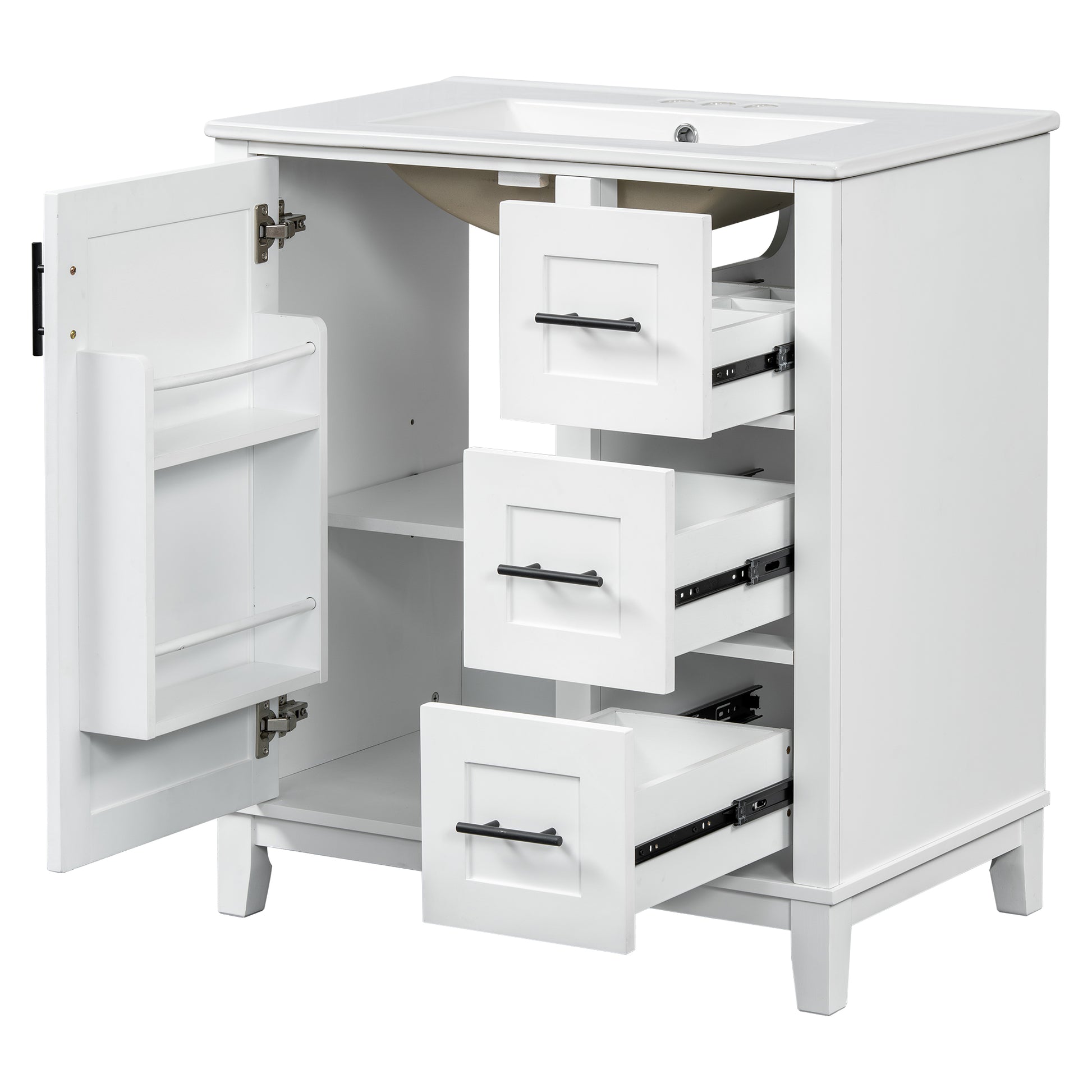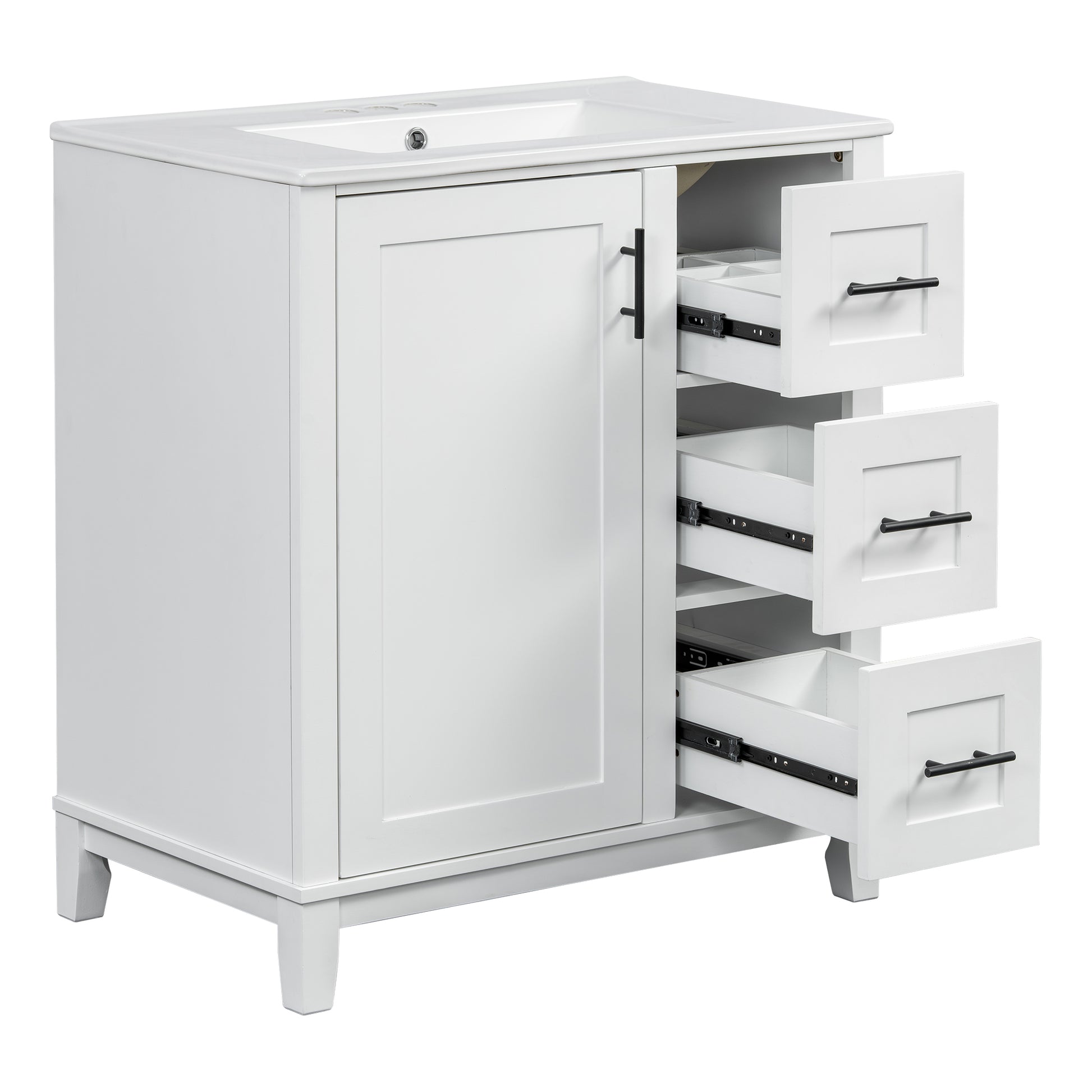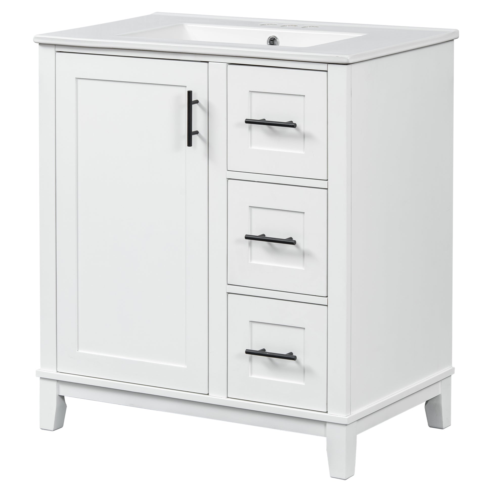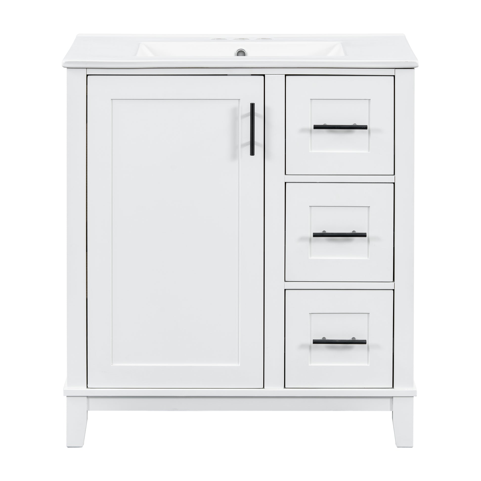 This 30-inch modern bathroom vanity combines a solid rubberwood frame with MDF panels, offering durability and moisture resistance, making it ideal for compact to mid-sized bathrooms. The premium ceramic sink features a smooth, stain-resistant surface with an overflow hole and pre-drilled faucet holes for easy installation and maintenance. The cabinet includes a soft-close door, three drawers (one with built-in dividers), and an adjustable U-shaped shelf for flexible storage. With a minimalist design and multi-layer painted finish, it enhances your bathroom’s style while ensuring long-lasting performance.