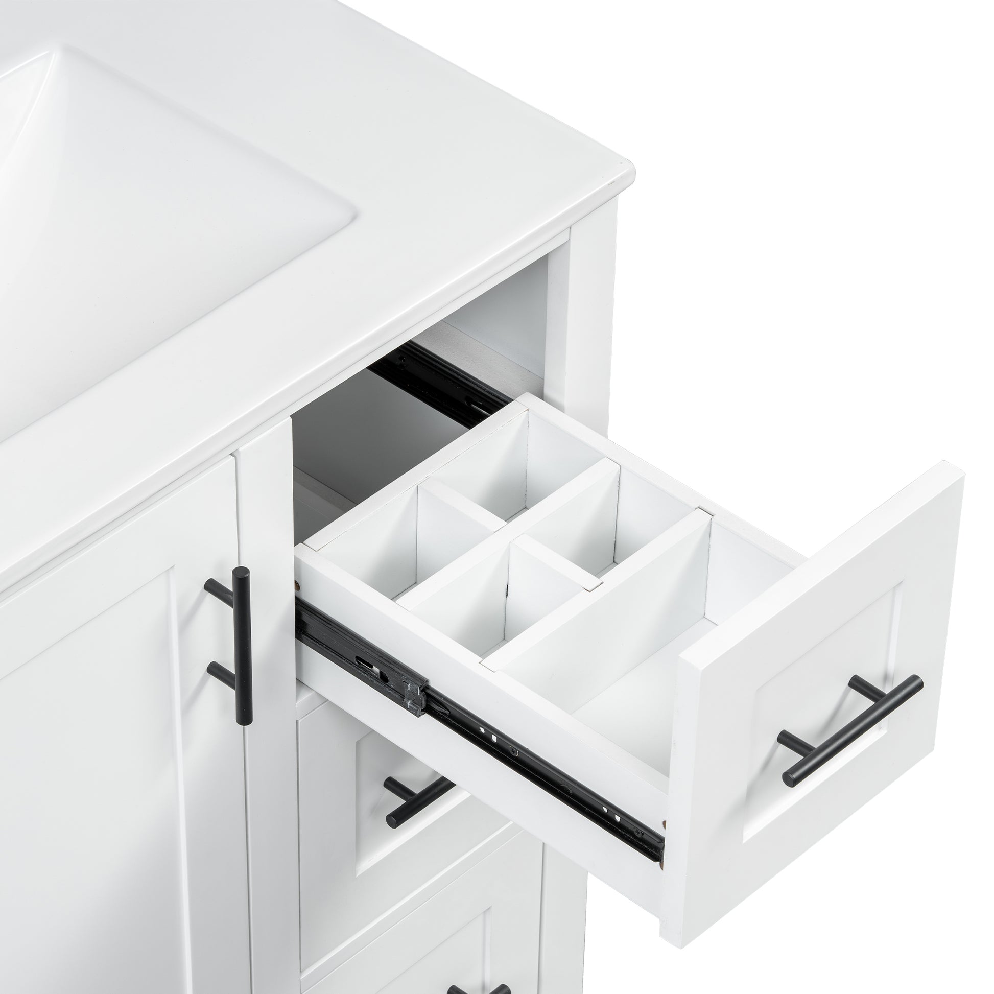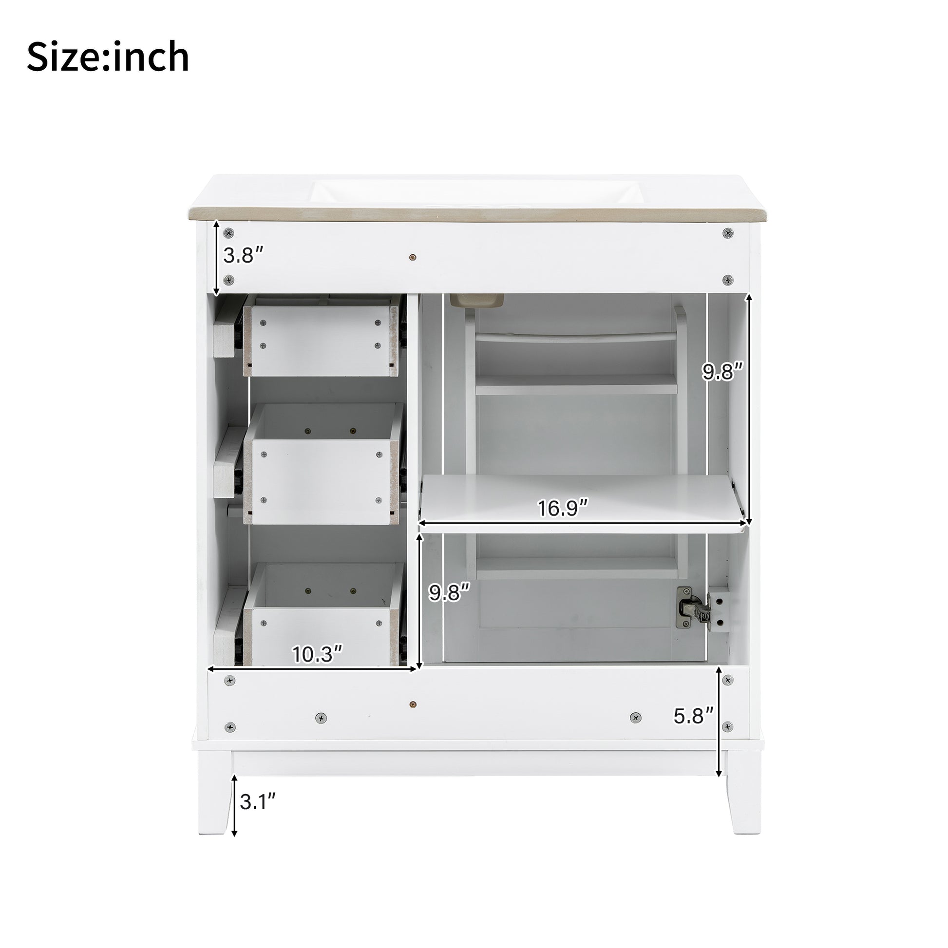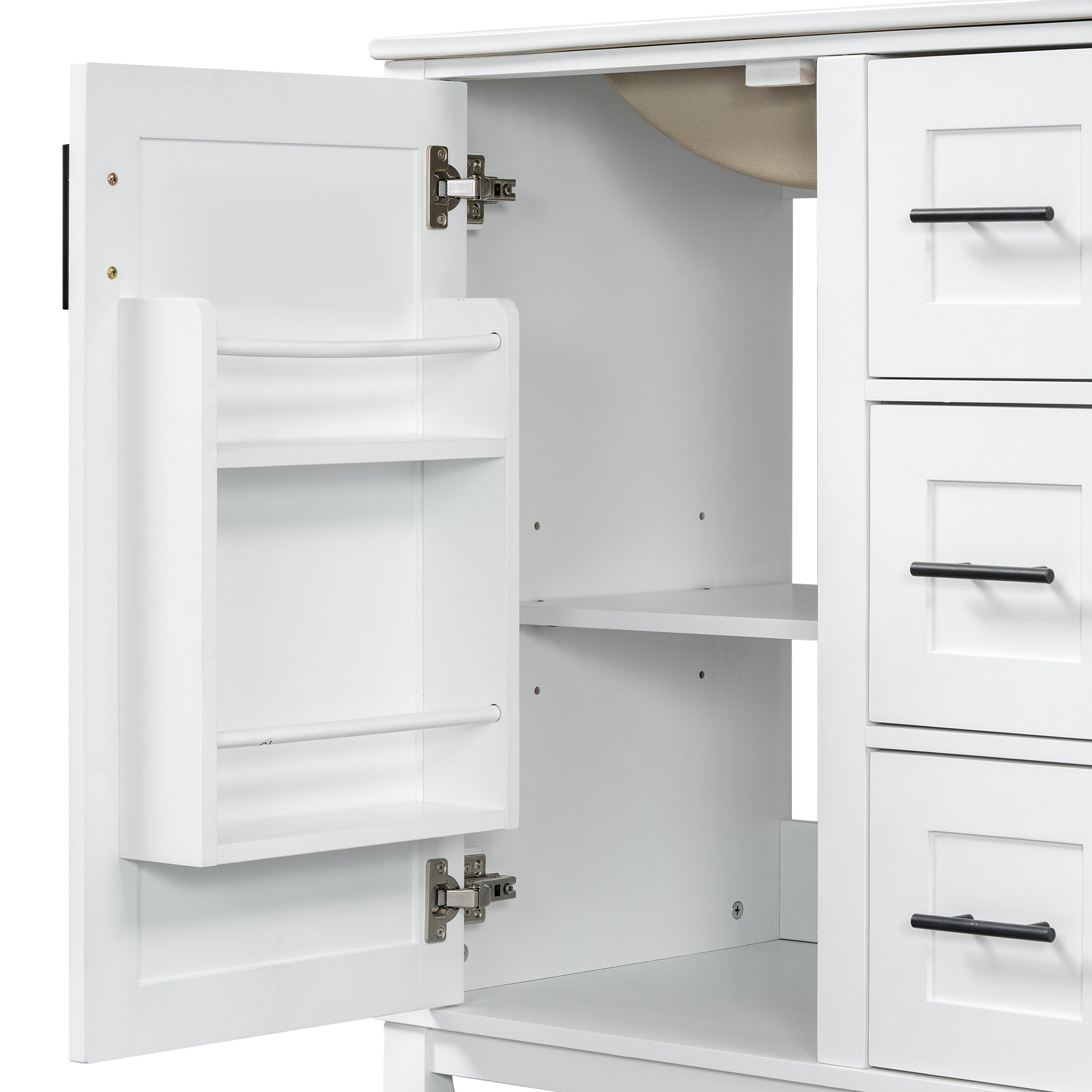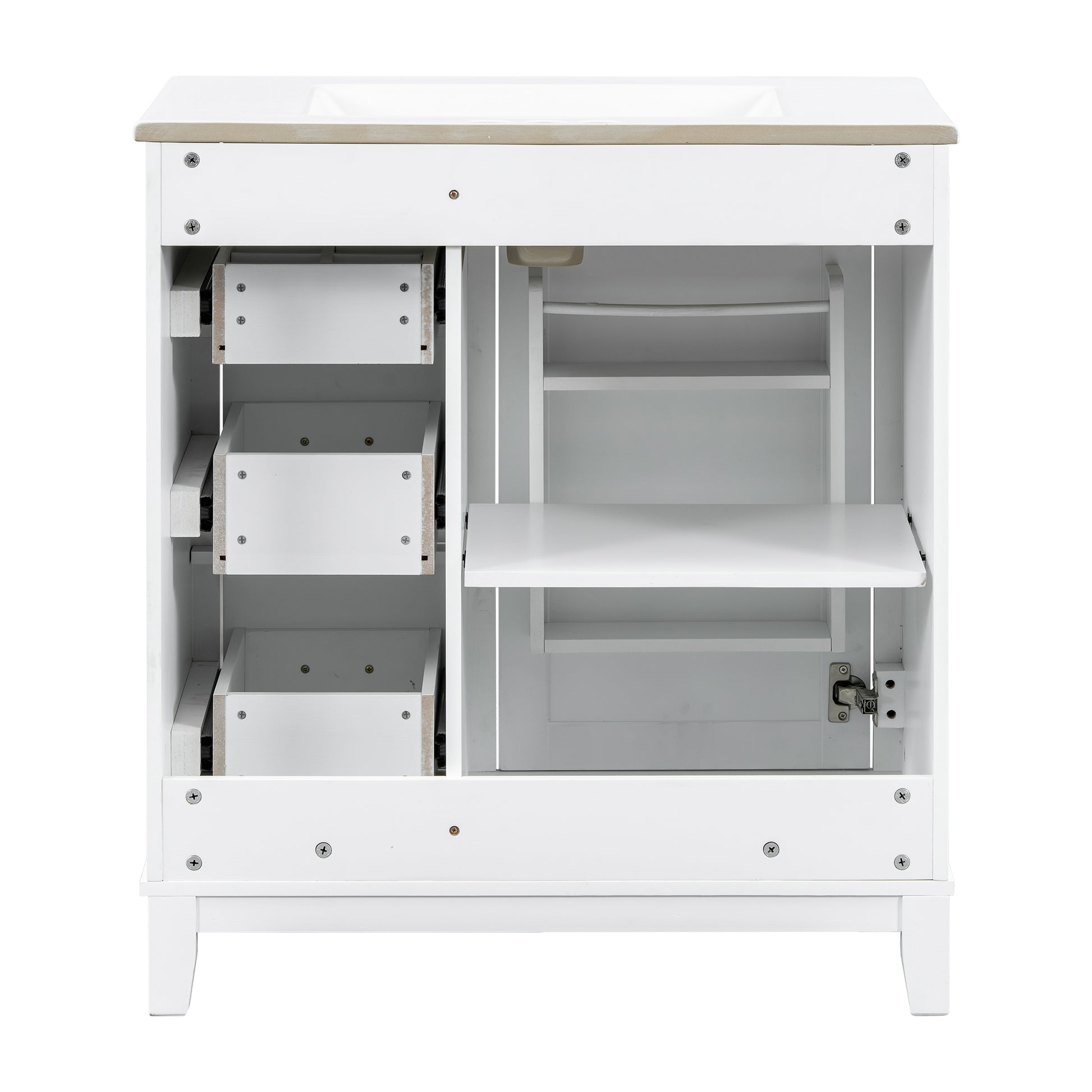 This 30-inch modern bathroom vanity combines a solid rubberwood frame with MDF panels, offering durability and moisture resistance, making it ideal for compact to mid-sized bathrooms. The premium ceramic sink features a smooth, stain-resistant surface with an overflow hole and pre-drilled faucet holes for easy installation and maintenance. The cabinet includes a soft-close door, three drawers (one with built-in dividers), and an adjustable U-shaped shelf for flexible storage. With a minimalist design and multi-layer painted finish, it enhances your bathroom’s style while ensuring long-lasting performance.