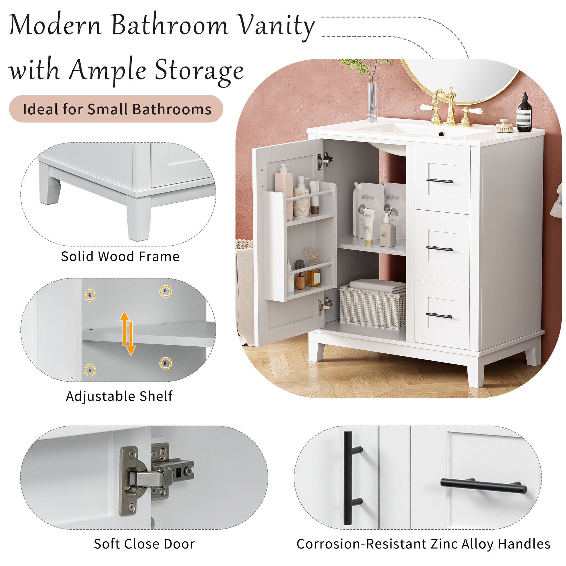 30 Inch Modern Bathroom Vanity with Ceramic Sink Solid Wood Frame and Soft Close Storage