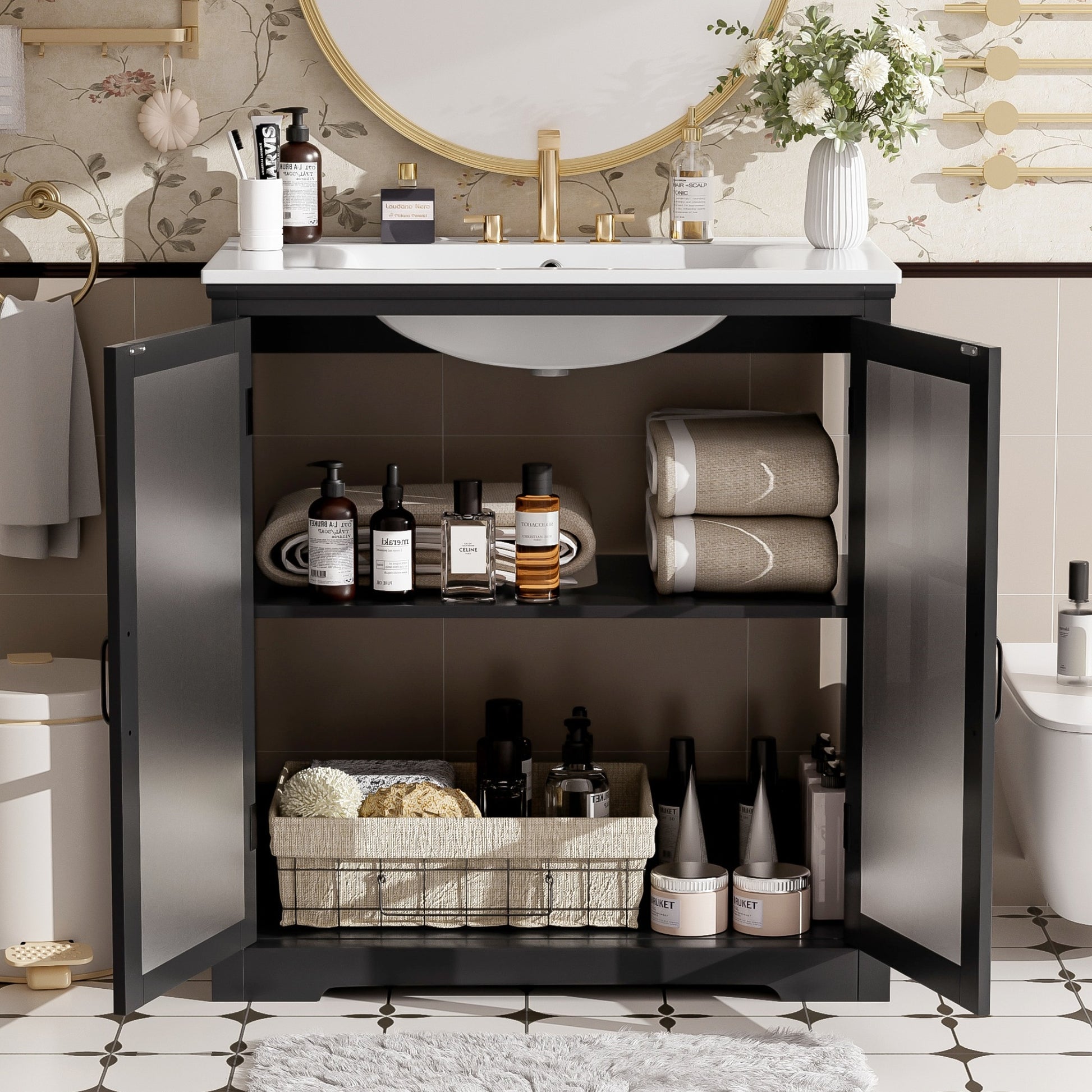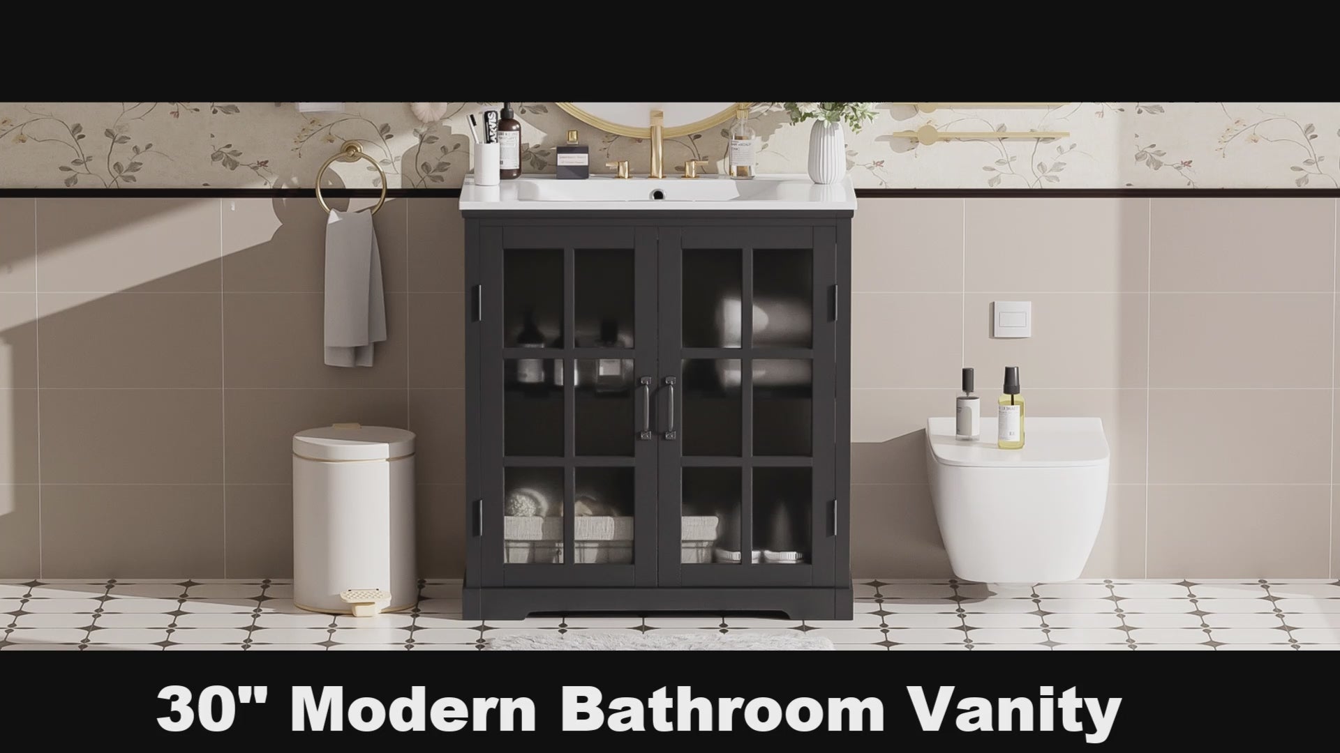 30 Inch vanity with glossy ceramic sink matte black handles and tempered glass doors for a stylish contrast