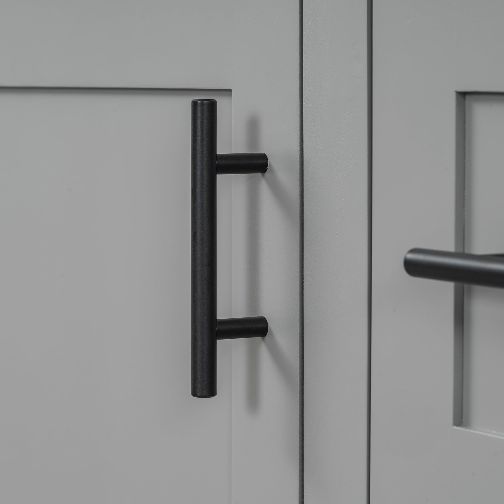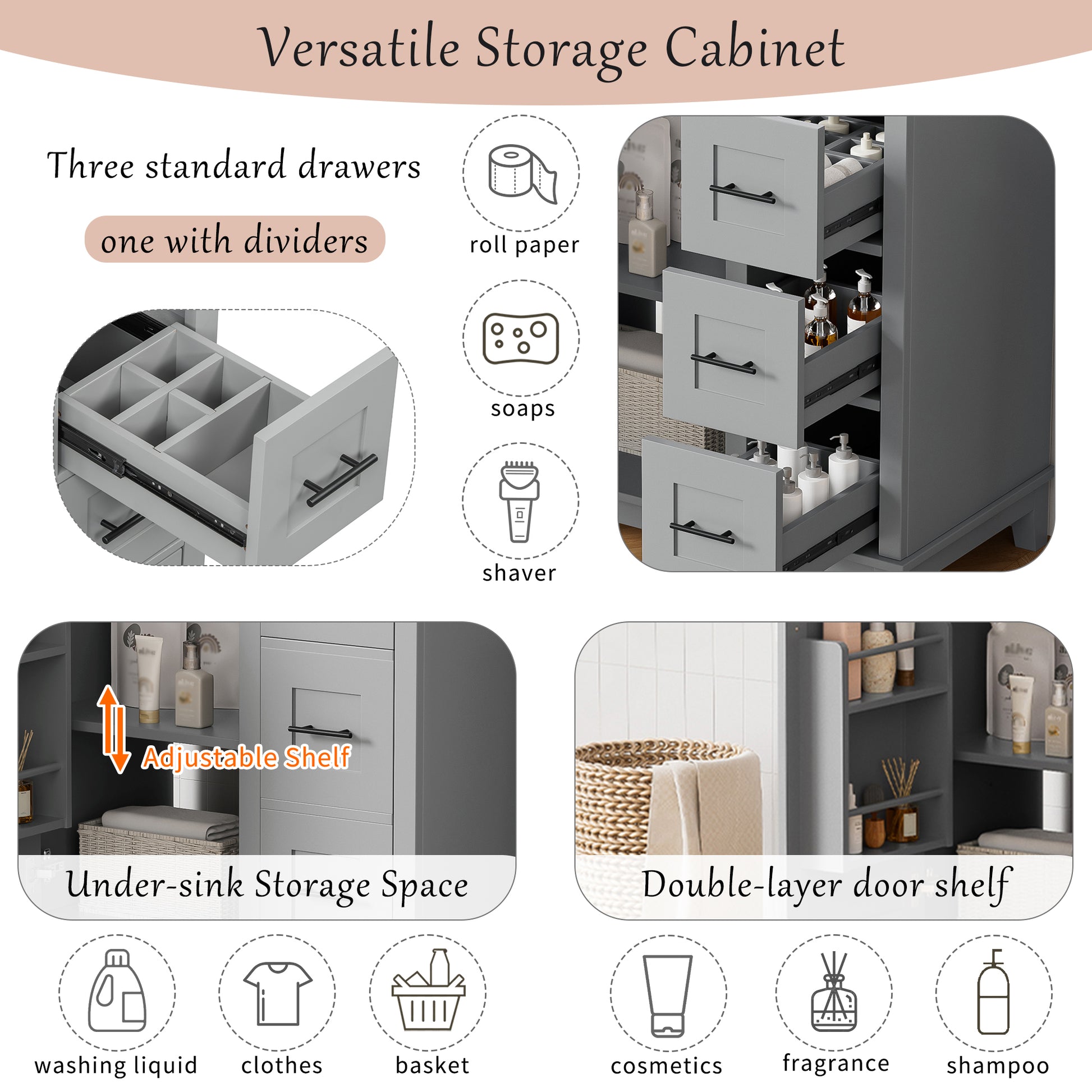 This 30-inch modern bathroom vanity combines a solid rubberwood frame with MDF panels, delivering durability and resistance to moisture and warping. Ideal for compact to medium-sized bathrooms, guest baths, or apartments, it features a premium ceramic sink with a smooth, stain-resistant surface, overflow hole, and three pre-drilled faucet holes for easy installation. The cabinet offers a soft-close door, three drawers (one with built-in dividers), and an adjustable U-shaped shelf to accommodate plumbing while providing versatile storage for toiletries, cleaning tools, and towels. Its sleek grey finish and multi-layer painted coating ensure both long-lasting performance and contemporary elegance.